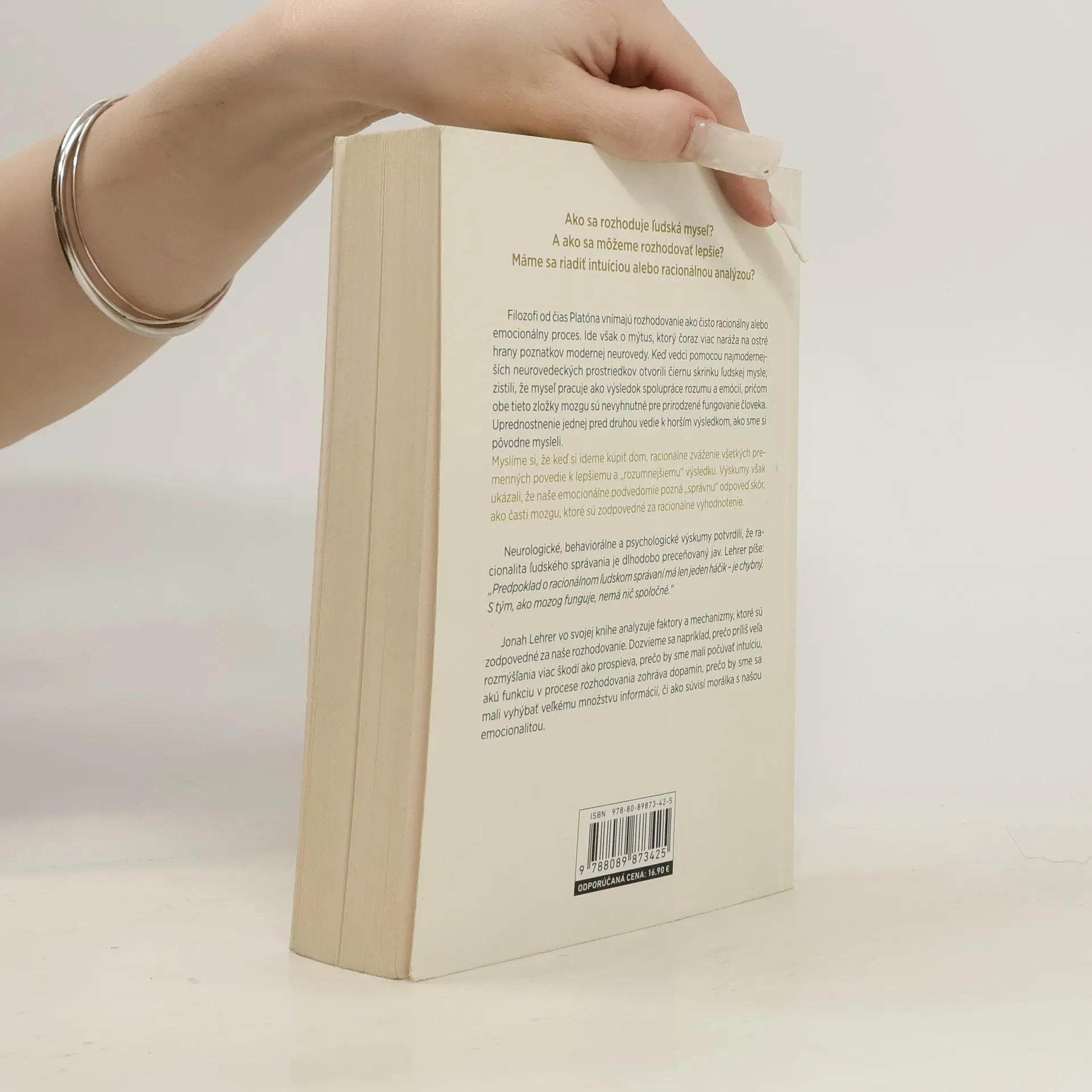 Ako sa rozhoduje ľudská myseľ a ako môžeme zlepšiť naše rozhodovanie? Dlhodobo sa považovalo, že rozhodovanie je buď racionálne, alebo emocionálne. Moderné neurovedy však odhaľujú, že myseľ funguje na základe spolupráce rozumu a emócií, pričom obidve zložky sú nevyhnutné pre zdravé fungovanie. Uprednostnenie jednej z nich vedie k horším výsledkom, než sme si mysleli. Napríklad pri kúpe domu si často myslíme, že racionálne zváženie všetkých premenných prinesie lepší výsledok. Avšak výskumy ukazujú, že naše emocionálne podvedomie pozná „správnu“ odpoveď skôr než racionálne časti mozgu. Neurologické a psychologické štúdie potvrdzujú, že racionalita správania je preceňovaná. Autor analyzuje faktory a mechanizmy rozhodovania, objasňuje, prečo nadmerné premýšľanie môže byť škodlivé, prečo je dôležité počúvať intuíciu, akú úlohu zohráva dopamín a prečo je lepšie vyhýbať sa preplneným informáciám. Taktiež skúma spojenie medzi morálkou a emocionalitou, čím ponúka nové pohľady na proces rozhodovania.