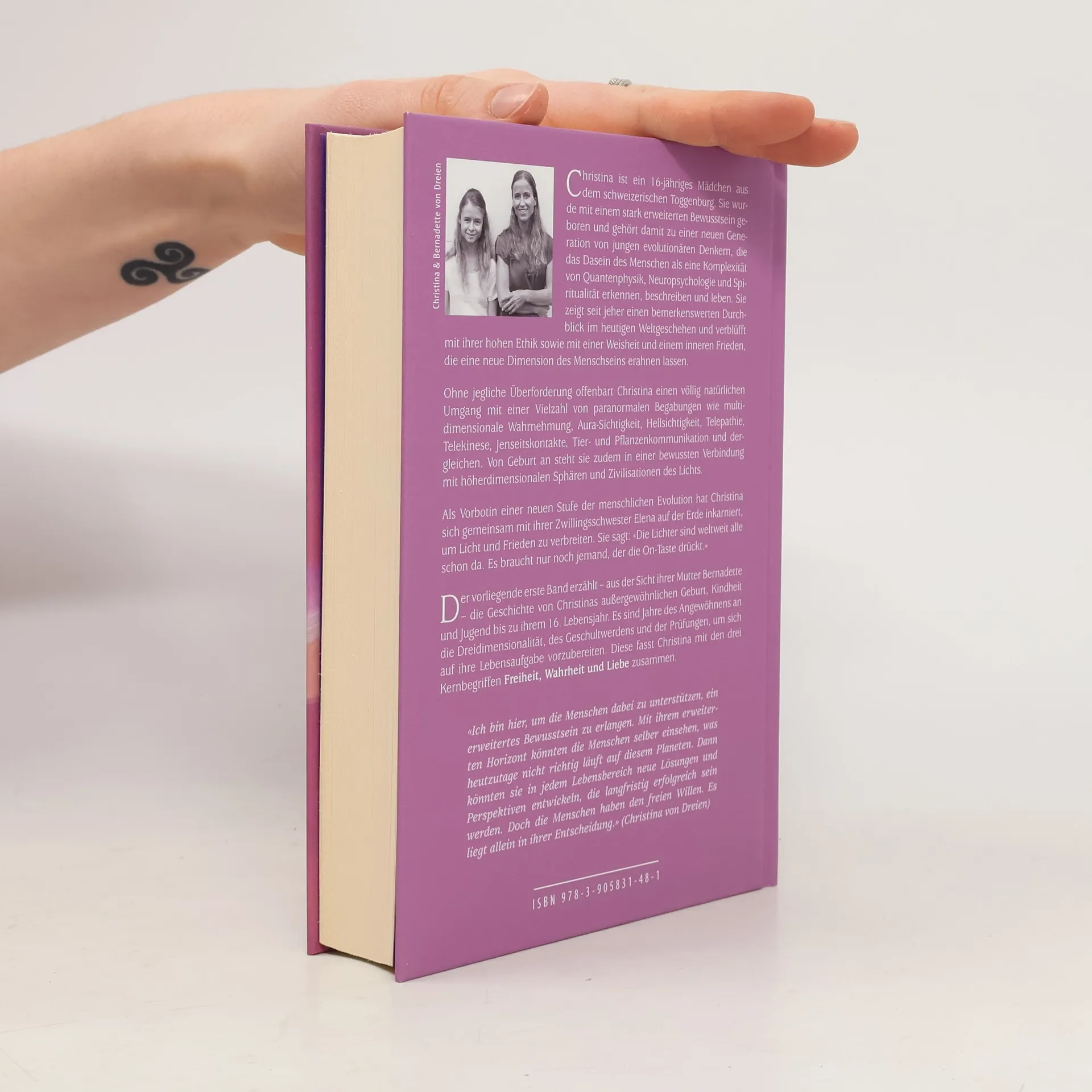 Christina ist ein 16-jähriges Mädchen aus dem Toggenburg, das mit einem stark erweiterten Bewusstsein geboren wurde. Sie gehört zu einer neuen Generation von jungen Denkern, die das menschliche Dasein als eine Komplexität aus Quantenphysik, Neuropsychologie und Spiritualität erkennen. Christina beeindruckt mit ihrer hohen Ethik, Weisheit und einem inneren Frieden, der eine neue Dimension des Menschseins erahnen lässt. Sie zeigt einen natürlichen Umgang mit paranormalen Fähigkeiten wie multidimensionaler Wahrnehmung, Aura-Sichtigkeit, Hellsichtigkeit, Telepathie und Tierkommunikation. Von Geburt an ist sie in bewusster Verbindung mit höheren Dimensionen und Zivilisationen des Lichts. Gemeinsam mit ihrer Zwillingsschwester Elena ist sie auf der Erde inkarniert, um Licht und Frieden zu verbreiten. Band 1 erzählt aus der Sicht ihrer Mutter Bernadette von Christinas außergewöhnlicher Geburt, Kindheit und Jugend bis zu ihrem 16. Lebensjahr. Diese Jahre sind geprägt von der Anpassung an die Dreidimensionalität und der Vorbereitung auf ihre Lebensaufgabe, die sie mit den Begriffen Freiheit, Wahrheit und Liebe zusammenfasst. Christina möchte den Menschen helfen, ein erweitertes Bewusstsein zu erlangen, um neue Lösungen für die Herausforderungen der Welt zu finden. Doch letztlich liegt die Entscheidung im freien Willen der Menschen.