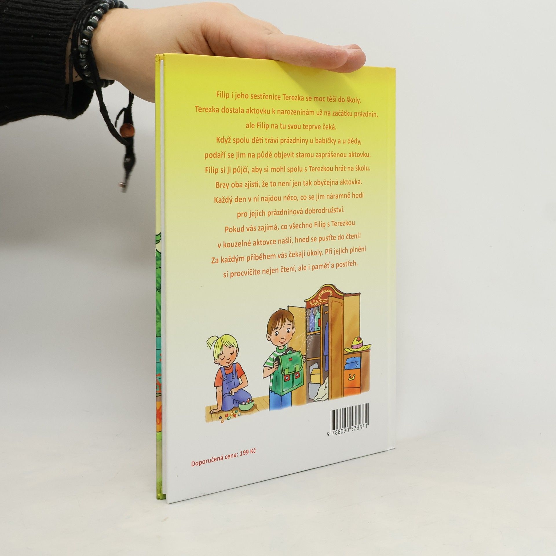 Filip i jeho sestřenice Terezka se moc těší do školy. Terezka dostala aktovku k narozeninám už na začátku prázdnin, ale Filip na tu svou teprve čeká. Když spolu děti tráví prázdniny u babičky a u dědy, podaří se jim na půdě objevit starou zaprášenou aktovku. Filip si ji půjčí, aby si mohl spolu s Terezkou hrát na školu. Brzy oba zjistí, že to není jen tak obyčejná aktovka. Každý den v ní najdou něco, co se jim náramně hodí pro jejich prázdninová dobrodružství. Pokud vás zajímá, co všechno Filip s Terezkou v kouzelné aktovce našli, hned se pusťte do čtení! Za každým příběhem na vás čekají úkoly. Při jejich plnění si procvičíte nejen čtení, ale i paměť a postřeh.