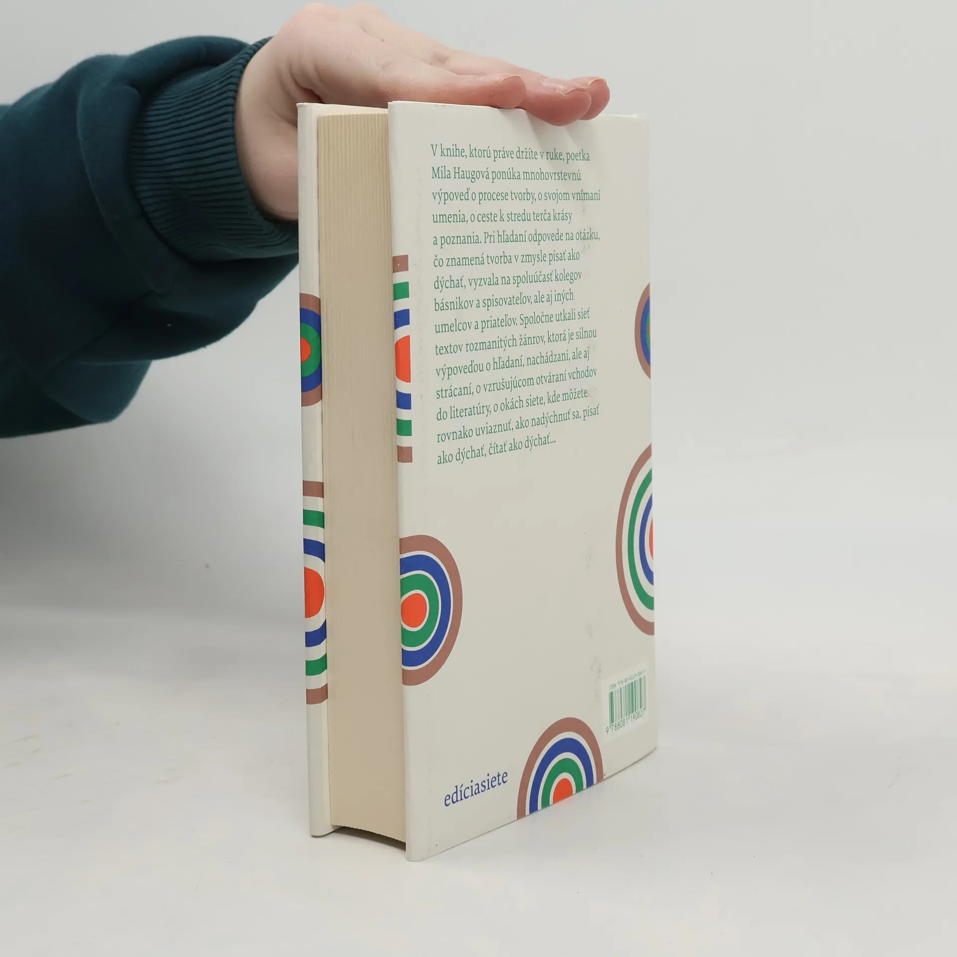Poetka Mila Haugová ponúka mnohovrstevnú výpoveď o procese tvorby, o svojom vnímaní umenia, o ceste k stredu terča krásy a poznania. Pri hľadaní odpovede na otázku, čo znamená tvorba v zmysle písať ako dýchať, vyzvala na spoluúčasť kolegov básnikov a spisovateľov, ale aj iných umelcov a priateľov. Spoločne utkali sieť textov rozmanitých žánrov, ktorá je silnou výpoveďou o hľadaní, nachádzaní, ale aj strácaní, o vzrušujúcom otváraní vchodov do literatúry, o okách siete, kde môžete rovnako uviaznuť, ako nadýchnuť sa, písať ako dýchať, čítať ako dýchať...
