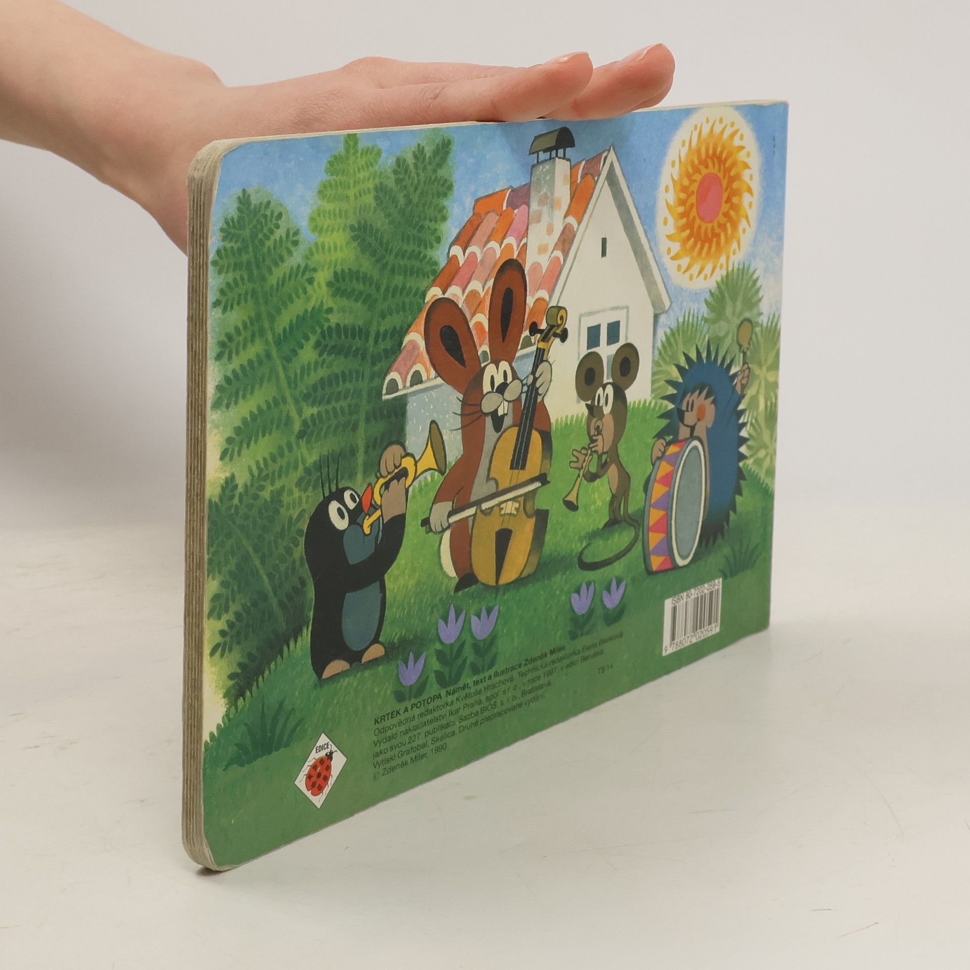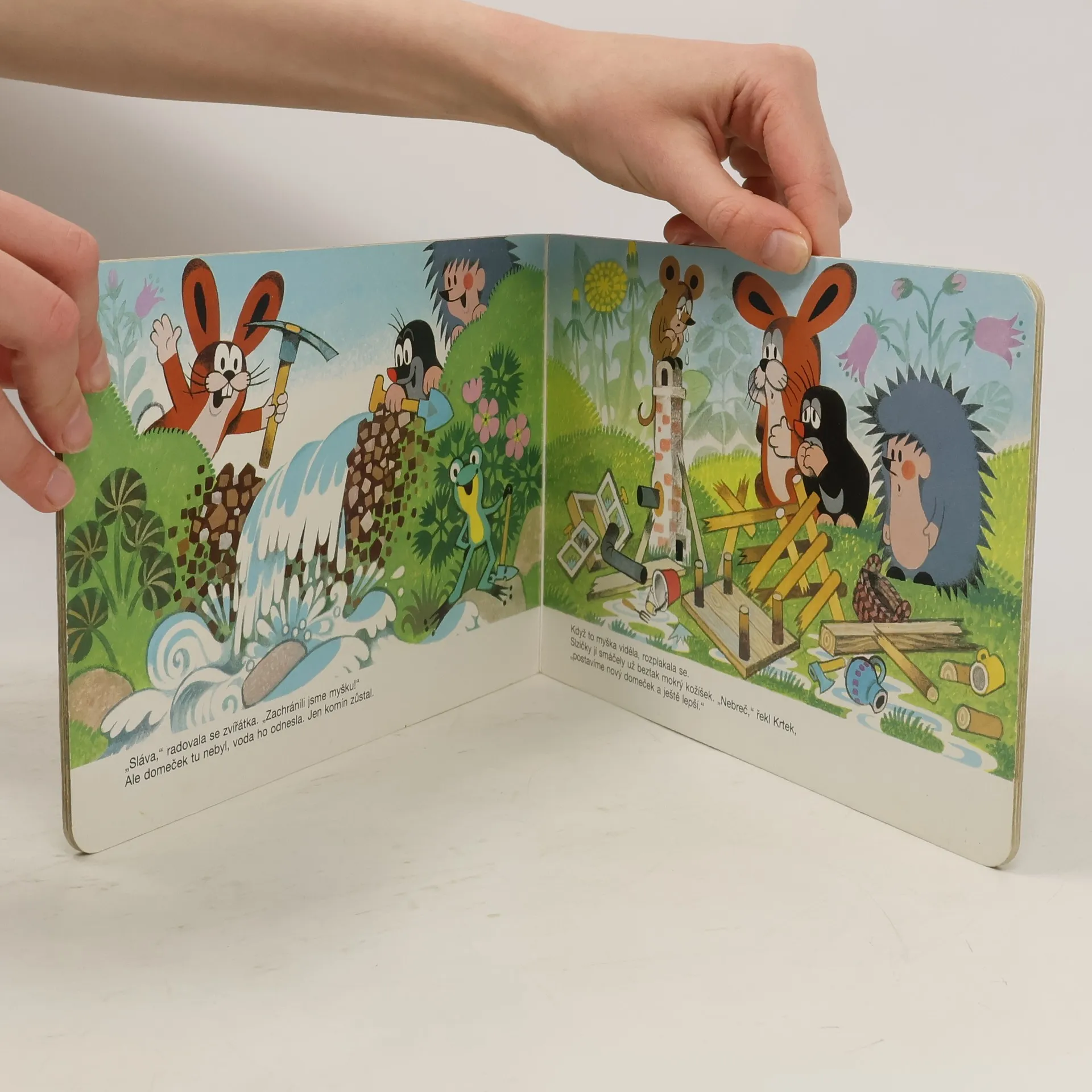 Leporelo pro děti s půvabnými ilustracemi Zdeňka Milera o krtkovi a jeho přátelích. Tento příběh vypráví o tom, jak krtek s ježkem a zajíčkem pomohli myšce přestát potopu, zachránili ji a ještě postavili nový domeček. Inu, kamarádi jak se patří.