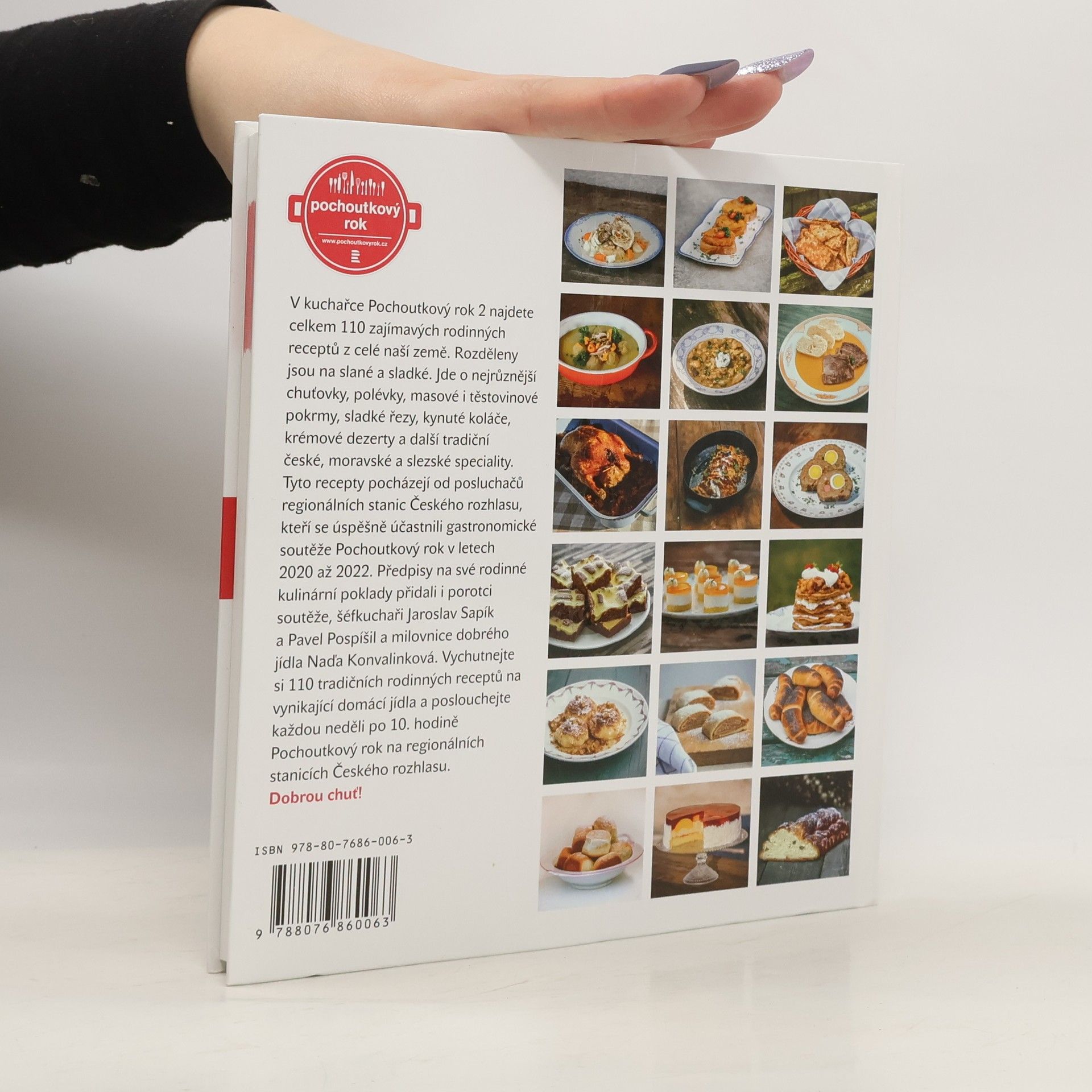 101 tradičních rodinných receptů na vynikající domácí jídla.V kuchařce Pochoutkový rok 2 najdete celkem 110 zajímavých rodinných receptů z celé naší země. Rozděleny jsou na slané a sladké. Jde o nejrůznější chuťovky, polévky, masové i těstovinové pokrmy, sladké řezy, kynuté koláče, krémové dezerty a další tradiční české, moravské a slezské speciality. Tyto recepty pocházejí od posluchačů regionálních stanic Českého rozhlasu, kteří se úspěšně účastnili gastronomické soutěže Pochoutkový rok v letech 2020 až 2022. Předpisy na své rodinné kulinární poklady přidali i porotci soutěže, šéfkuchaři Jaroslav Sapík a Pavel Pospíšil a milovnice dobrého jídla herečka Naďa Konvalinková. Vychutnejte si 110 tradičních rodinných receptů na vynikající domácí jídla a poslouchejte každou neděli po 10. hodině Pochoutkový rok na regionálních stanicích Českého rozhlasu. Dobrou chuť!
