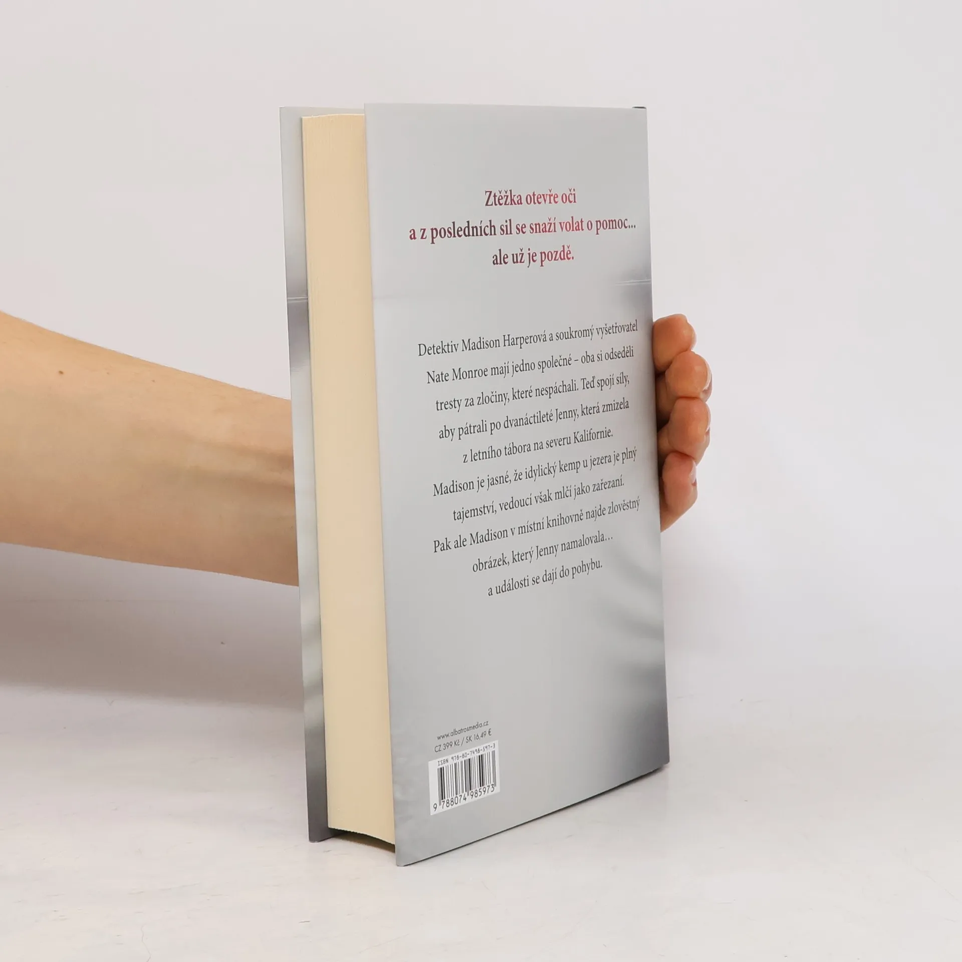 Začátek strhující detektivní série od bestsellerové autorky Detektiv Madison Harperová a soukromý vyšetřovatel Nate Monroe mají jedno společné – oba si odseděli tresty za zločiny, které nespáchali. Teď spojí síly, aby pátrali po dvanáctileté Jenny, která zmizela z letního tábora na severu Kalifornie. Madison je jasné, že idylický kemp u jezera je plný tajemství, vedoucí však mlčí jako zařezaní. Pak ale Madison v místní knihovně najde zlověstný obrázek, který Jenny namalovala… a události se dají do pohybu.Madison Harperová byla odsouzena za zločin, který nespáchala. Teď je ale na svobodě a je odhodlaná zjistit, kdo ji do vězení dostal. Pátrání ji přivede za Natem Monroem. I on se totiž neprávem ocitl v cele, kde čekal na trest smrti za vraždu své snoubenky. Byl však zproštěn viny a po svém propuštění se stal soukromým vyšetřovatelem.Madison doufá, že s Nateovou pomocí očistí své jméno, najde svého syna a získá zpět místo u policejního sboru. Na Natea však čeká jiný případ, který musí nejdřív vyřešit. A tak se společně vydávají na sever Kalifornie, aby pátrali po dvanáctileté Jenny, která beze stopy zmizela z letního tábora.Je jasné, že idylický kemp u jezera je plný tajemství. Vedoucí mlčí jako zařezaní a Jennyini rodiče nejsou dvakrát nadšení, že se soukromí vyšetřovatelé pletou policii pod nohy. Když ale Madison v místní knihovně najde zlověstný obrázek, který Jenny namalovala, události se konečně dají do pohybu…