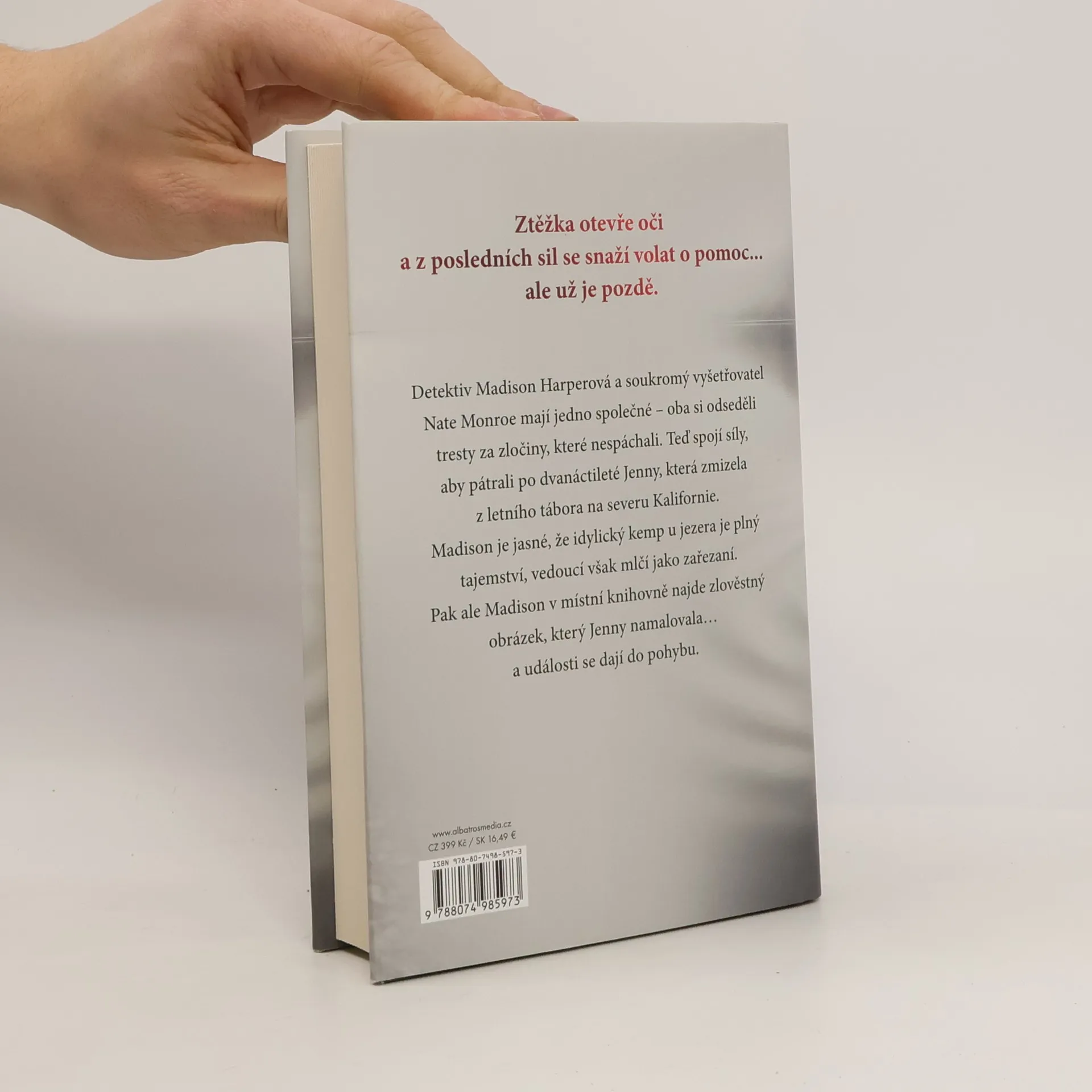 Začátek strhující detektivní série od bestsellerové autorky Detektiv Madison Harperová a soukromý vyšetřovatel Nate Monroe mají jedno společné – oba si odseděli tresty za zločiny, které nespáchali. Teď spojí síly, aby pátrali po dvanáctileté Jenny, která zmizela z letního tábora na severu Kalifornie. Madison je jasné, že idylický kemp u jezera je plný tajemství, vedoucí však mlčí jako zařezaní. Pak ale Madison v místní knihovně najde zlověstný obrázek, který Jenny namalovala… a události se dají do pohybu.Madison Harperová byla odsouzena za zločin, který nespáchala. Teď je ale na svobodě a je odhodlaná zjistit, kdo ji do vězení dostal. Pátrání ji přivede za Natem Monroem. I on se totiž neprávem ocitl v cele, kde čekal na trest smrti za vraždu své snoubenky. Byl však zproštěn viny a po svém propuštění se stal soukromým vyšetřovatelem.Madison doufá, že s Nateovou pomocí očistí své jméno, najde svého syna a získá zpět místo u policejního sboru. Na Natea však čeká jiný případ, který musí nejdřív vyřešit. A tak se společně vydávají na sever Kalifornie, aby pátrali po dvanáctileté Jenny, která beze stopy zmizela z letního tábora.Je jasné, že idylický kemp u jezera je plný tajemství. Vedoucí mlčí jako zařezaní a Jennyini rodiče nejsou dvakrát nadšení, že se soukromí vyšetřovatelé pletou policii pod nohy. Když ale Madison v místní knihovně najde zlověstný obrázek, který Jenny namalovala, události se konečně dají do pohybu…