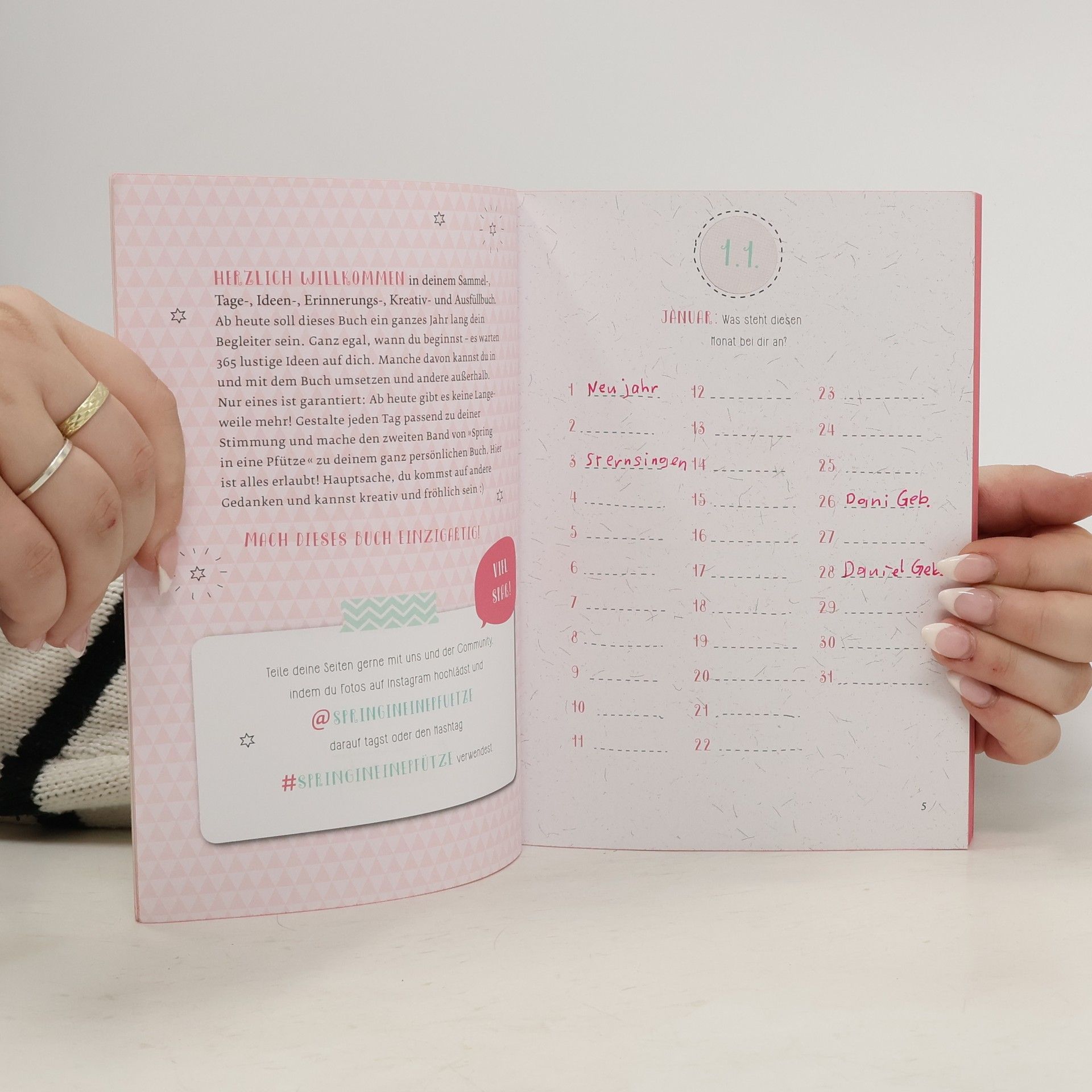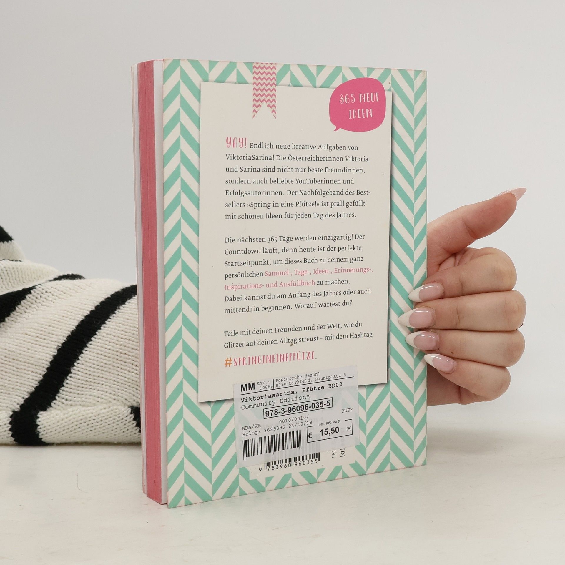 Endlich neue kreative Aufgaben! Der Nachfolger von „Spring in eine Pfütze“ bietet ganz neue bunte Ideen für weitere 365 einzigartige, kreative Tage. Der zweite Band des Bestsellers „Spring in eine Pfütze“ knüpft an das Erfolgsrezept des ersten Bandes an und bietet weiteren Stoff für die zahllosen Fans des Mitmachbuchs. Die Community bekommt für jeden Tag neue kreative Ideen, DIYs und Anleitungen, die sie weiterhin auf Instagram unter #springineinepfuetze teilen kann. Die neuen Aufgaben sind die perfekte Motivation, um Verrücktes, Buntes und Fröhliches auszuprobieren. Typisch ViktoriaSarina eben. Freude und Kreativität sind über einen langen Zeitraum garantiert!