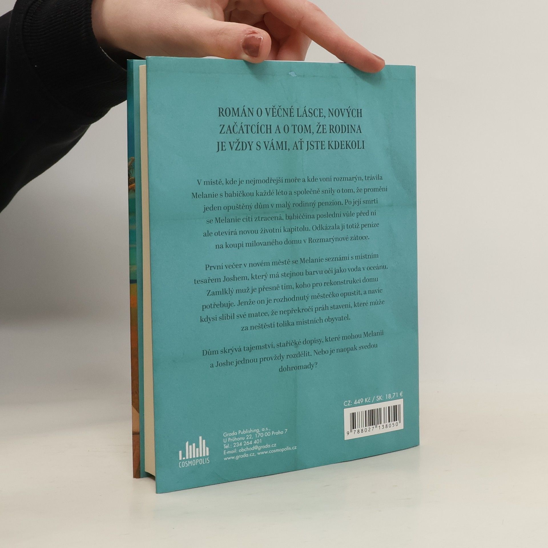 V místě, kde je nejmodřejší moře a kde voní rozmarýn, trávila Melanie s babičkou každé léto a společně snily o tom, že promění jeden opuštěný dům v malý rodinný penzion. Po její smrti se Melanie cítí ztracená, babiččina poslední vůle před ní ale otevírá novou životní kapitolu. Odkázala jí totiž peníze na koupi milovaného domu v Rozmarýnové zátoce. První večer v novém městě se Melanie seznámí s místním tesařem Joshem, který má stejnou barvu očí jako voda v oceánu. Zamlklý muž je přesně tím, koho pro rekonstrukci domu potřebuje. Jenže on je rozhodnutý městečko opustit, a navíc kdysi slíbil své matce, že nepřekročí práh stavení, které může za neštěstí tolika místních obyvatel. Dům skrývá tajemství, stařičké dopisy, které mohou Melanii a Joshe jednou provždy rozdělit. Nebo je naopak svedou dohromady?