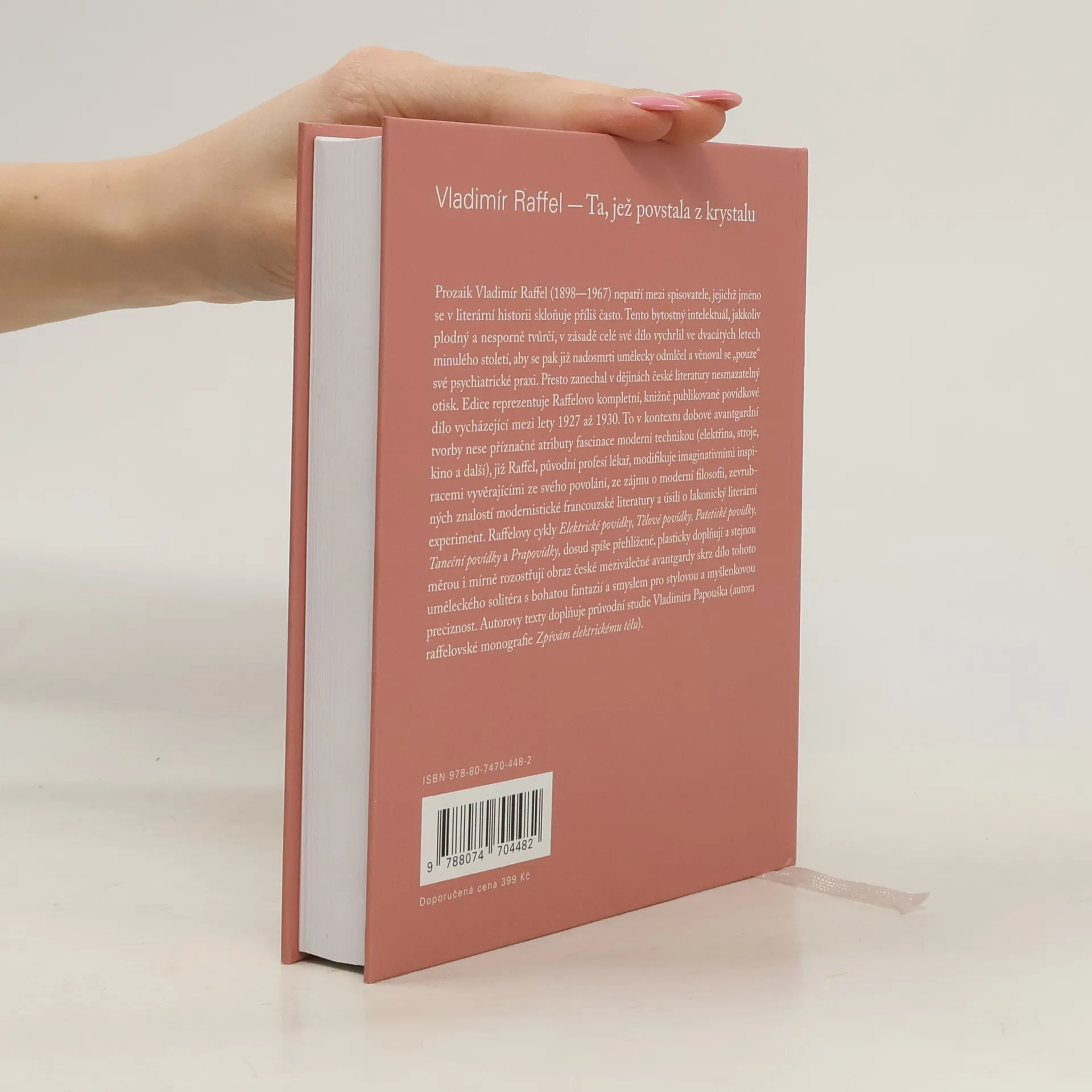 Prozaik Vladimír Raffel (1898–1967) nepatří mezi spisovatele, jejichž jméno se v literární historii skloňuje příliš často. Tento bytostný intelektuál, jakkoliv plodný a nesporně tvůrčí, v zásadě celé své dílo vychrlil ve dvacátých letech minulého století, aby se pak již nadosmrti umělecky odmlčel a věnoval se „pouze“ své psychiatrické praxi. Přesto zanechal v dějinách české literatury nesmazatelný otisk. Edice s názvem Ta, jež povstala z krystalu reprezentuje Raffelovo kompletní, knižně publikované povídkové dílo vycházející mezi lety 1927 až 1930, jež v kontextu dobové avantgardní tvorby nese příznačné atributy fascinace moderní technikou (elektřina, stroje, kino a další), již Raffel, původní profesí lékař, modifikuje imaginativními inspiracemi vyvěrajícími ze svého povolání, ze zájmu o moderní filosofii, zevrubných znalostí modernistické francouzské literatury a úsilí o lakonický literární experiment. Raffelovy cykly Elektrické povídky, Tělové povídky, Patetické povídky, Taneční povídky a Prapovídky, dosud spíše přehlížené, plasticky doplňují a stejnou měrou i mírně rozostřují obraz české meziválečné avantgardy skrz dílo tohoto uměleckého solitéra s bohatou fantazií a smyslem pro stylovou a myšlenkovou preciznost. Autorovy texty doplňuje průvodní studie Vladimíra Papouška.