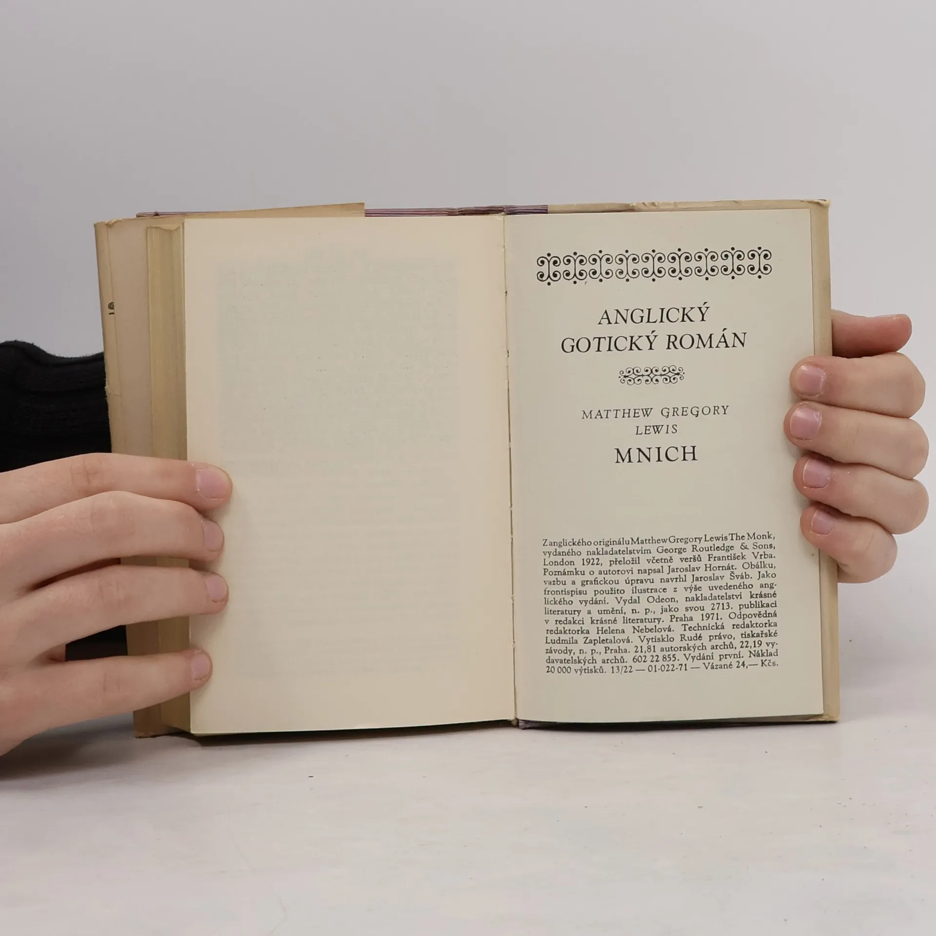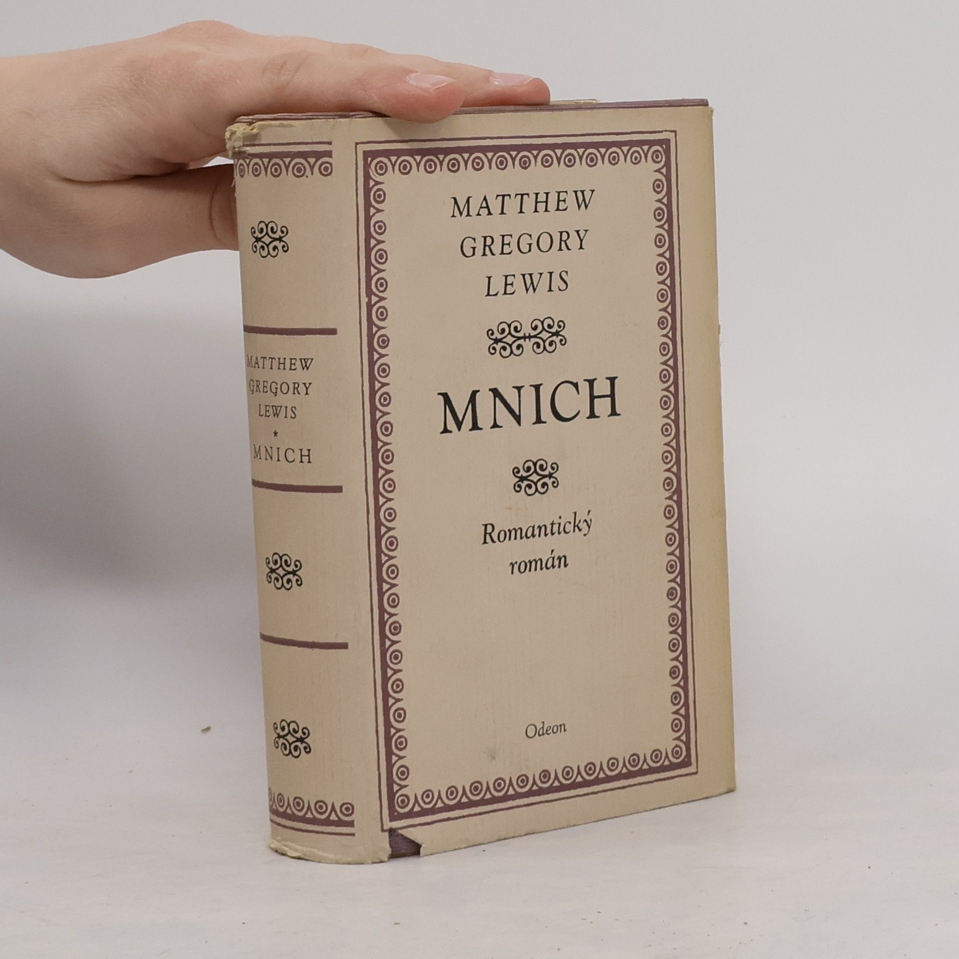 První a také jediný román, který z rozsáhlé tvorby anglického spisovatele a dramatika vstoupil do literárních dějin. Autor totiž v tomto díle přináší do romantické literatury vůbec a zejména pak do hrůzostrašného žánru anglického gotického románu v postavě mnicha novou problematiku tragédie duše. Příběh vypráví o mnichovi, který neodolá svodům Satanovým, propadne neřestným vášním tělesného chtíče a pod maskou ctihodnosti kupí pomocí kouzel jeden zločin na druhý, přičemž současně prožívá i duševní utrpení nad scestnou vášní přemáhající ctnostná předsevzetí. Poznámku o autorovi napsal Jaroslav Hornát.