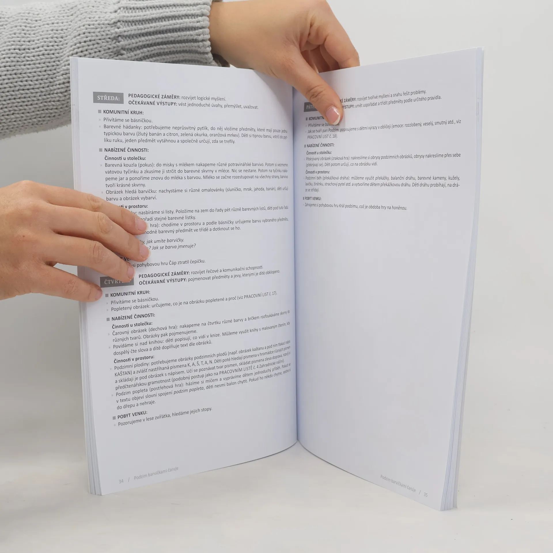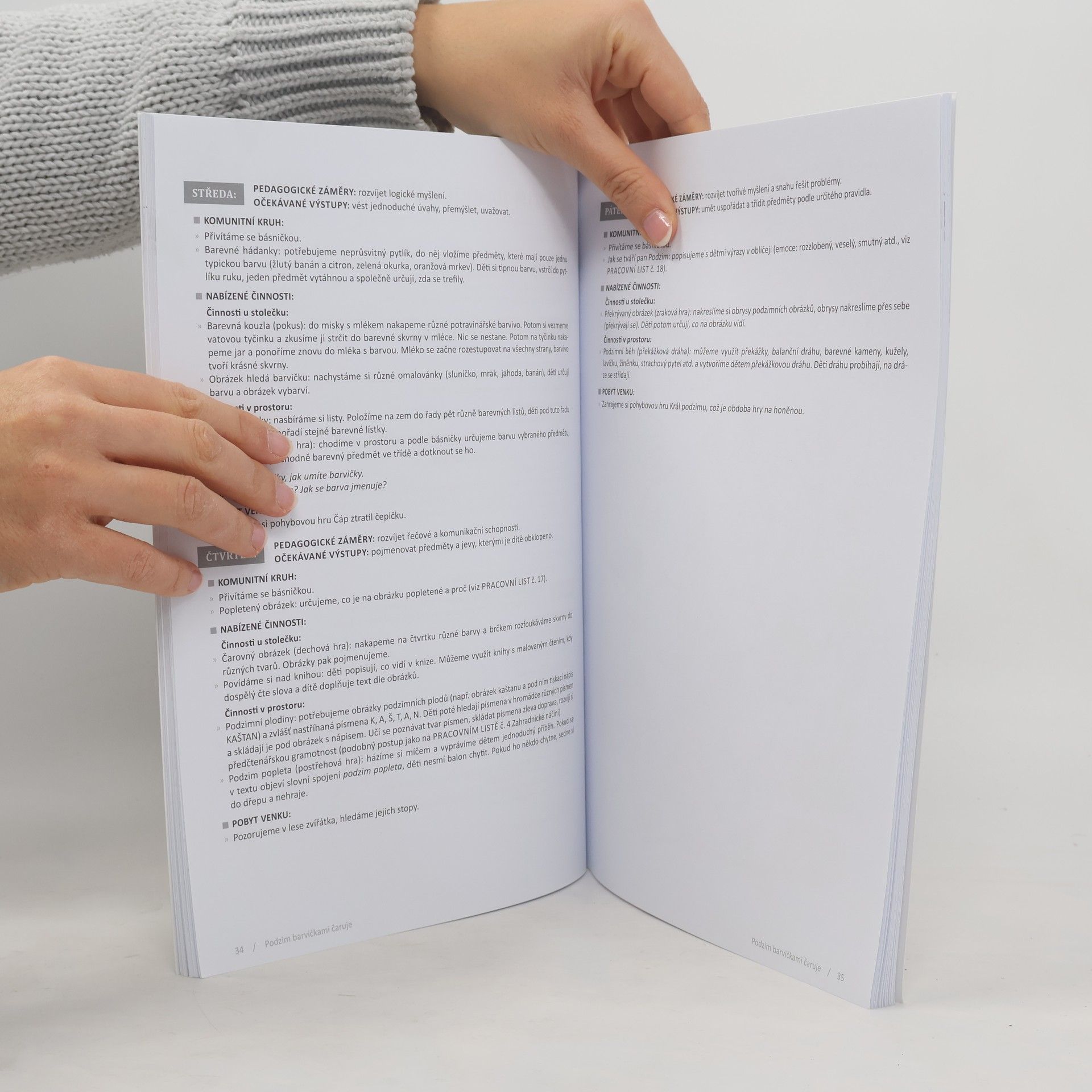 Pracovní sešit zaměřený na období podzimu je rozdělený na dvanáct týdenních bloků s jednoduchými popisy činností. Veškeré aktivity jsou rozepsány na jednotlivé dny a autorka dbá na jejich vyváženost v kontextu celého týdne. Zabývá se prvotní motivací, následně komunitním kruhem, nabízí činnosti výtvarné, pohybové, hudební, v prostoru, u stolečku. Nabízí nápady na pobyt venku. Ke každému týdnu jsou připojeny tři pracovní listy, které přímo navazují na určité činnosti a aktivity, které se v knize objevují. Přednostně jsou cíleny na grafomotoriku, ale neopomíjejí ani ostatní činnosti. Sešit tedy může sloužit velmi dobře jako podklad pro každodenní přípravy začínajícím učitelkám. Těm zkušenějším pak přináší jednoduchý přehled činností, které si mohou následně skládat dle vlastního uvážení a vybírat si z pracovních sešitů pouze ty, které se jim líbí. Jde o druhý díl série pracovních sešitů cílených vždy na určitou část roku (první díl Vlaštovičky štěbetají, z jara totiž radost mají zaměřený na jaro a léto).