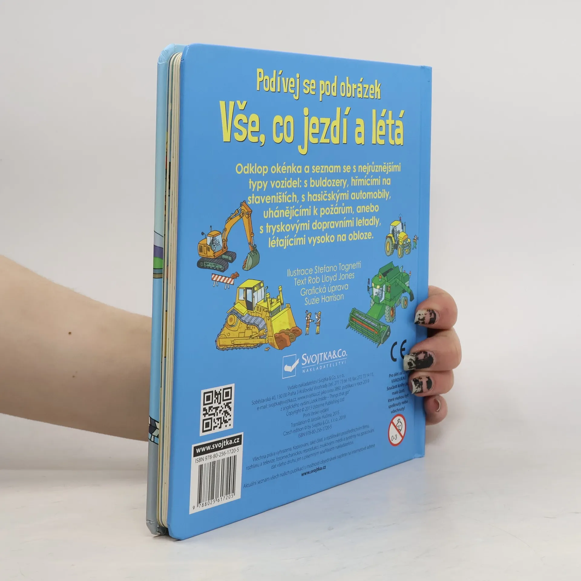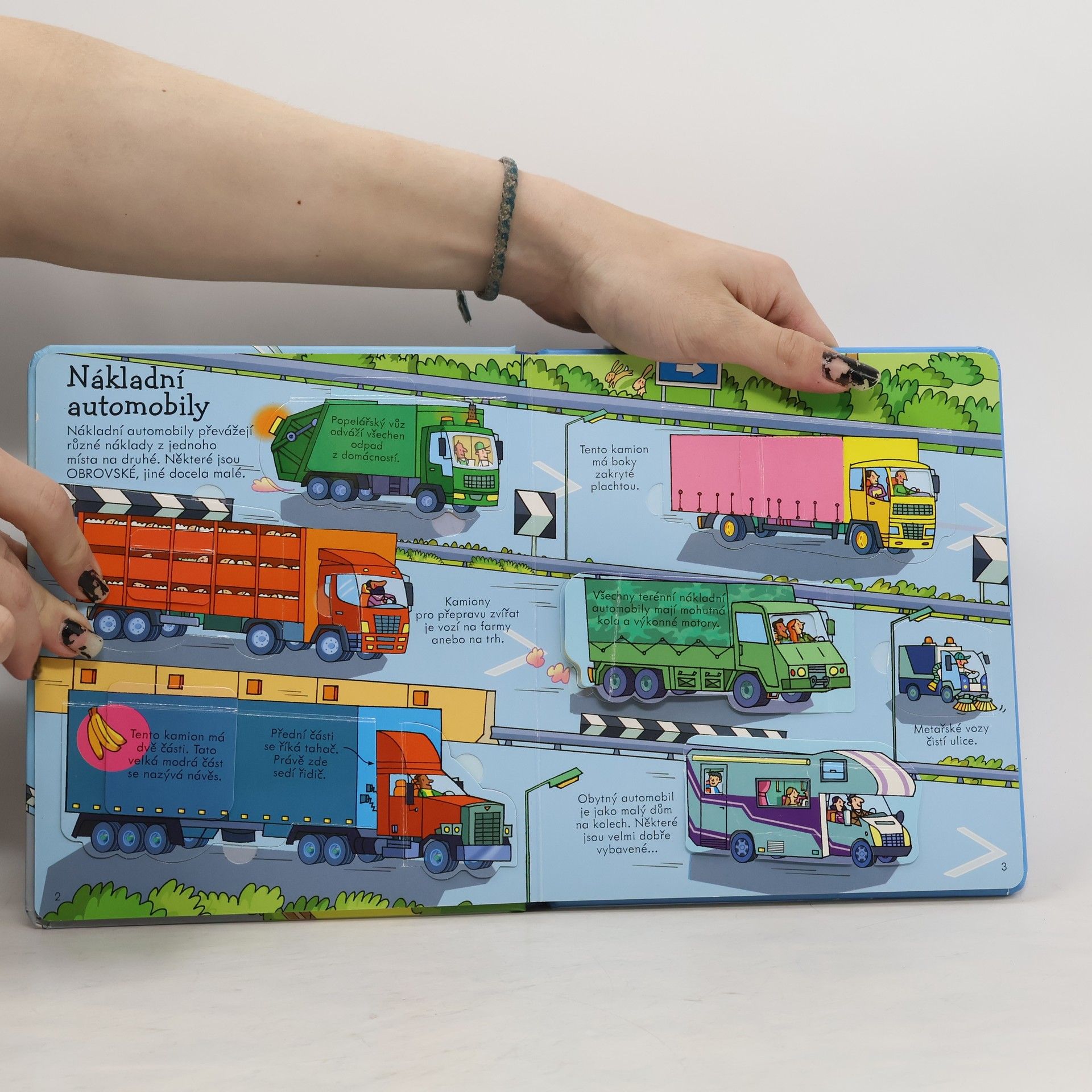 Seznam se díky této encyklopedické knížce, mající více než 60 odklápěcích okének, s různými dopravními prostředky – s vlaky, uhánějícími po železničních tratích, s nákladními automobily, převážejícími různé náklady, s velkými proudovými dopravními letadly, přepravujícími cestující po celém světě, s farmářskými stroji, supícími na polích, ale také se závodními auty, obrovskými výletními loděmi, pohotovostními vozidly, která spěchají pomoci lidem v nouzi, i se stavebními stroji, které používají stavbaři na nerovném terénu stavenišť. Tak honem nastupovat, jedeme!