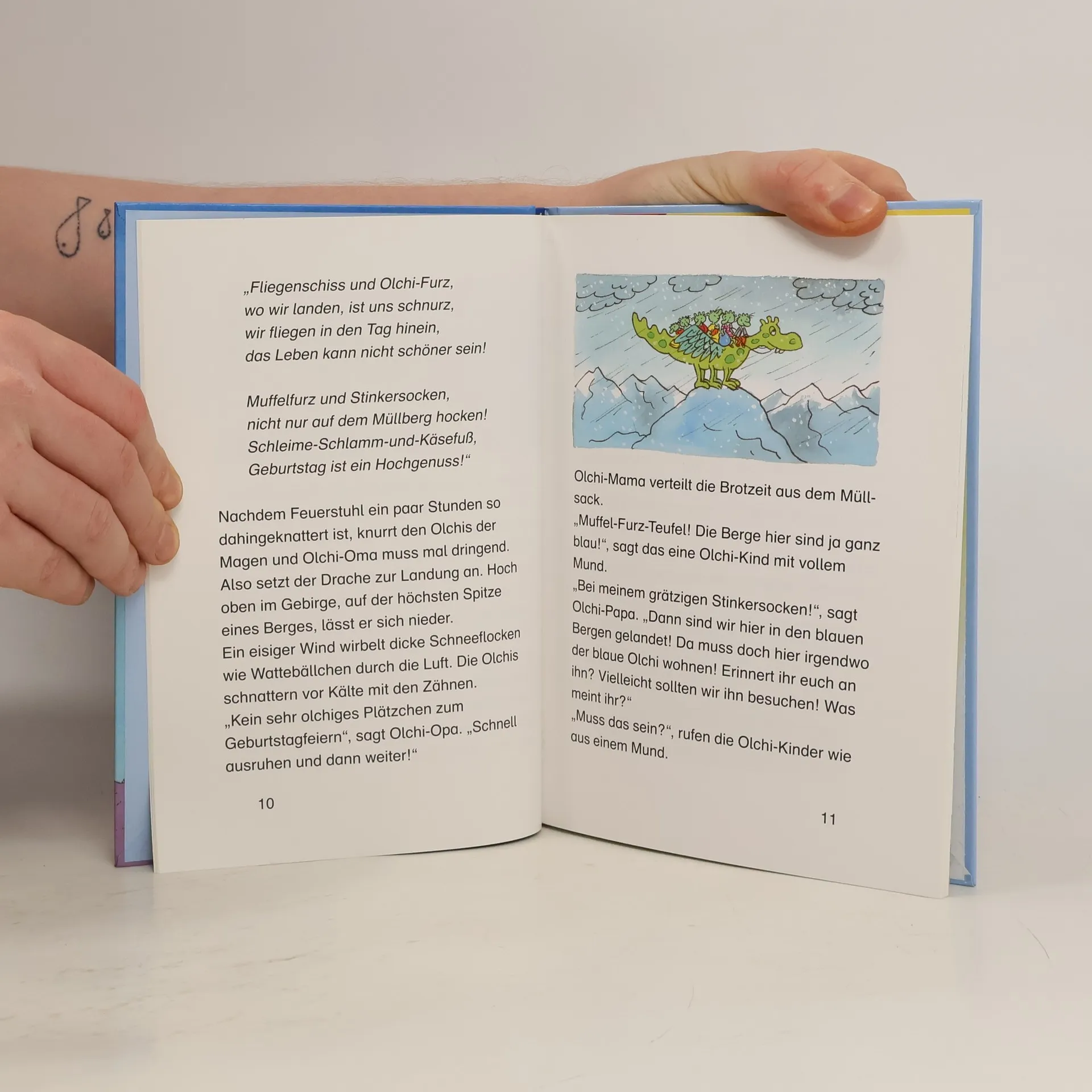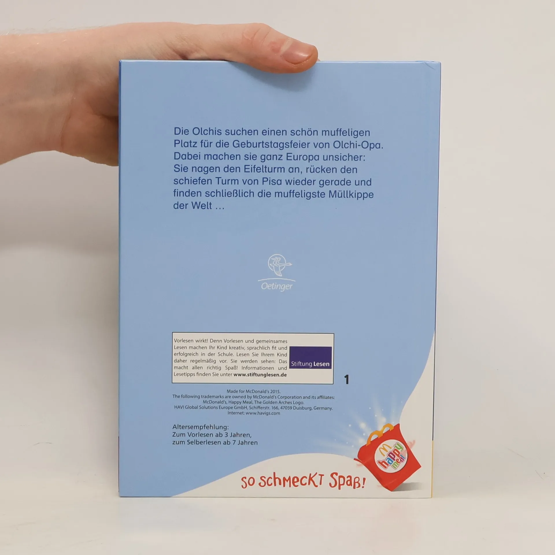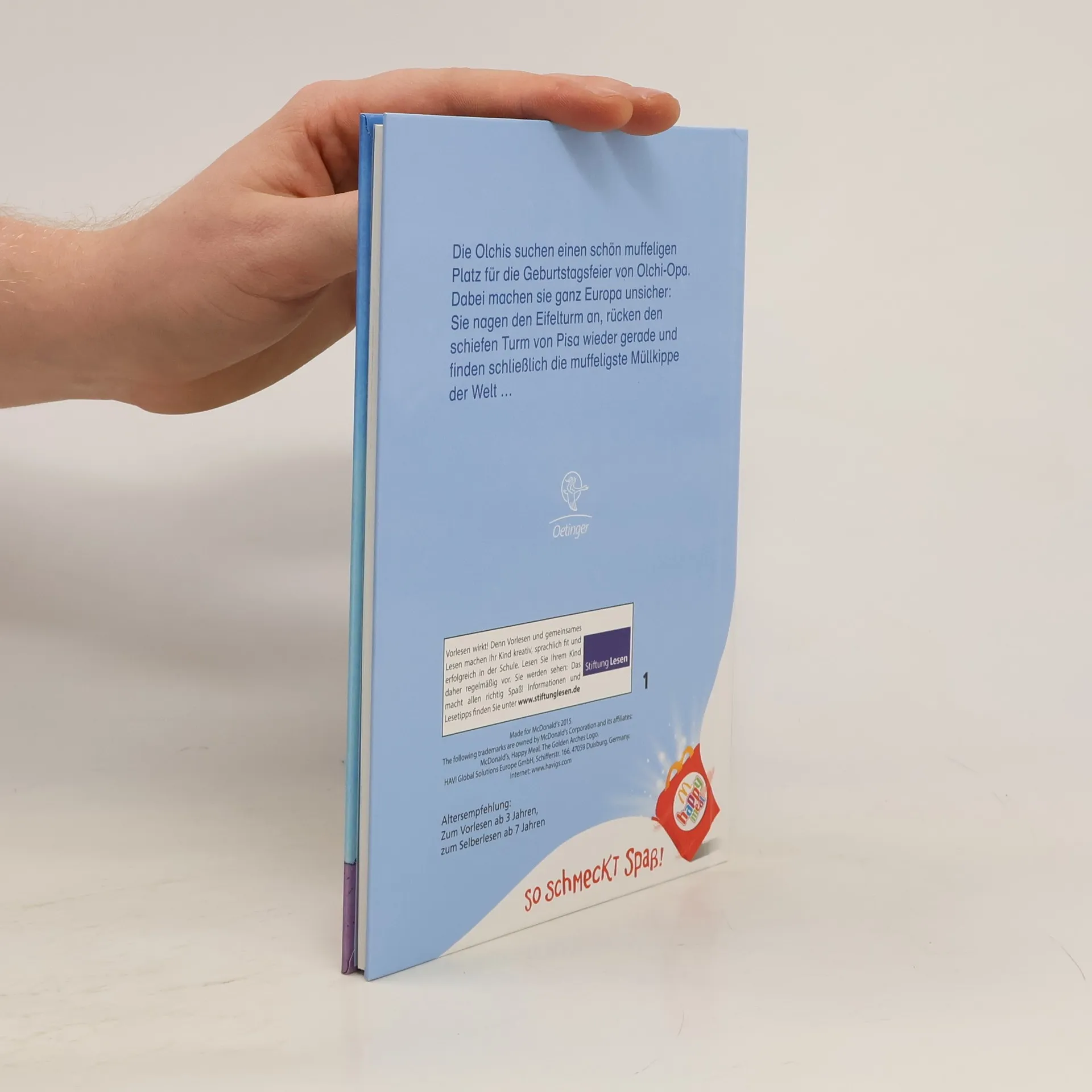 Was für eine Geburtstagsreise! Auf dem Rücken von Feuerstuhl, ihrem Drachen, machen die Olchis Europa unsicher. Sie suchen einen schönen, muffeligen Platz für die Geburtstagsfeier von Olchi-Opa. Dabei landen sie in einem schottischen Schloss, nagen den Eiffelturm in Paris an und rücken den Schiefen Turm von Pisa wieder gerade.
