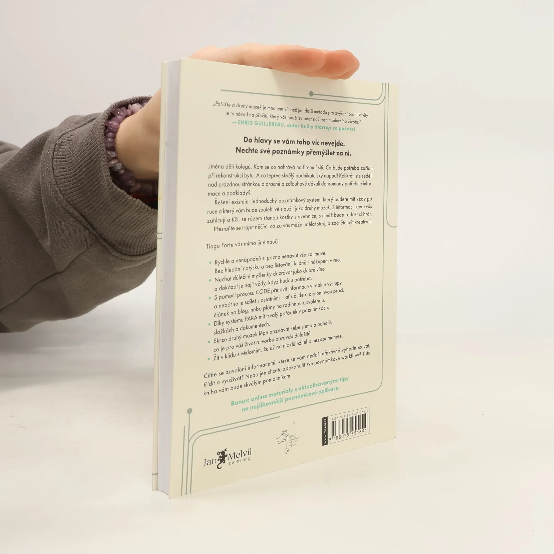 Poprvé v historii mají lidé snadný přístup k veškerému vědění, které je jen pár kliknutí daleko. Tato dostupnost však často vede k pocitu zahlcení a paralyzace množstvím informací, názorů a možností, které nás obklopují. Místo efektivní práce často jen ukládáme články a videa na později, aniž bychom se k nim někdy vrátili. Množství drobných povinností a myšlenek nám brání věnovat se kreativní činnosti, což je škoda. Řešení spočívá v vytvoření druhého mozku. Autor přichází s praktickou metodou, jak si zřídit jednoduchý a přehledný systém poznámek, který usnadní vyhledávání potřebných informací. Tento systém vám umožní nahlížet na věci z různých perspektiv, uvolní vám ruce pro kreativní projekty a zajistí, že už nikdy nezačnete od nuly. Kniha vás provede dvěma jednoduchými systémy, díky nimž se naučíte třídit, ukládat a efektivně pracovat s informacemi. Pomůže vám uspořádat digitální svět tak, aby vás nezahlcoval, a uvolní prostor pro váš tvůrčí potenciál. Všechny užitečné informace budete mít na dosah v momentě, kdy je skutečně potřebujete.