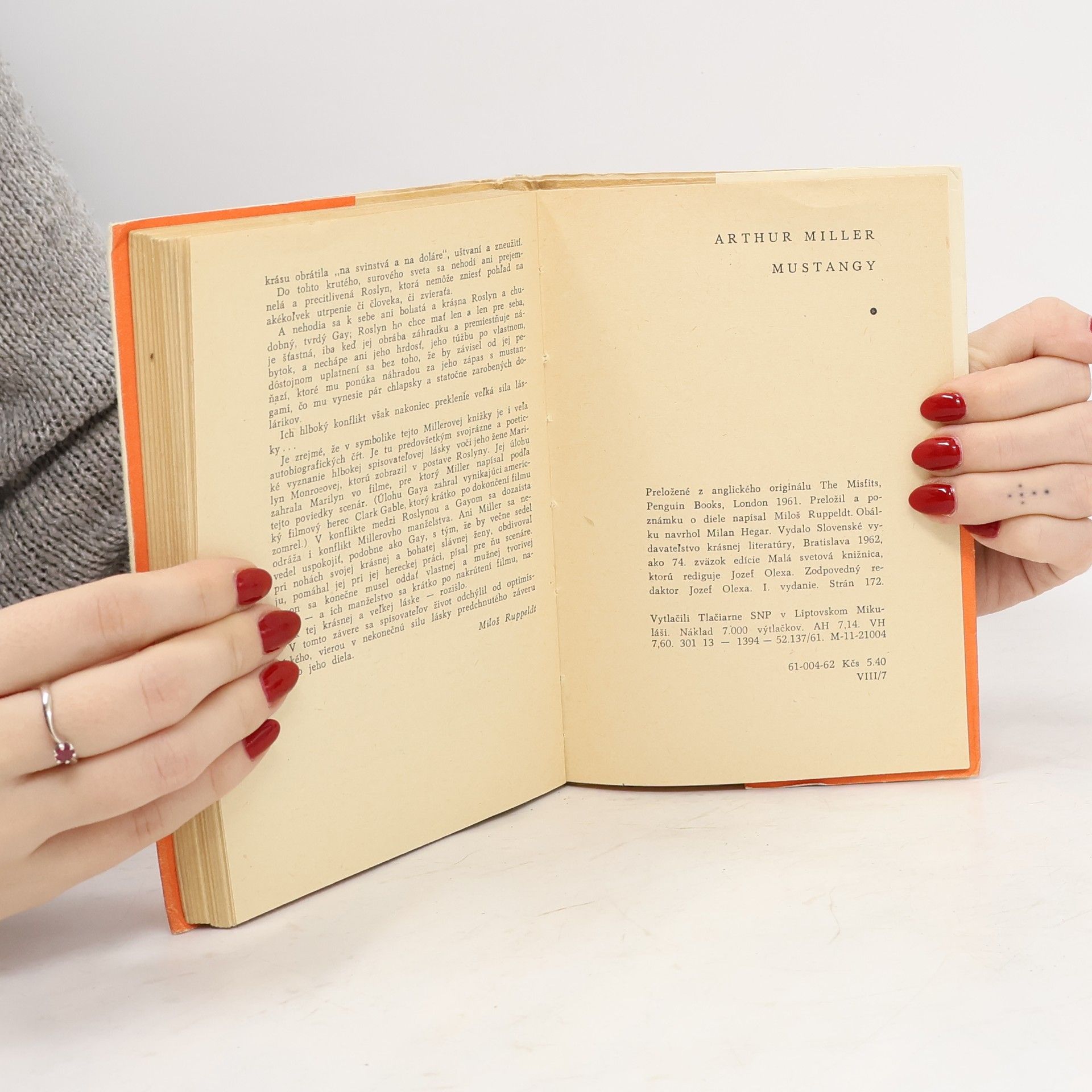 Arthura Millera pozná naša verejnosť ako pokrokového amerického dramatika, autora vynikajúcich hier Smrť obchodného cestujúceho, Všetci moji synovia, Pohľad z mosta a Skúška ohňom. Mustangy je prvá autorova významnejšia próza, neskôr mu slúžila za podklad pre filmový scenár. Nakrútili podľa nej film, v ktorom úlohu Roslyny zabrala vtedajšia Millerova žena Marilyn Monroeová a v úlohe Gaya vystúpil známy americký herec Clark Gable. Po skončení filmu sa Millerovo manželstvo rozpadlo. Spomíname to preto, lebo v bohatej symbolike tohto diela, ktoré má aj isté autobiografické črty, šlo aj o problémy tohto manželstva. No spoločenská symbolika tejto knižky má oveľa širší dosah. Na osude vymierajúcich krásnych slobodných mustangov i na osudoch slobodumilovných a pre tento svet, v ktorom sa všetko premenilo „na svinstvá a na doláre“, nesúcich cowboyov Miller s veľkou poéziou a s hlbokým pohľadom kritického spisovateľa zobrazuje tragické a temné stránky svojej spoločnosti. Dielo je písané zvláštnym novátorským štýlom, vedome ovplyvneným filmovou technikou či filmovým videním dnešného moderného človeka. Čitateľovi akiste nadlho ostanú v pamäti – popri autorových hlbokých myšlienkach – aj živé opisy cowboyskej krčmy, rodea a najmä dramatického lovu na mustangy.