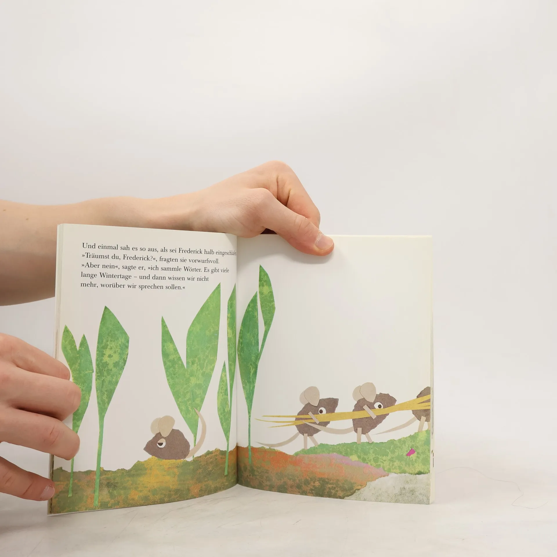 „Macht die Augen zu“, sagte Frederick und kletterte auf einen großen Stein. „Jetzt schicke ich euch die Sonnenstrahlen. Fühlt ihr schon, wie warm sie sind? Schön warm und golden.“