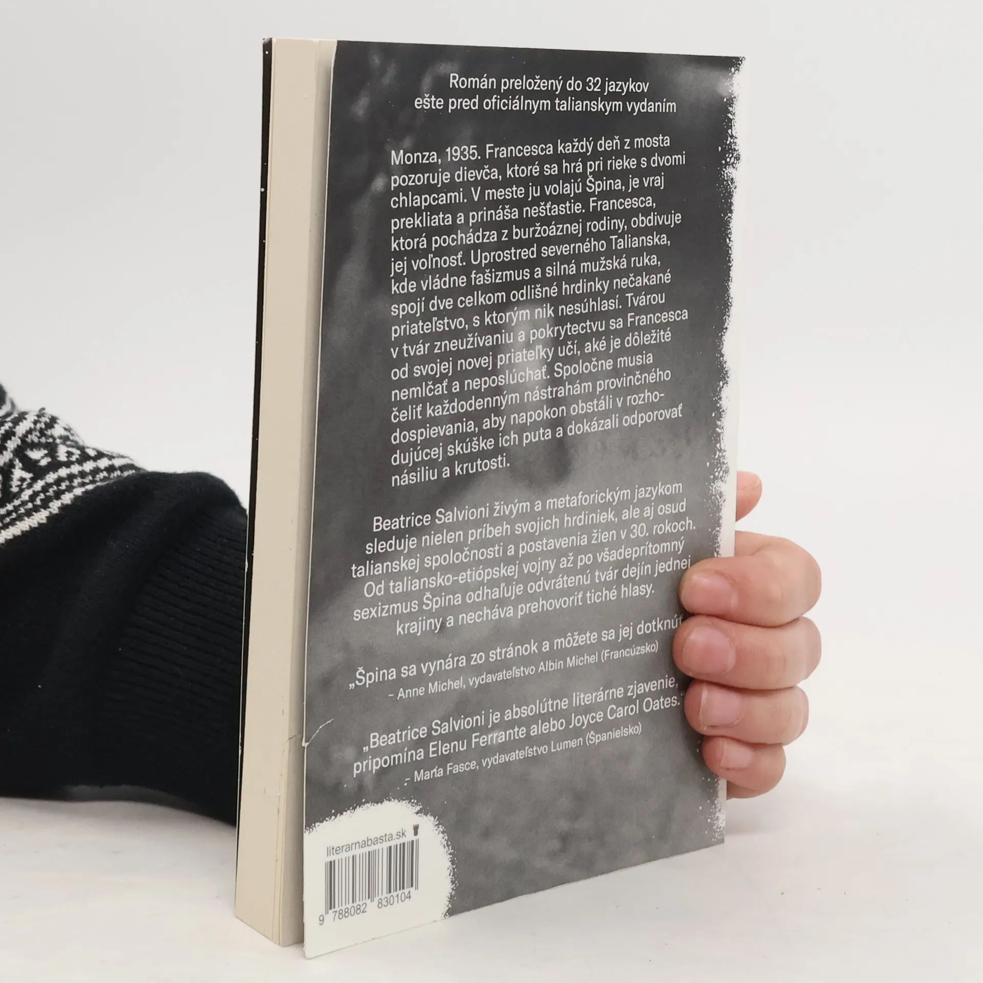 Príbeh nezabudnuteľného priateľstva z fašistického Talianska, ktorý preložili do 32 jazykov ešte pred jeho oficiálnym vydaním.Monza, 1935. Francesca každý deň z mosta pozoruje dievča, ktoré sa hrá pri rieke s dvomi chlapcami. V meste ju volajú Špina, je vraj prekliata a prináša nešťastie. Francesca, ktorá pochádza z buržoáznej rodiny, obdivuje jej voľnosť. Uprostred severného Talianska, kde vládne fašizmus a silná mužská ruka, spojí dve celkom odlišné hrdinky nečakané priateľstvo, s ktorým nik nesúhlasí. Tvárou v tvár zneužívaniu a pokrytectvu sa Francesca od svojej novej priateľky učí, aké je dôležité nemlčať a neposlúchať. Spoločne musia čeliť každodenným nástrahám provinčného dospievania, aby napokon obstáli v rozhodujúcej skúške ich puta a dokázali odporovať násiliu a krutosti.Beatrice Salvioni živým a metaforickým jazykom sleduje nielen príbeh svojich hrdiniek, ale aj osud talianskej spoločnosti a postavenia žien v 30. rokoch. Od taliansko-etiópskej vojny až po všadeprítomný sexizmus Špina odhaľuje odvrátenú tvár dejín jednej krajiny a necháva prehovoriť tiché hlasy.