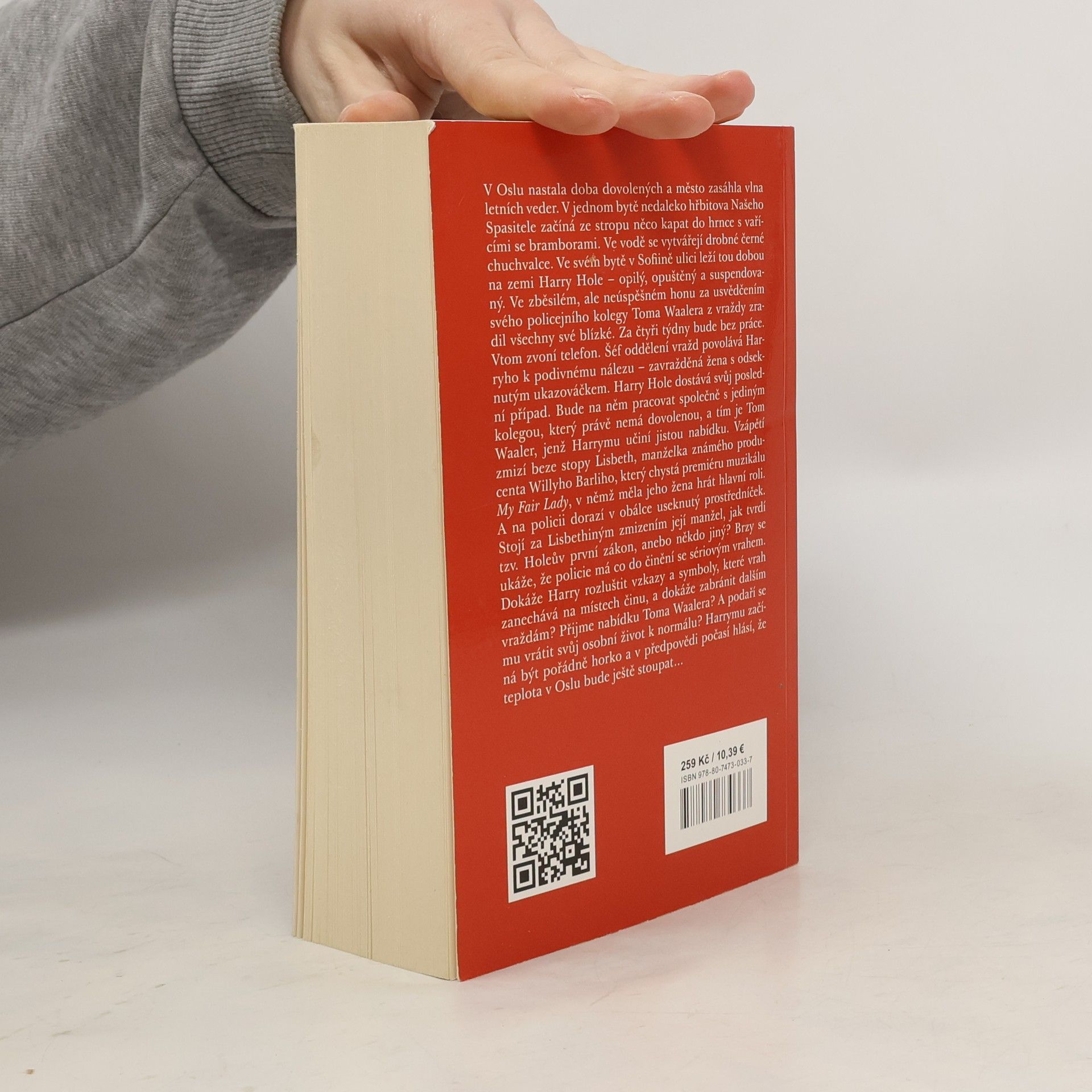 V Oslu začíná období prázdnin a dovolených a město zasáhla vlna letních veder. V jednom bytě nedaleko hřbitova Našeho Spasitele začíná ze stropu něco kapat do hrnce s vařícími se bramborami. Ve vodě se tvoří drobné černé chuchvalce. Ve svém bytě v Sofiině ulici leží tou dobou na zemi Harry Hole – opilý, opuštěný a suspendovaný. Ve zběsilém, ale neúspěšném honu za usvědčením svého policejního kolegy Toma Waalera z vraždy zradil všechny své blízké. Za čtyři týdny bude bez práce. Vtom zvoní telefon. Šéf oddělení vražd povolává Harryho k podivnému nálezu – zavražděná žena s odseknutým prstem. Harry Hole dostává svůj poslední případ. Bude na něm pracovat společně s jediným kolegou, který právě nemá dovolenou, s Tomem Waalerem, jenž Harrymu učiní jistou nabídku. Vzápětí zmizí beze stopy Lisbeth, manželka známého producenta Willyho Barliho, který chystá premiéru muzikálu My Fair Lady, v němž měla jeho žena hrát hlavní roli. A na policii dorazí v obálce useknutý prstem. Stojí za Lisbethiným zmizením její manžel, jak tvrdí tzv. Holeův první zákon, anebo někdo jiný? Brzy se ukáže, že policie má co do činění se sériovým vrahem. Dokáže Harry rozluštit vzkazy a symboly, které vrah zanechává na místech činu, a dokáže zabránit dalším vraždám? Přijme nabídku Toma Waalera? A podaří se mu vrátit svůj osobní život k normálu? Harrymu začíná být pořádně horko. 2. vydání