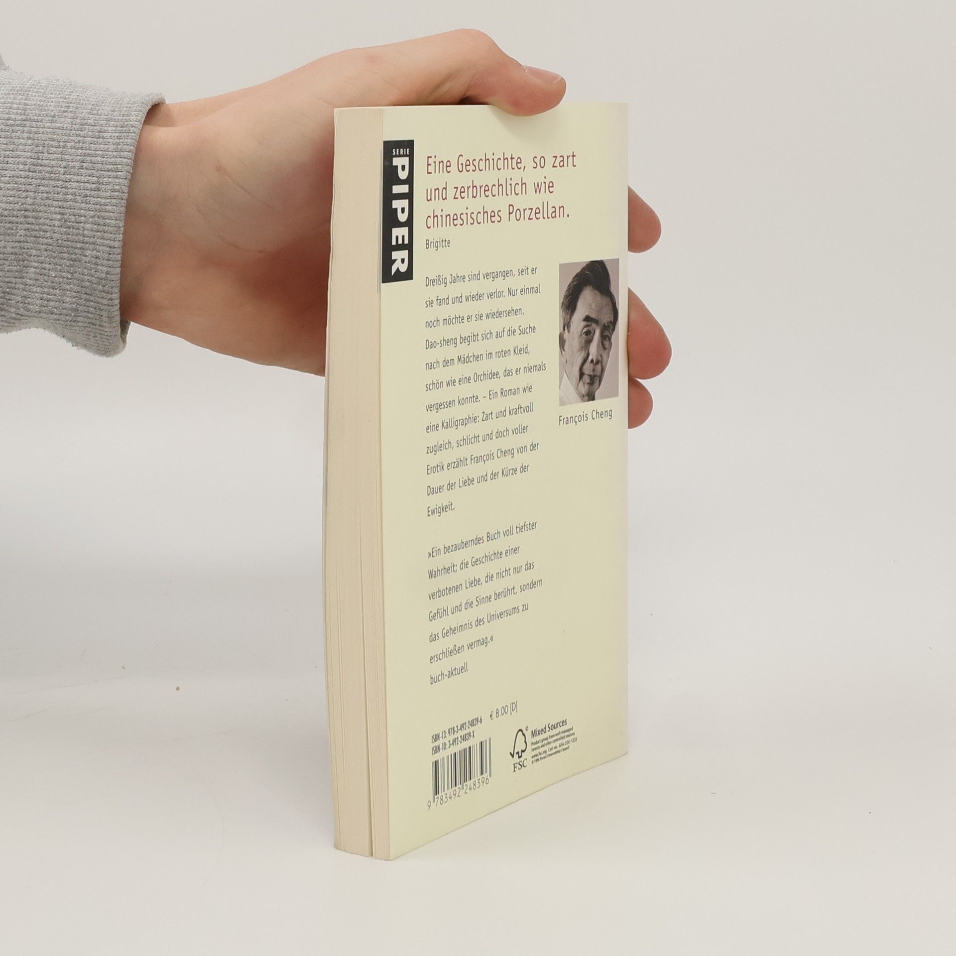 Dreißig Jahre sind vergangen, seit er sie fand und wieder verlor. Nur einmal noch möchte er sie wiedersehen. Dao-sheng verläßt seinen Unterschlupf in einem taoistischen Kloster und begibt sich auf die Suche nach dem Mädchen im roten Kleid, schön wie eine Orchidee, das er niemals vergessen konnte. Ein Roman wie eine Kalligraphie: Zart und kraftvoll zugleich, schlicht und doch voller Erotik erzählt François Cheng von der Dauer der Liebe und der Kürze der Ewigkeit. »Ein bezauberndes Buch voll tiefster Wahrheit; die Geschichte einer verbotenen Liebe, die nicht nur das Gefühl und die Sinne berührt, sondern das Geheimnis des Universums zu erschließen vermag.«buch-aktuell