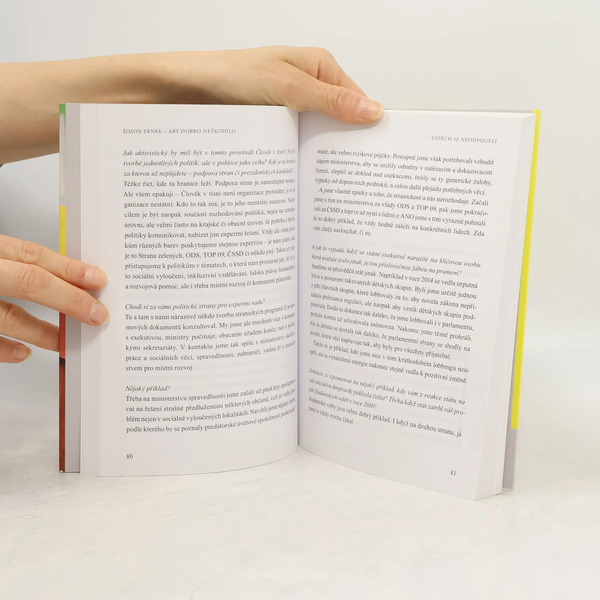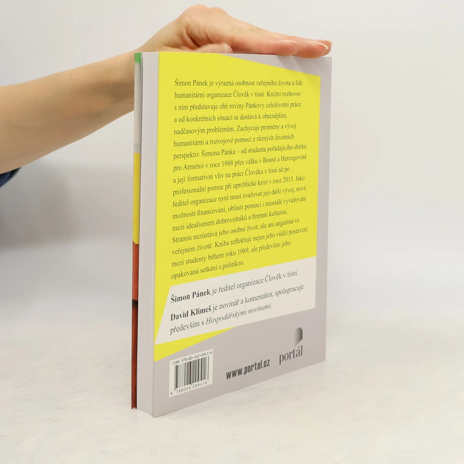 Šimon Pánek je výrazná osobnost veřejného života a humanitární manažer. Knižní rozhovor představuje obě roviny jeho celoživotní práce a od konkrétních životních situací se dostává k obecnějším, nadčasovým problémům. Rozhovor zachycuje proměny a vývoj humanitární pomoci z různých životních perspektiv Šimona Pánka – od studenta pořádajícího sbírku pro Arménii v roce 1988 přes vznik Nadace Lidových novin až po profesionální pomoc prostřednictvím Člověka v tísni. Jako řídící manažer Člověka v tísni nyní musí zvažovat další vývoj organizace, nové možnosti financování, nové oblasti pomoci i neustálé vyvažování mezi idealismem dobrovolníků a firemní kulturou. Stranou nezůstává ani jeho angažmá ve veřejném životě. Kniha reflektuje nejen jeho vůdčí postavení mezi studenty během roku 1989, ale především jeho opakované návraty k politice, které však dosud nikdy neskončily kandidaturou na politickou funkci. Šimon Pánek je ředitel organizace Člověk v tísni. David Klimeš je novinář a komentátor, spolupracuje hlavně s Hospodářskými novinami.