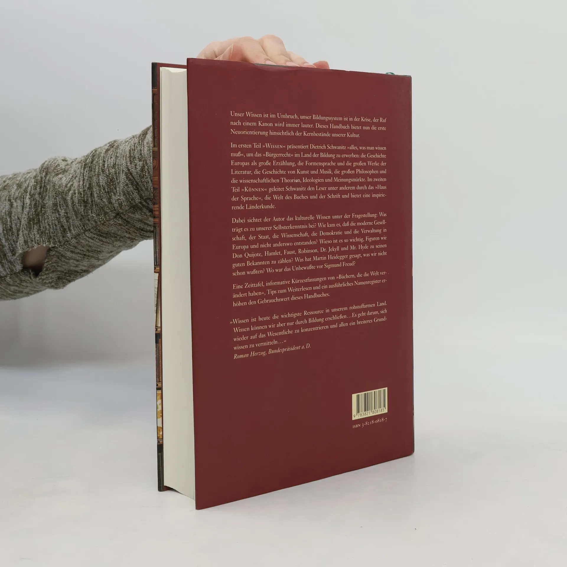 Ein Bildungskanon, der aufzeigt, was wesentlich ist. Schwanitz hat unser Allgemeinwissen durchleuchtet und unser kulturelles Gedächtnis neu ausgerichtet. Er beseitigt die Barrieren, die vielen den Zugang zu unserer Kultur versperren, und unterdrückt jeden Bildungsdünkel. In Zeiten eines Bildungssystems in der Krise wird der Ruf nach einem Kanon lauter. Dieses Handbuch bietet eine Neuorientierung zu den Kernbeständen unserer Kultur. Im ersten Teil „Wissen“ präsentiert Schwanitz alles, was man wissen muss, um das „Bürgerrecht“ im Land der Bildung zu erwerben: die große Erzählung der europäischen Geschichte, die Formensprache und bedeutende literarische Werke, Kunst- und Musikgeschichte, Philosophen sowie wissenschaftliche Theorien und Ideologien. Der zweite Teil „Können“ führt den Leser durch das „Haus der Sprache“, die Welt des Buches und der Schrift und bietet inspirierende Länderkunde. Schwanitz fragt, was unser kulturelles Wissen zur Selbsterkenntnis beiträgt und untersucht die Ursprünge moderner Gesellschaften in Europa. Er beleuchtet die Bedeutung bekannter literarischer Figuren und bietet informative Zusammenfassungen von „Büchern, die die Welt verändert haben“. Eine Zeittafel, Tipps zum Weiterlesen und ein ausführliches Namenregister erhöhen den Nutzen dieses Handbuchs.