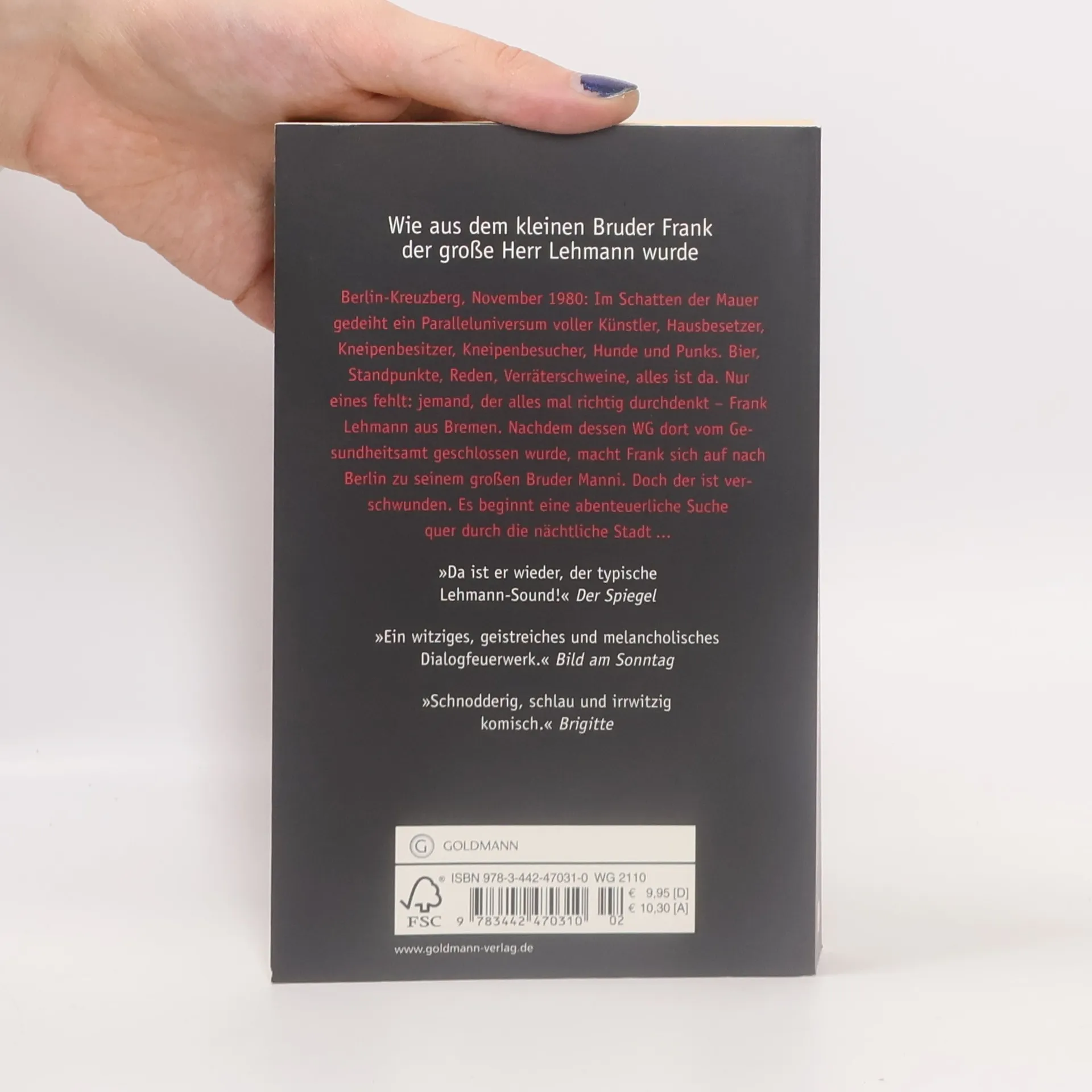 Wie aus dem kleinen Bruder Frank der große Herr Lehmann wurde Berlin-Kreuzberg, November 1980: Im Schatten der Mauer gedeiht ein Paralleluniversum voller Künstler, Hausbesetzer, Kneipenbesitzer, Kneipenbesucher, Hunde und Punks. Bier, Standpunkte, Reden, Verräterschweine, alles ist da. Nur eines fehlt: jemand, der alles mal richtig durchdenkt – Frank Lehmann aus Bremen. Nachdem dessen WG dort vom Gesundheitsamt geschlossen wurde, macht Frank sich auf nach Berlin zu seinem großen Bruder Manni. Doch der ist verschwunden. Es beginnt eine abenteuerliche Suche quer durch die nächtliche Stadt ...Sven Regeners dritter großer Herr-Lehmann-Roman, chronologisch zwischen „Neue Vahr Süd“ und „Herr Lehmann“ angeordnet.