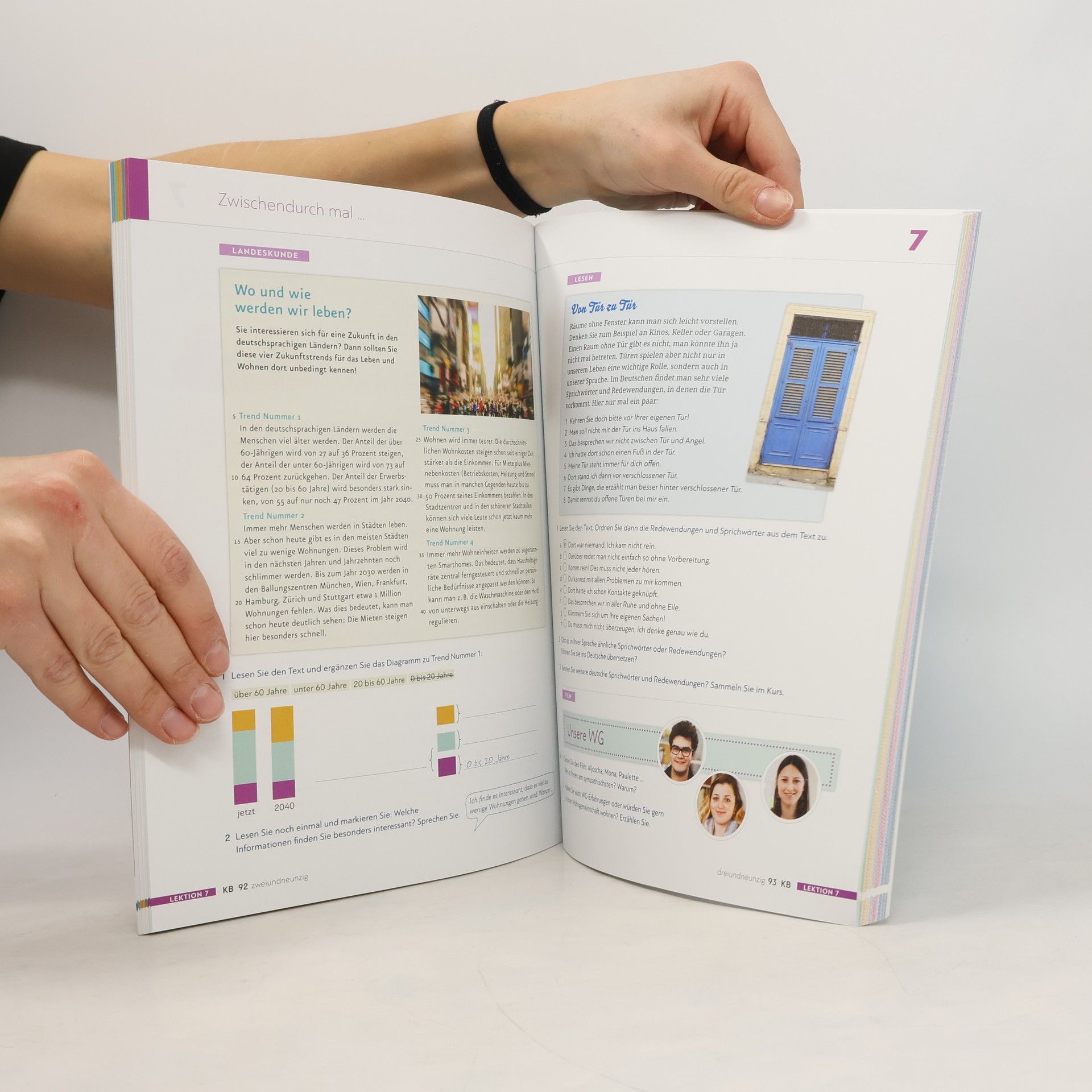 Der Kurs B1.1 bietet einen strukturierten Aufbau mit klaren Lernzielen und fördert die Lerntransparenz. Jede Lektion beginnt mit neuen Foto-Hörgeschichten und enthält interessante Texte sowie Landeskunde. Die induktive Grammatik unterstützt das Verständnis, während der Berufsbezug auf den Alltag vorbereitet. Ein Arbeitsbuch mit differenzierten Übungen, systematischem Schreibtraining und Phonetik ergänzt das Kursbuch. Zudem sind alle Medien über mobile Geräte abrufbar, und zusätzliche Materialien zu Beruf und Alltag sind integriert, um die Lernerautonomie zu stärken.