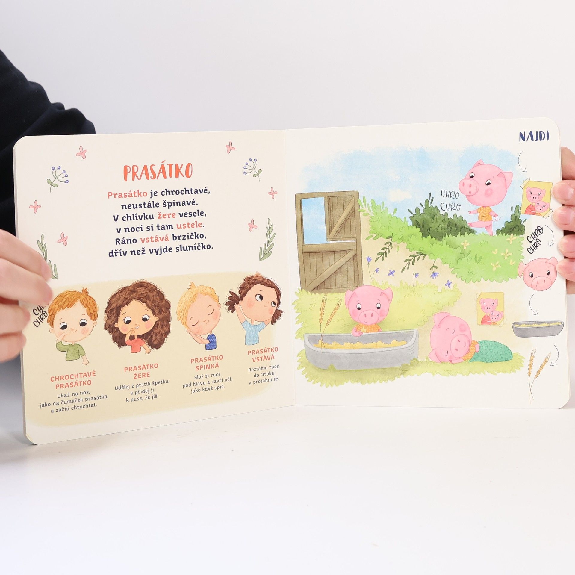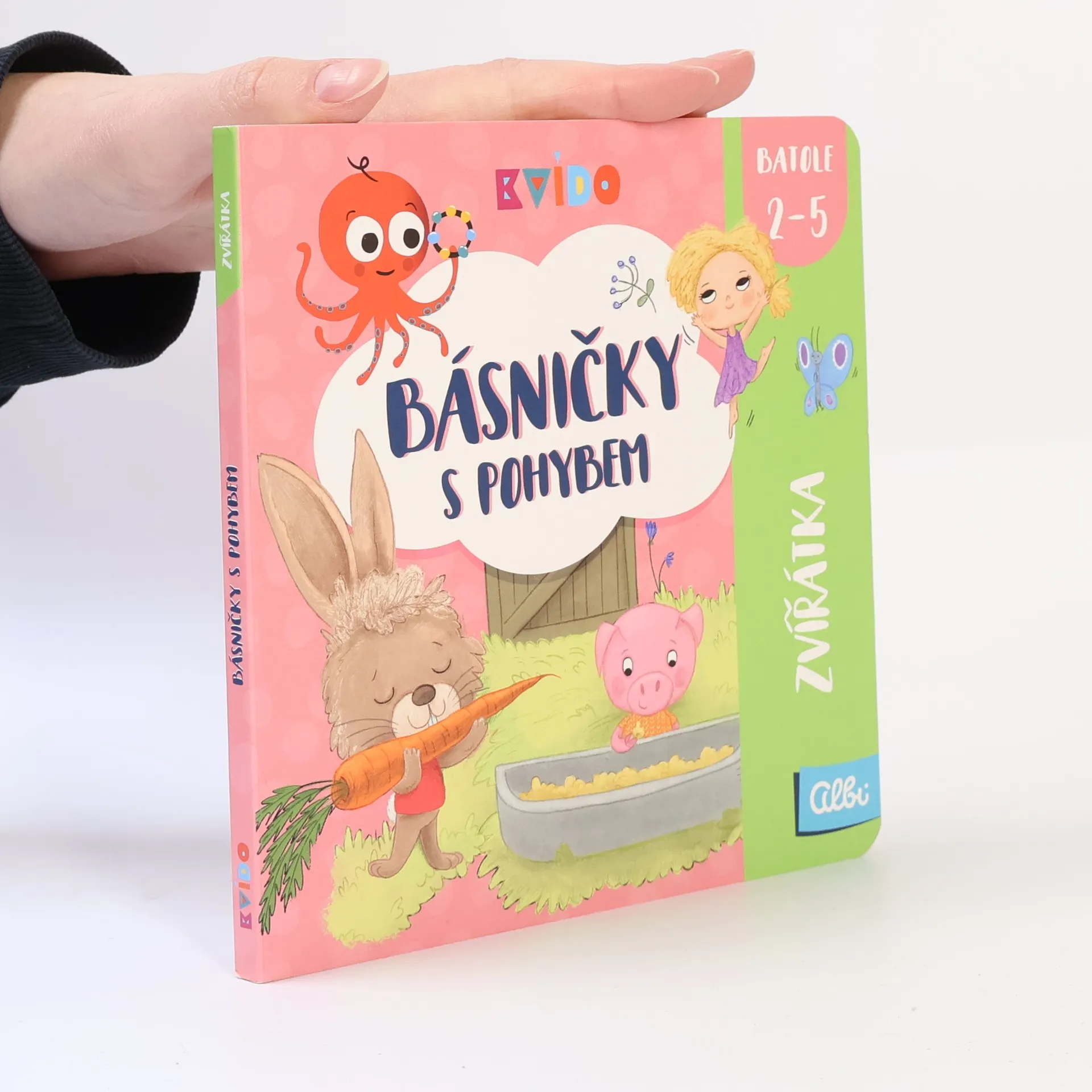 V knize Básničky s pohybem - Denní činnosti od Kvída najdete 6 rytmických básniček doplněných pestrými obrázky týkající se denních činností, jako je například vstávání či oblékání a jednoduchými pohyby a gesty je mohou již děti od 2 let zkoušet provádět společně s básničkou. Kombinace slovního a fyzického cvičení podporuje jejich koncentraci, paměť a urychluje rozvoj řeči. A navíc je to zábava!