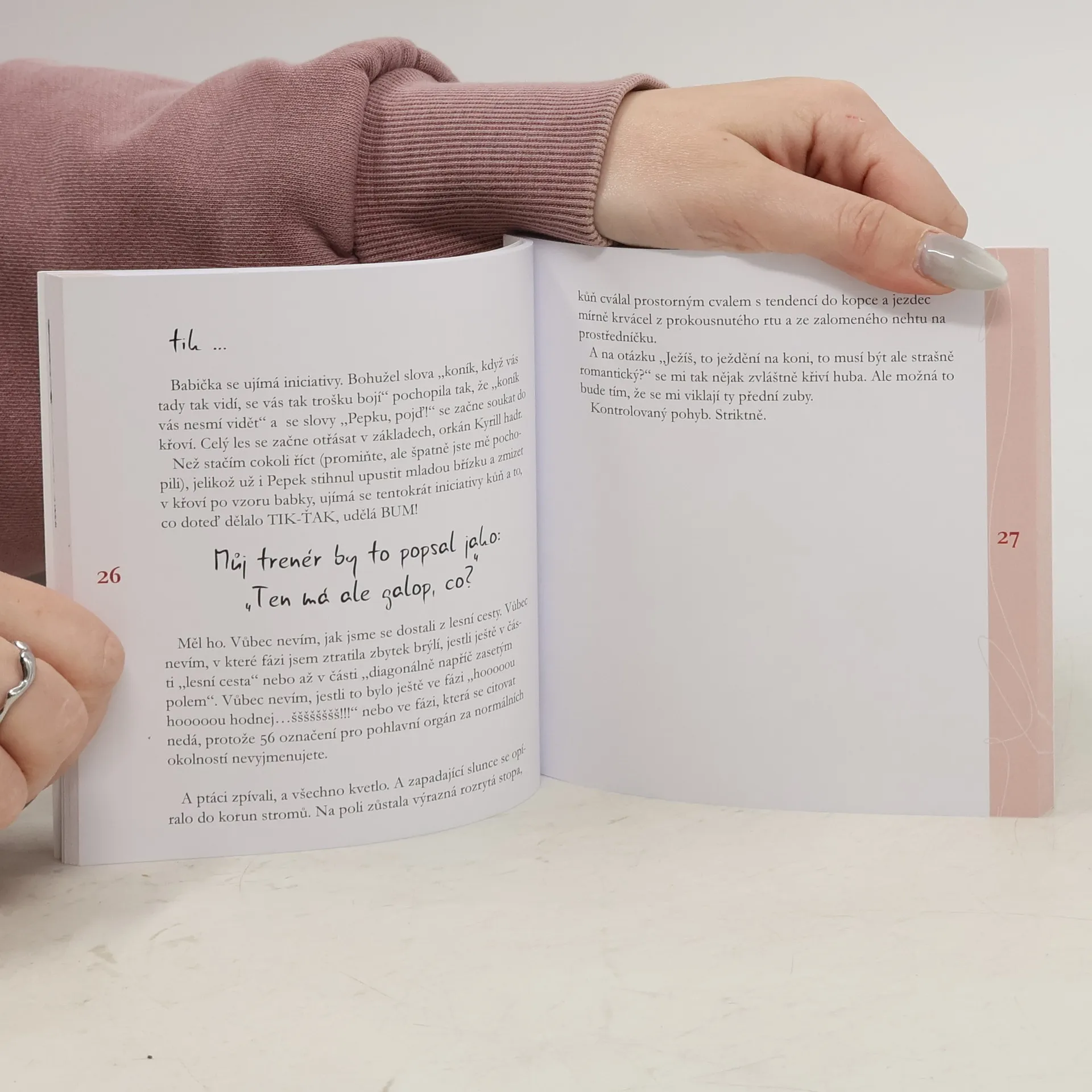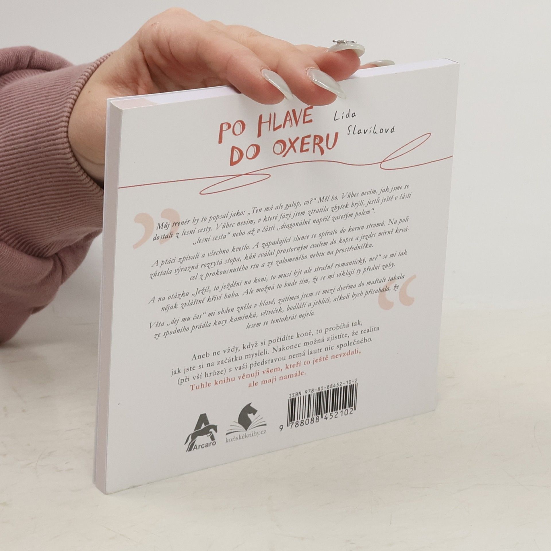 Malá, zábavná a motivační kniha známé sloupkařky, ilustrátorky a jezdkyně Lídy Slavíkové. Jak sama s úsměvem podotýká, její dílo bylo inspirováno skutečnými událostmi víc, než by bylo autorce milé."Můj trenér by to popsal jako: „Ten má ale galop, co?“ Měl ho. Vůbec nevím, jak jsme se dostali z lesní cesty. Vůbec nevím, v které fázi jsem ztratila zbytek brýlí, jestli ještě v části „lesní cesta“ nebo až v části „diagonálně napříč zasetým polem“.A ptáci zpívali a všechno kvetlo. A zapadající slunce se opíralo do korun stromů. Na poli zůstala výrazná rozrytá stopa, kůň cválal prostorným cvalem do kopce a jezdec mírně krvácel z prokousnutého rtu a ze zalomeného nehtu na prostředníčku.A na otázku „Ježíš, to ježdění na koni, to musí být ale strašně romantický, ne?“ se mi tak nějak zvláštně křiví huba. Ale možná to bude tím, že se mi viklají ty přední zuby.Věta „dej mu čas“ mi obden zněla v hlavě, zatímco jsem si mezi dveřma do maštale tahala ze spodního prádla kusy kamínků, větviček, bodláčí a jehličí, ačkoli bych přísahala, že lesem se tentokrát nejelo."Aneb ne vždy, když si pořídíte koně, to probíhá tak, jak jste si na začátku mysleli. Nakonec možná zjistíte, že realita (při vší hrůze) s vaší představou nemá lautr nic společného. Tuhle knihu věnuji všem, kteří to ještě nevzdali, ale mají namále. (Lída Slavíková)