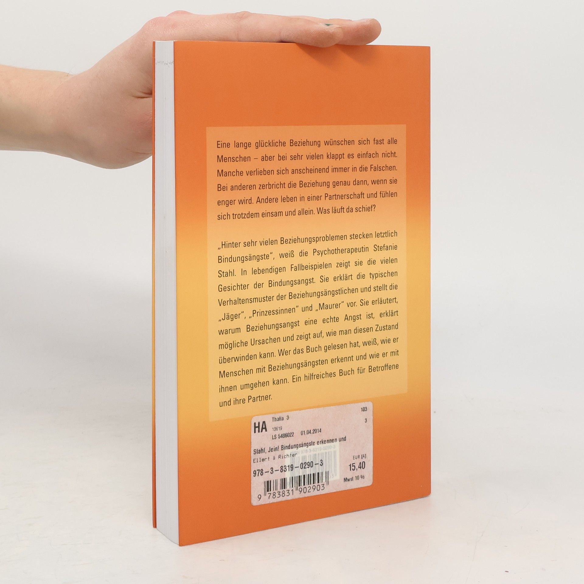 Hilfe bei Bindungsangst Stefanie Stahl – „Jein! Bindungsängste erkennen und bewältigen“ Eine lange glückliche Beziehung wünschen sich fast alle Menschen – aber bei vielen klappt es einfach nicht. Manche verlieben sich anscheinend immer in die Falschen. Bei anderen zerbricht die Beziehung genau dann, wenn sie enger wird. Wieder andere leben in einer Partnerschaft und fühlen sich trotzdem einsam und allein. Was läuft da schief? „Hinter vielen Beziehungsproblemen stecken letztlich Bindungsängste“, weiß die Psychotherapeutin Stefanie Stahl. In lebendigen Fallbeispielen zeigt sie die vielen Gesichter der Bindungsangst und erklärt die typischen Verhaltensmuster bei Bindungsphobikern. Sie stellt die unterschiedlichen Typen „Jäger“, „Prinzessinnen“ und „Maurer“ vor und erläutert, warum Bindungssangst eine echte, ernstzunehmende Angst ist. Sie erklärt mögliche Ursachen und zeigt auf, wie man durch Selbsterkenntnis und Veränderung einen Ausweg finden kann. Wer das Buch gelesen hat weiß, wie er Menschen mit Beziehungsängsten erkennt und wie er mit ihnen umgehen sollte. Ein hilfreiches Buch für Betroffene und ihre Partner.