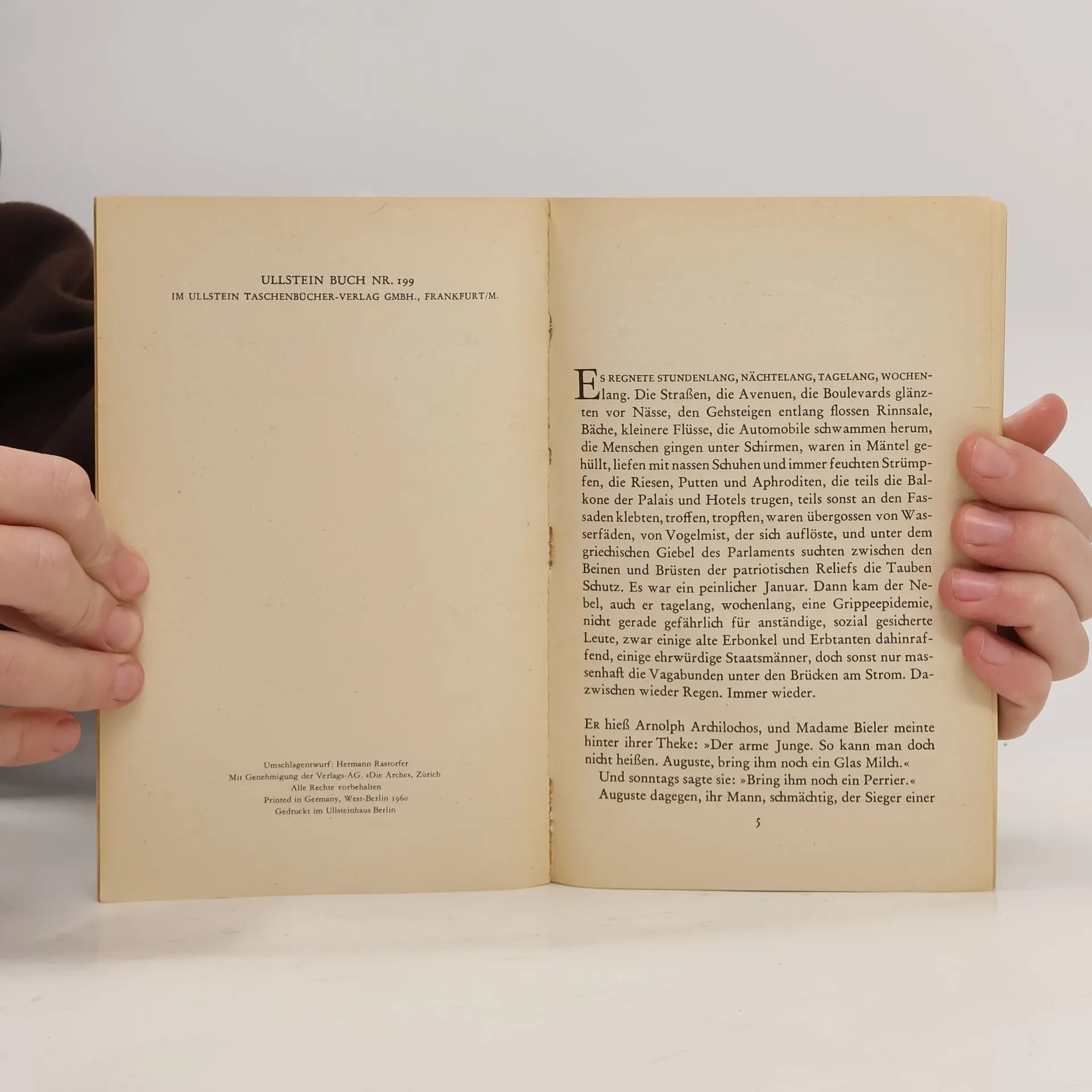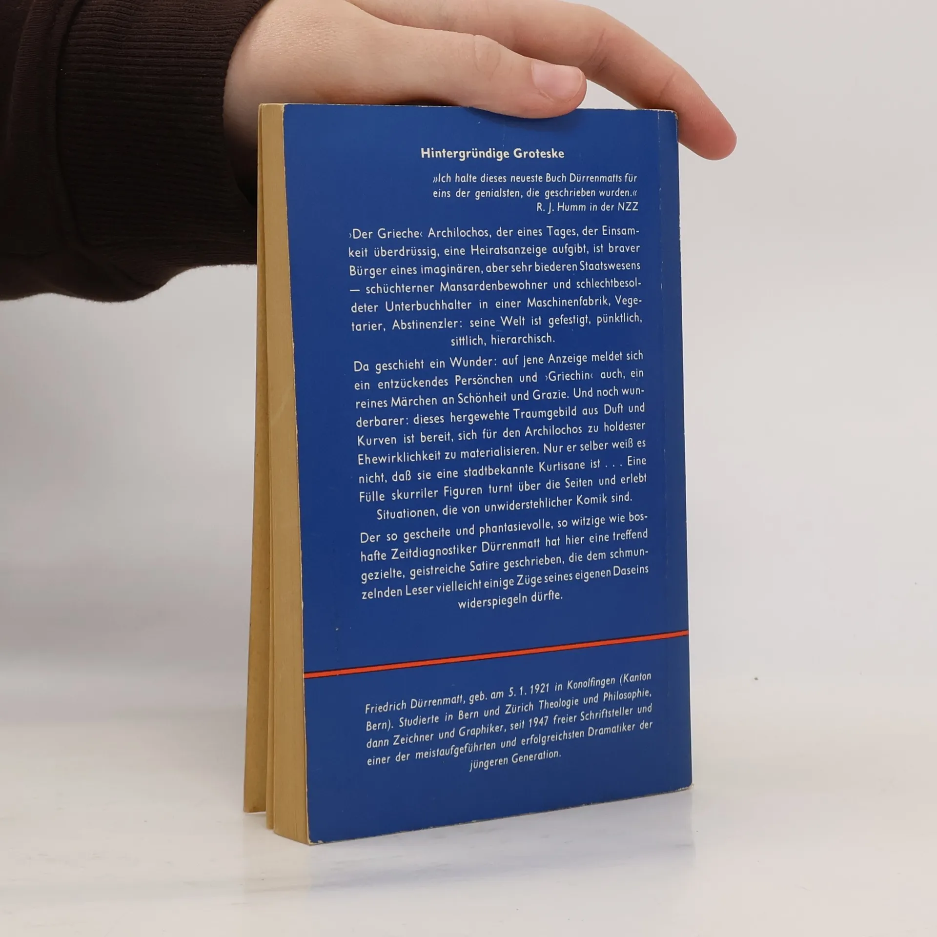'Der Grieche' Archilochos, der eines Tages, der Einsamkeit überdrüssig, eine Heiratsanzeige aufgibt, ist braver Bürger eines imaginären, aber sehr biederen Staatswesens - schüchterner Mansardenbewohner und schlechtbesoldeter Unterbuchhalter in einer Maschinenfabrik, Vegetarier, Abstinenzler: seine Welt ist gefestigt, pünktlich, sittlich, hierarchisch. Da geschieht das Wunder: auf jene Anzeige meldet sich ein entzückendes Persönchen und 'Griechin' auch, ein reines Märchen an Schönheit und Grazie. Und noch wunderbarer: dieses hergewehte Traumgebild aus Duft und Kurven ist bereit, sich für den Archilochos zu holdester Ehewirklichkeit zu materialisieren. Nur er selber weiß es nicht, dass sie eine stadtbekannte Kurtisane ist ... Eine Fülle skurriler Figuren turnt über die Seiten und erlebt Situationen, die von unwiderstehlicher Komik sind. Der so gescheite und phantasievolle, so witzige wie boshafte Zeitdiagnostiker Dürrenmatt hat hier eine treffend gezielte, geistreiche Satire geschrieben, die dem schmunzelnden Leser vielleicht einige Züge seines eigenen Daseins widerspiegeln dürfte.