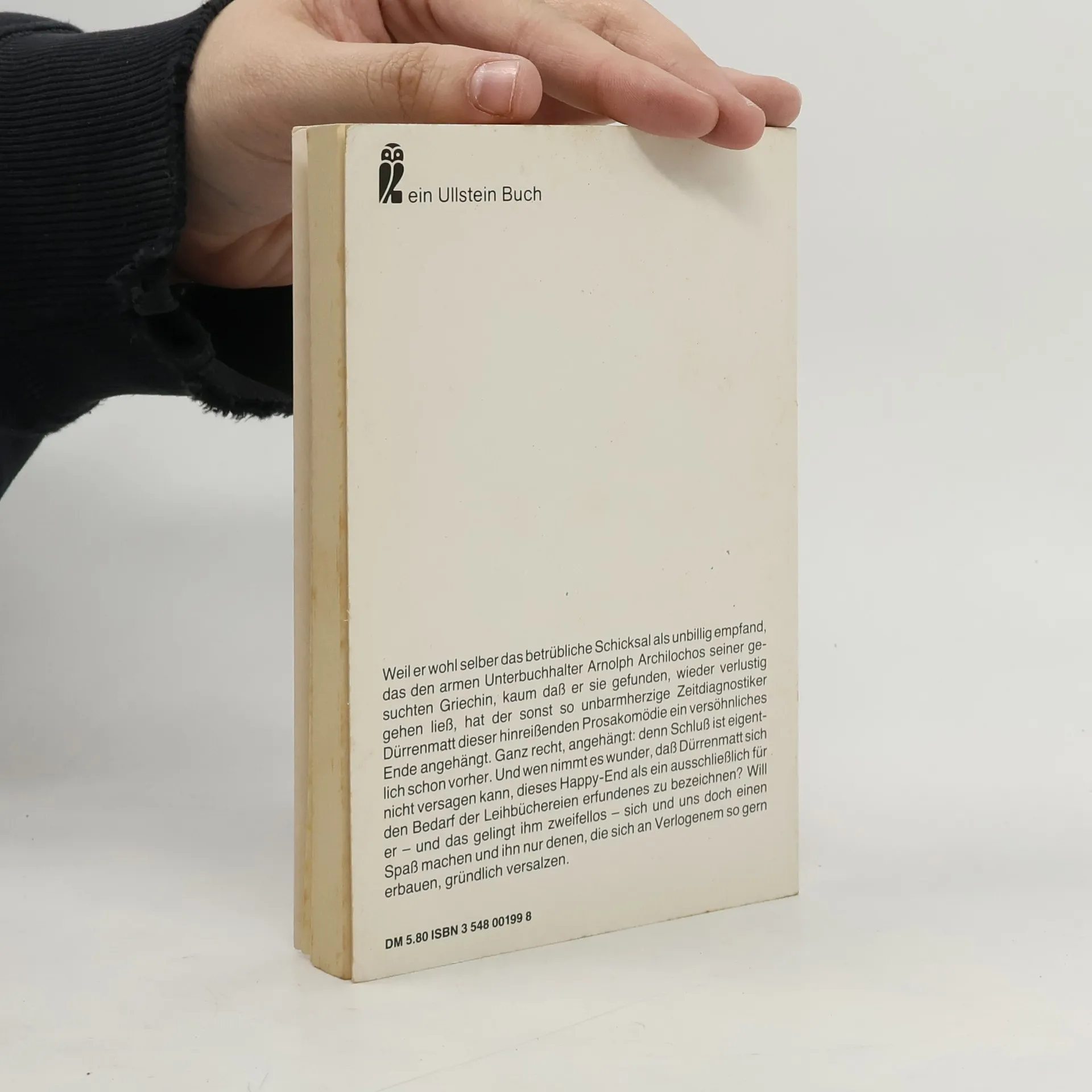 'Der Grieche' Archilochos, der eines Tages, der Einsamkeit überdrüssig, eine Heiratsanzeige aufgibt, ist braver Bürger eines imaginären, aber sehr biederen Staatswesens - schüchterner Mansardenbewohner und schlechtbesoldeter Unterbuchhalter in einer Maschinenfabrik, Vegetarier, Abstinenzler: seine Welt ist gefestigt, pünktlich, sittlich, hierarchisch. Da geschieht das Wunder: auf jene Anzeige meldet sich ein entzückendes Persönchen und 'Griechin' auch, ein reines Märchen an Schönheit und Grazie. Und noch wunderbarer: dieses hergewehte Traumgebild aus Duft und Kurven ist bereit, sich für den Archilochos zu holdester Ehewirklichkeit zu materialisieren. Nur er selber weiß es nicht, dass sie eine stadtbekannte Kurtisane ist ... Eine Fülle skurriler Figuren turnt über die Seiten und erlebt Situationen, die von unwiderstehlicher Komik sind. Der so gescheite und phantasievolle, so witzige wie boshafte Zeitdiagnostiker Dürrenmatt hat hier eine treffend gezielte, geistreiche Satire geschrieben, die dem schmunzelnden Leser vielleicht einige Züge seines eigenen Daseins widerspiegeln dürfte.