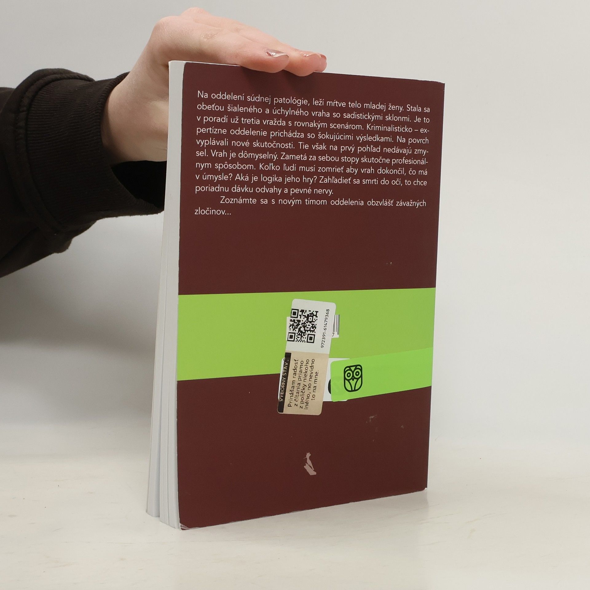 Na oddelení súdnej patológie, leží mŕtve telo mladej ženy. Stala sa obeťou šialeného a úchylného vraha so sadistickými sklonmi. Je to v poradí už tretia vražda s rovnakým scenárom. Kriminalisticko – expertízne oddelenie prichádza so šokujúcimi výsledkami. Na povrch vyplávali nové skutočností. Tie však na prvý pohľad nedávajú zmysel. Vrah je dômyselný. Zametá za sebou stopy skutočne profesionálnym spôsobom. Koľko ľudí musí zomrieť aby vrah dokončil, čo má v úmysle? Aká je logika jeho hry? Zahľadieť sa smrti do očí, to chce poriadnu dávku odvahy a pevné nervy. Zoznámte sa s novým tímom oddelenia obzvlášť závažných zločinov... O autorovi Som detektív, toto je môj pseudonym (pochopiteľne). Kniha z profesionálneho i osobného života je plná napätia i suchého humoru. Mám menej než 2 metre. Pracujem na Oddelení všeobecnej kriminality a mojou snahou je, aby ste i vy, čitatelia, trochu privoňali k prostrediu, z môjho uhla pohľadu. Chcem vám ponúknuť čosi, čoho za normálnych okolností nikdy nebudete svedkami. Otvorím vám dvere do môjho profi života, zároveň trochu pootvorím súkromie. Že píšem pod pseudonymom, iste chápete. Vdovec, otec maloletej dcéry, 6-ročnej Julky.