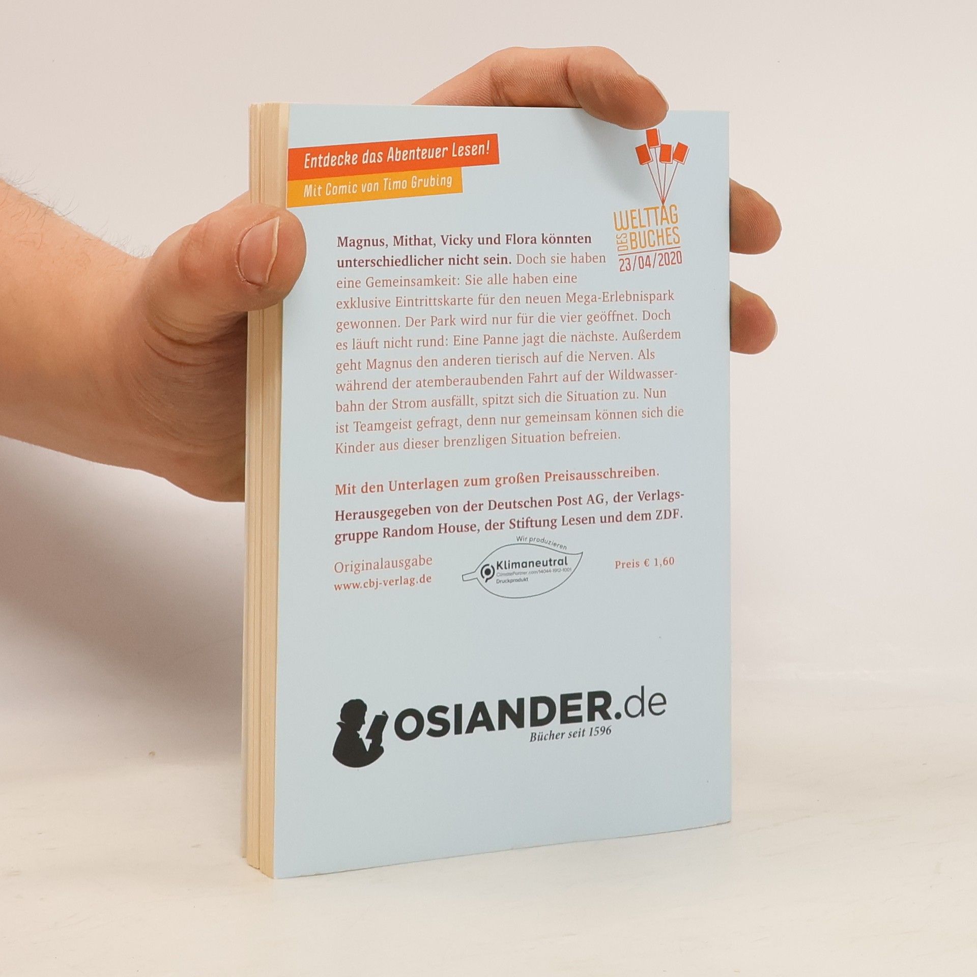Ein Freizeitpark, vier unterschiedliche Kinder und ein großes Abenteuer, das sie nur gemeinsam bestehen können! Magnus, Mithat, Vicky und Flora könnten unterschiedlicher nicht sein. Doch sie alle haben eine Gemeinsamkeit: Sie haben das große Los gezogen und in einem Preisausschreiben eine exklusive Eintrittskarte für den neuen Mega-Erlebnispark gewonnen. Der Park ist am Premierentag nur für die vier geöffnet. Doch es läuft nicht rund: Eine Panne jagt die nächste. Außerdem geht Magnus den anderen mit seinem obercoolen Gehabe tierisch auf die Nerven. Als dann während der atemberaubenden Fahrt auf der Wildwasserbahn auch noch der Strom ausfällt, spitzt sich die Situation zu. Nun ist Teamgeist gefragt, denn nur gemeinsam können sich die Kinder aus dieser brenzligen Situation befreien. Ausstattung: Mit s/w Illustrationen und Comic