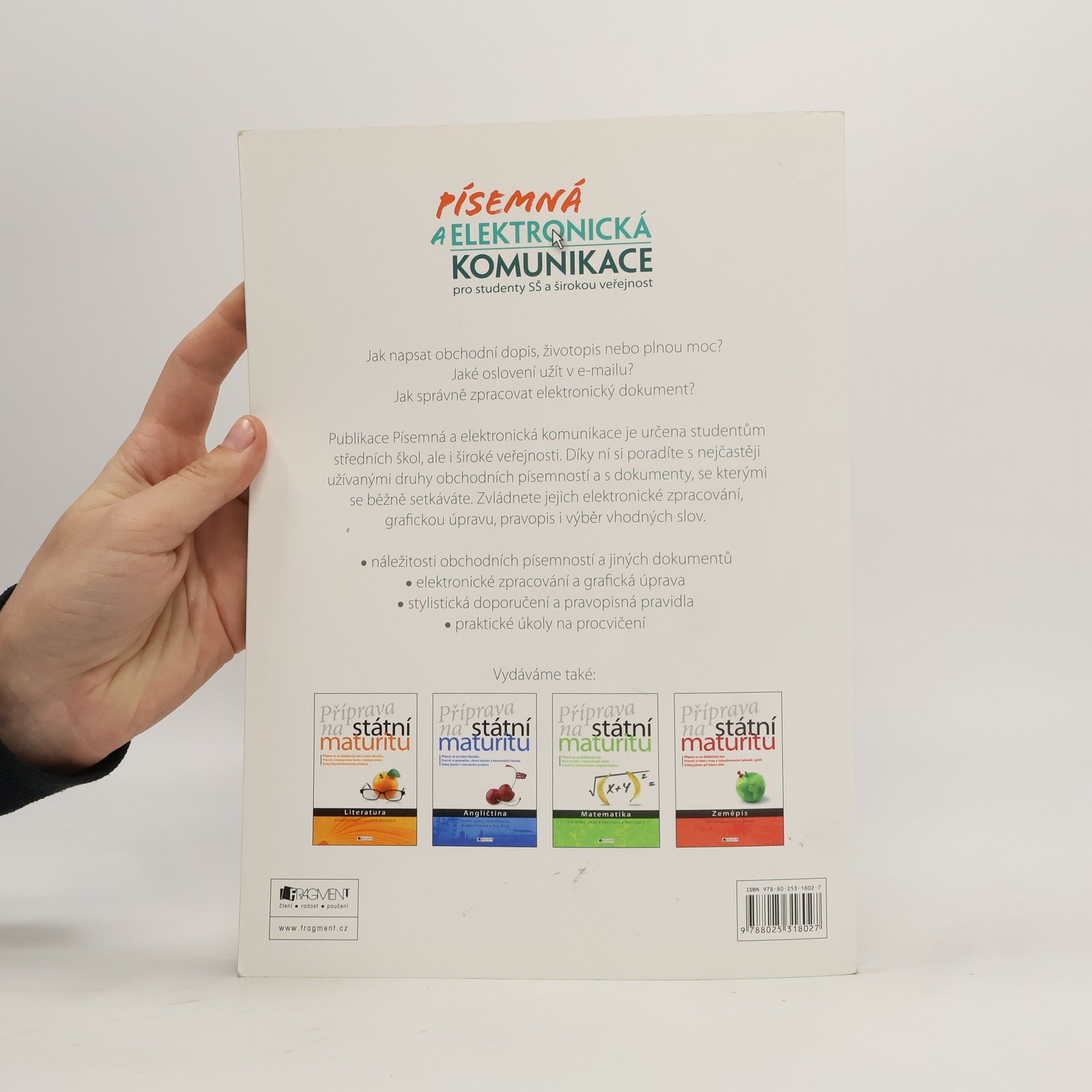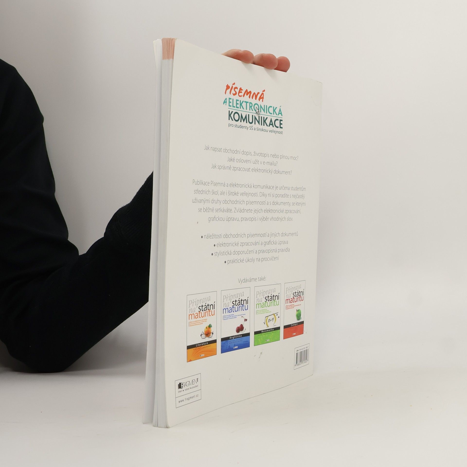 Jak napsat obchodní dopis, životopis nebo plnou moc? Jaké oslovení užít v e-mailu? Jak správně zpracovat elektronický dokument? Publikace Písemná a elektronická komunikace je určena studentům středních škol, ale i široké veřejnosti. Díky ní si poradíte s nejčastěji užívanými druhy obchodních písemností a s dokumenty, se kterými se běžně setkáváte. Zvládnete jejich elektronické zpracování, grafickou úpravu, pravopis i výběr vhodných slov. - náležitosti obchodních písemností a jiných dokumentů - elektronické zpracování a grafická úprava - stylistická doporučení a pravopisná pravidla - praktické úkoly na procvičení