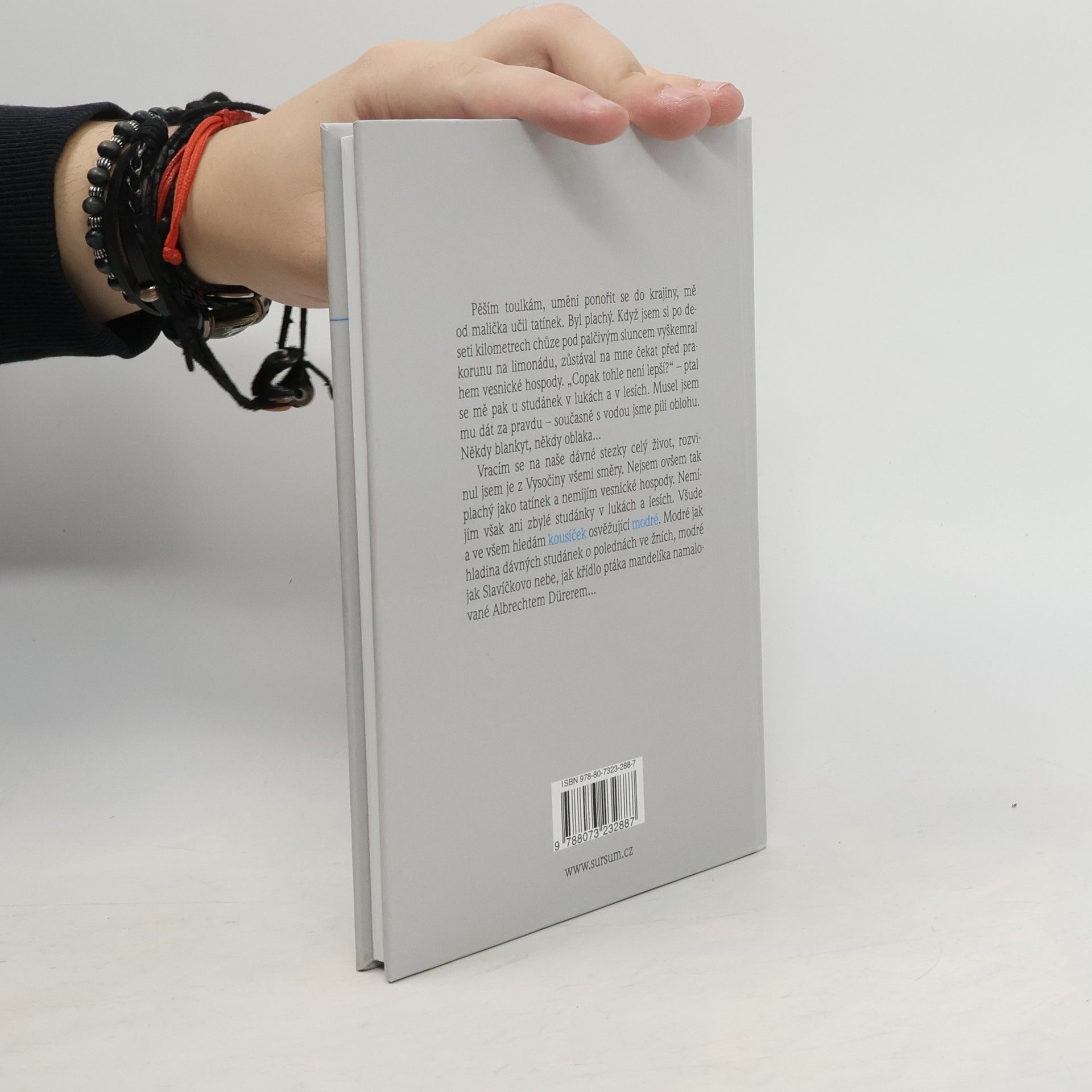 Sbírka poetických esejí Jana Laciny, mající vztah především k oblasti Českomoravské vrchoviny. Pěším toulkám a umění ponořit se do krajiny se autor naučil už v dětství od svého otce. Od té doby všude a ve všem hledá kousíček osvěžující modré. Modré jak hladina dávných studánek o polednách ve žních, modré jak Slavíčkovo nebe, jak křídlo ptáka mandelíka namalované Albrechtem Dürerem...