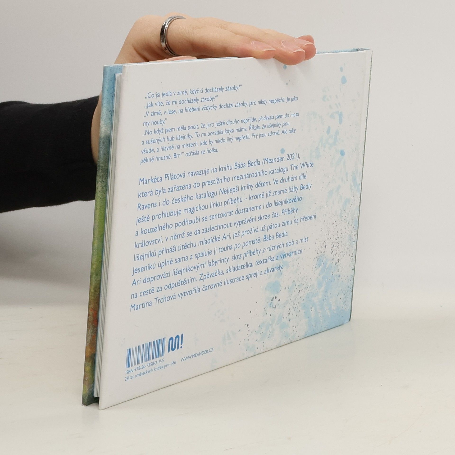 Markéta Pilátová navazuje na knihu Bába Bedla, která byla zařazena do prestižního mezinárodního katalogu The White Ravens i do českého katalogu Nejlepší knihy dětem. Ve druhém díle ještě prohlubuje magickou linku příběhu – kromě již známé báby Bedly a kouzelného podhoubí se tentokrát dostaneme i do lišejníkového království, v němž se dá zaslechnout vyprávění skrze čas. Příběhy lišejníků přináší útěchu mladičké Ari, jež prožívá už šestou zimu na hřebeni Jeseníků úplně sama a spaluje ji touha po pomstě. Bába Bedla Ari doprovází lišejníkovými labyrinty, skrz příběhy z různých dob a míst na cestě za odpuštěním.Zpěvačka, skladatelka, textařka a výtvarnice Martina Trchová vytvořila čarovné ilustrace spreji a akvarely.