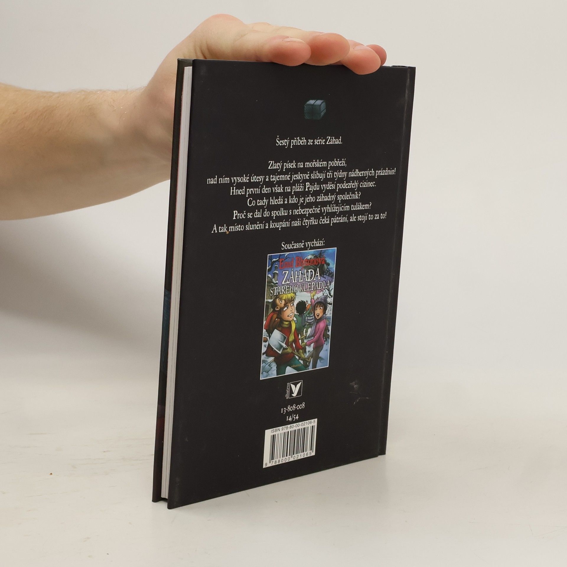 Šestý a zároveň poslední titul ze série „Záhady“ populární britské autorky. Hrdiny jsou opět Roger, Diana, Pajda a Barny a velcí kamarádi pes Ťulpa a opička Miranda. Děti tráví tentokrát prázdniny na mořském pobřeží – v Merlinově zátoce. Zlatý písek, vysoké útesy a záhadné jeskyně slibují tři týdny báječných prázdnin se spoustou koupání, slunění a rybaření. Z plánů na poklidné koupání nezbyde nic.