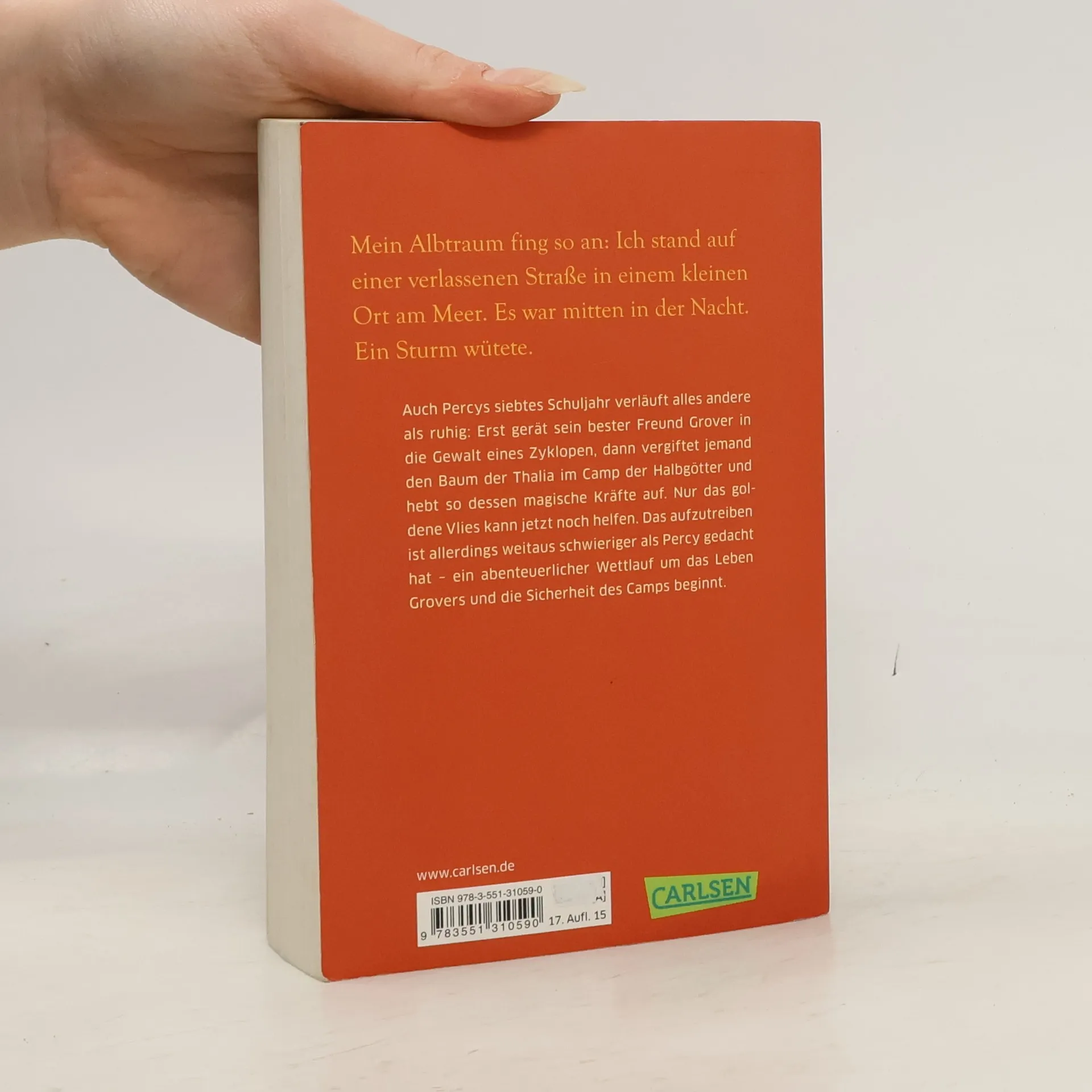 Auch Percys siebtes Schuljahr verläuft nicht wirklich ruhig: Erst gerät sein bester Freund Grover in die Gewalt eines Zyklopen, dann vergiftet jemand den Baum der Thalia im Camp der Halbgötter und hebt so dessen magische Kräfte auf. Nur das goldene Vlies kann jetzt noch helfen. Das aufzutreiben ist allerdings weitaus schwieriger als Percy gedacht hat - ein abenteuerlicher Wettlauf um das Leben Grovers und die Sicherheit des Camps beginnt.