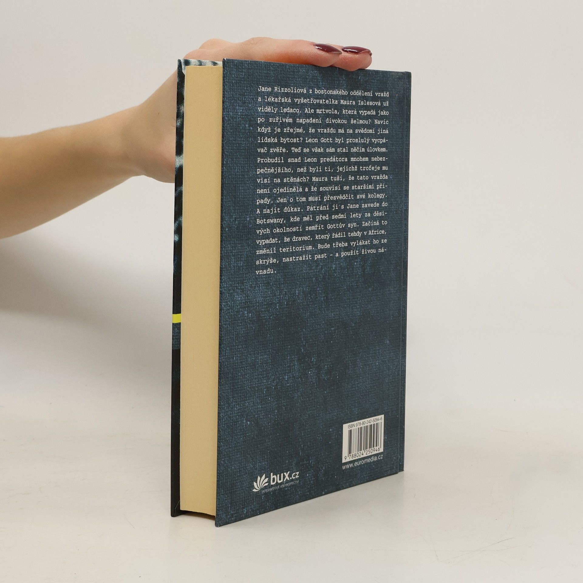 Rizzoliová a Islesová už viděly ledaco. Ale mrtvola, která vypadá jako po zuřivém napadení divokou šelmou? Navíc když je zřejmé, že vraždu má na svědomí jiná lidská bytost? Leon Gott byl proslulý vycpávač zvěře. Teď se však sám stal něčím úlovkem. Probudil snad Leon predátora mnohem nebezpečnějšího, než byli ti, jejichž trofeje mu visí na stěnách? Doktorka Islesová tuší, že tato vražda není ojedinělá a že souvisí se staršími případy. Jen o tom musí přesvědčit své kolegy. A najít důkaz. Pátrání ji s detektivem Rizzoliovou zavede do Botswany, kde měl před sedmi lety za děsivých okolností zemřít Gottův syn. Začíná to vypadat, že dravec, který řádil tehdy v Africe, změnil teritorium. Bude třeba vylákat ho ze skrýše, nastražit past – a použít živou návnadu.