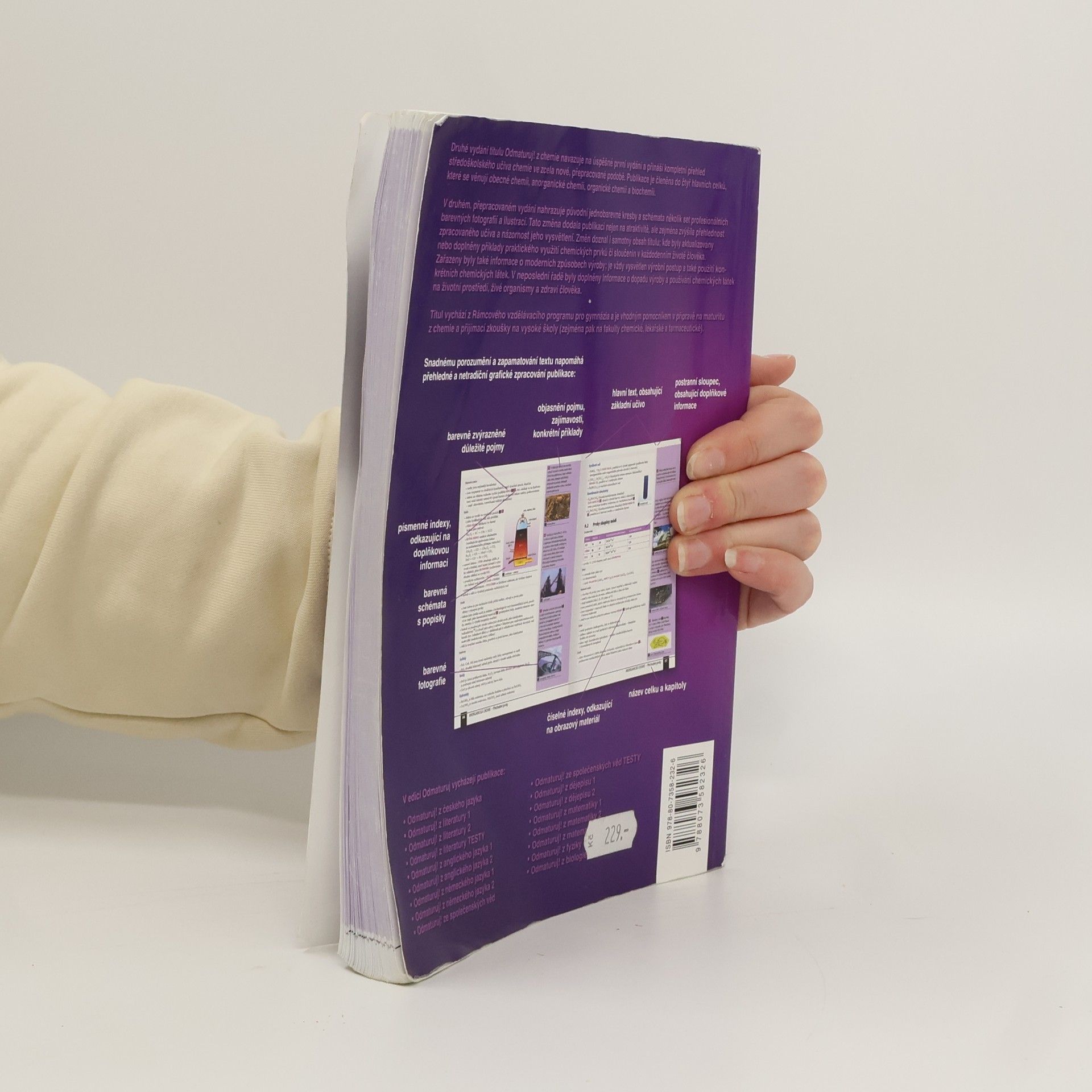 •Poutavá učebnice určená k přípravě na maturitu (i k nové podobě maturity) a k přijímacím zkouškám na vysoké školy. •Obsahuje celou středoškolskou látku chemie, poznatky z obecné chemie, anorganické a organické chemie a biochemie. •Kniha je přehledně zpracována do 38 kapitol, které jsou dále členěny na menší podkapitoly, příp. i menší tematické celky. •Snadnou orientaci v textu podporuje grafické odlišení ústředního textu od doplňujících poznámek a zajímavostí a barevné zvýraznění základních pojmů. •Text je doplněn mnoha přehlednými tabulkami a názornými schématy. •Určeno studentům všech středních škol během celého středoškolského studia, jejich učitelům a ostatním zájemcům o studium chemie.