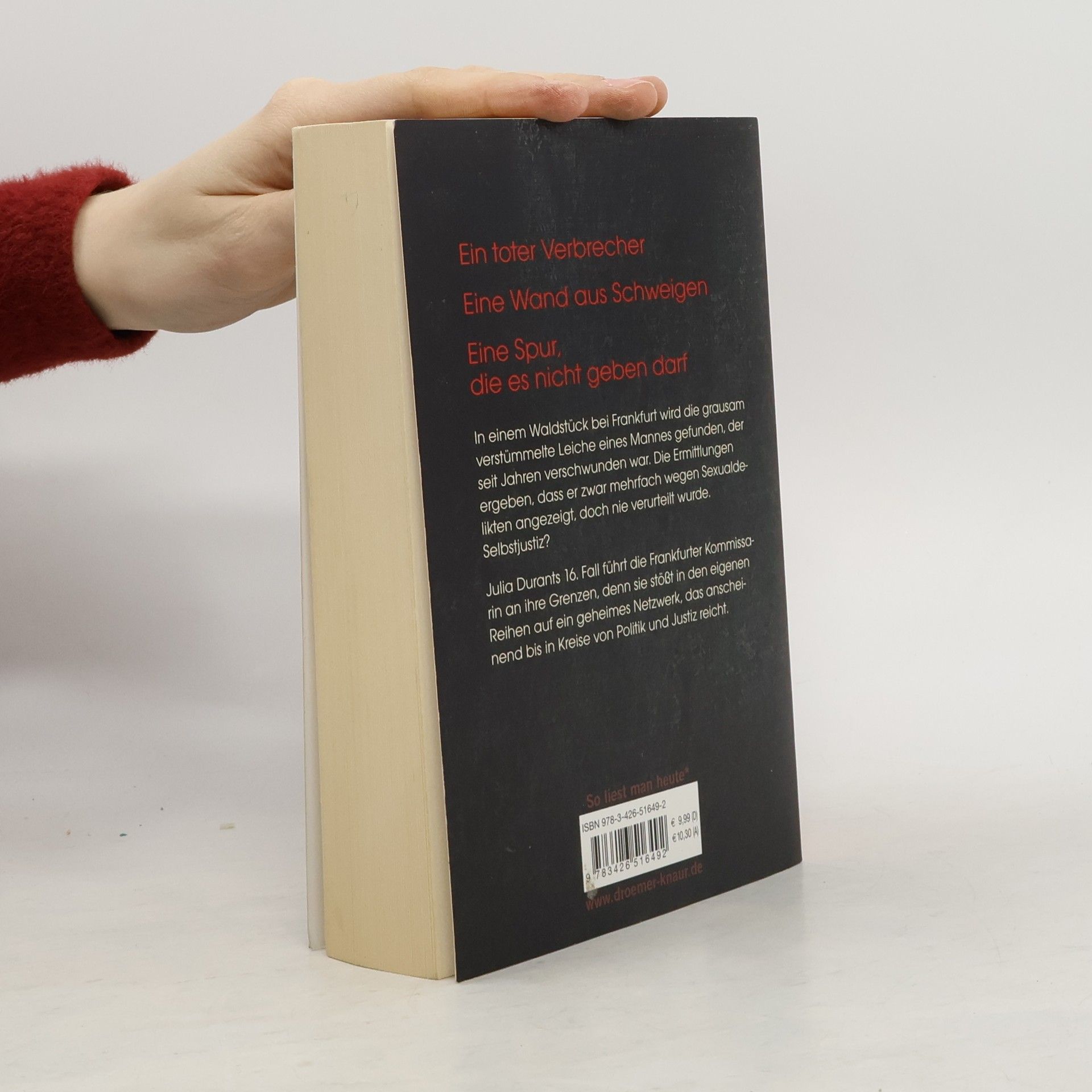 In einem Waldstück bei Frankfurt wird die Leiche eines Sexualstraftäters gefunden, der seit Jahren als vermisst galt. Die Ermittlungen ergeben, dass der Mann zwar mehrfach verdächtigt, doch nie verurteilt wurde. In den Akten tauchen immer wieder derselbe Richter und dieselben Anwälte auf – Zufall? Die brutalen Verletzungen des Mordopfers lassen auf ein sehr persönliches Motiv schließen. Und auf große Wut. Und während Julia Durant sich noch mit der Frage herumschlägt, wem sie hier eigentlich zu Gerechtigkeit verhilft, muss sie erkennen, dass ihr der Gegenwind auch aus den eigenen Reihen entgegenschlägt.