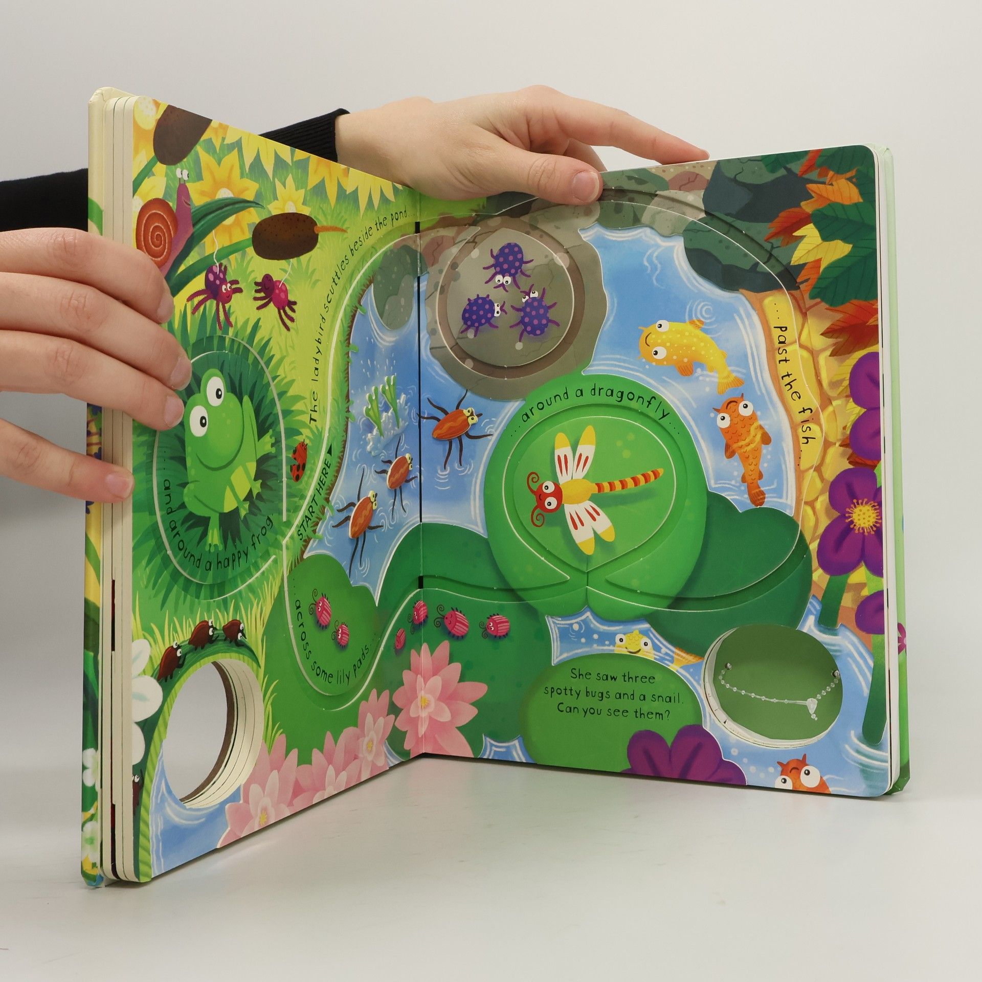 Engaging young readers, this interactive book features a ladybird toy that moves along tracks embedded in each page. As it journeys through a vibrant garden, children can observe various elements like flowers, vegetables, and other insects such as bees and butterflies. The simple narrative encourages exploration and conversation, making it a delightful experience for little ones to learn about nature while enjoying a playful story.
