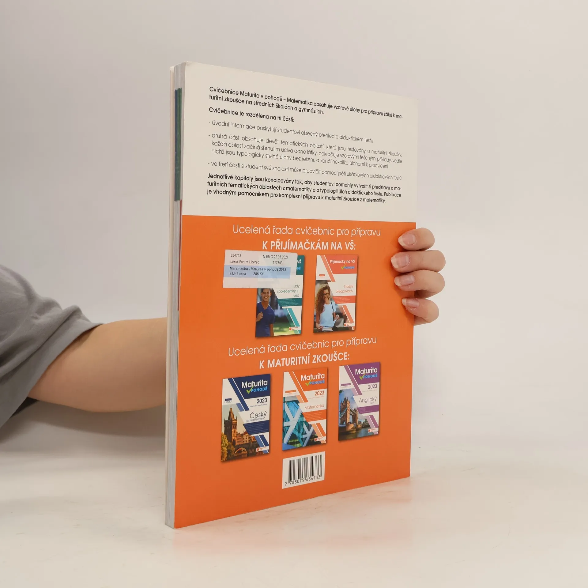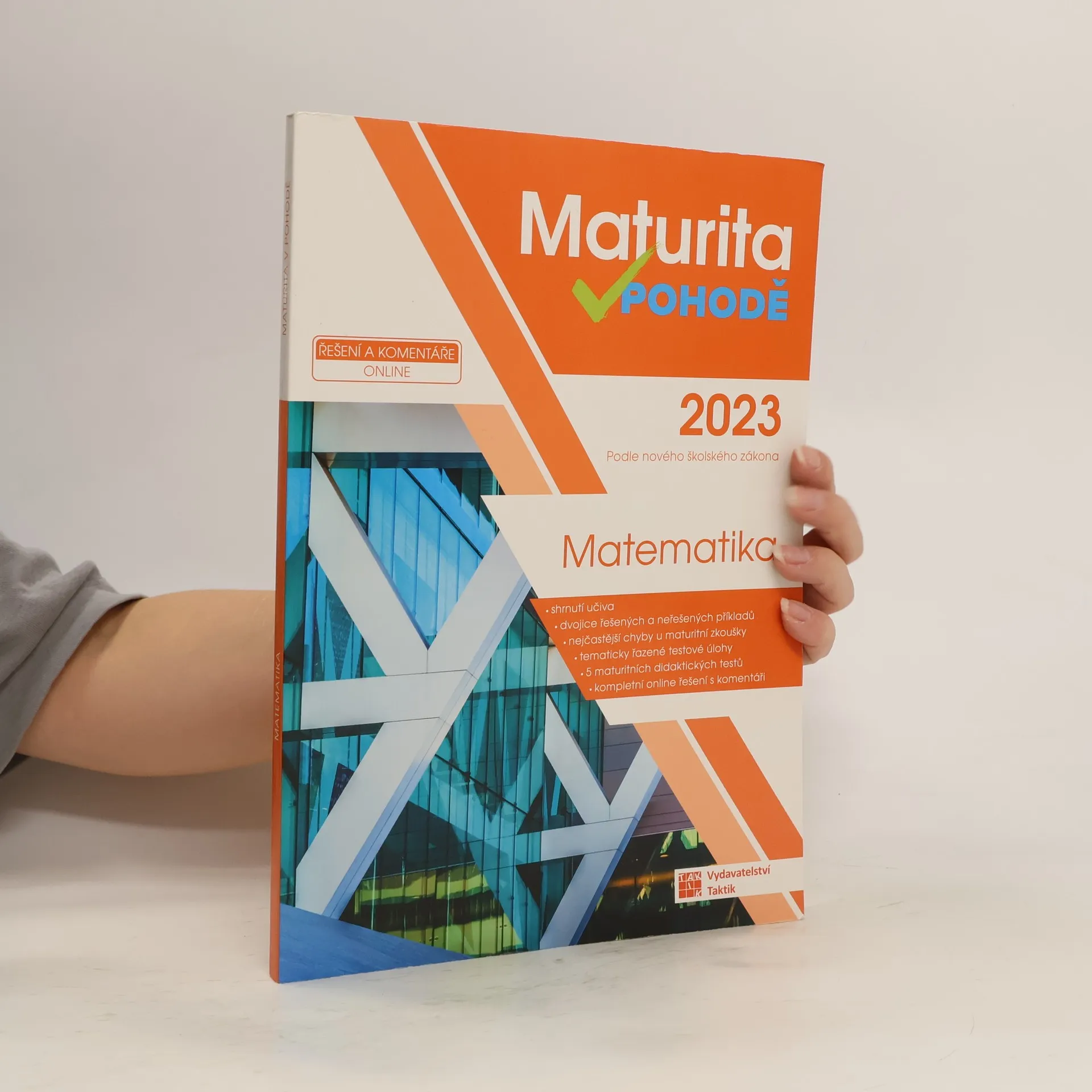 Cvičebnice Maturita v pohodě – matematika obsahuje materiály pro komplexní přípravu na Jednotou přijímací zkoušku (JPZ) na střední školy se studiem ukončeným maturitní zkouškou. Příručka obsahuje 9 testovacích okruhů. Každý okruh se skládá ze shrnutí učiva, aby si žák mohl zopakovat potřebnou látku, dvojic řešených a neřešených úloh, kde si žák může prohlédnout vyřešené a podle nich vypočítat ty neřešené, a tím se seznámit s typologií úloh v didaktickém testu. Následují vypracované úlohy, ve kterých se v minulých letech nejvíce chybovalo s radami, jak se chybám vyhnout. Okruh uzavírají úlohy k procvičení. Nakonec si své znalosti muže žák procvičit pomocí 5 ukázkových didaktických testu i s odpovědními archy. K cvičebnici je navíc e-learning s videi vysvětlujícími učivo a dalšími úlohami. Přístup získáte po zaregistrování a zadání přístupového kódu na studium.vpohode.cz, kde najdete vypracovaná řešení a odpovědní archy k úlohám z příručky.