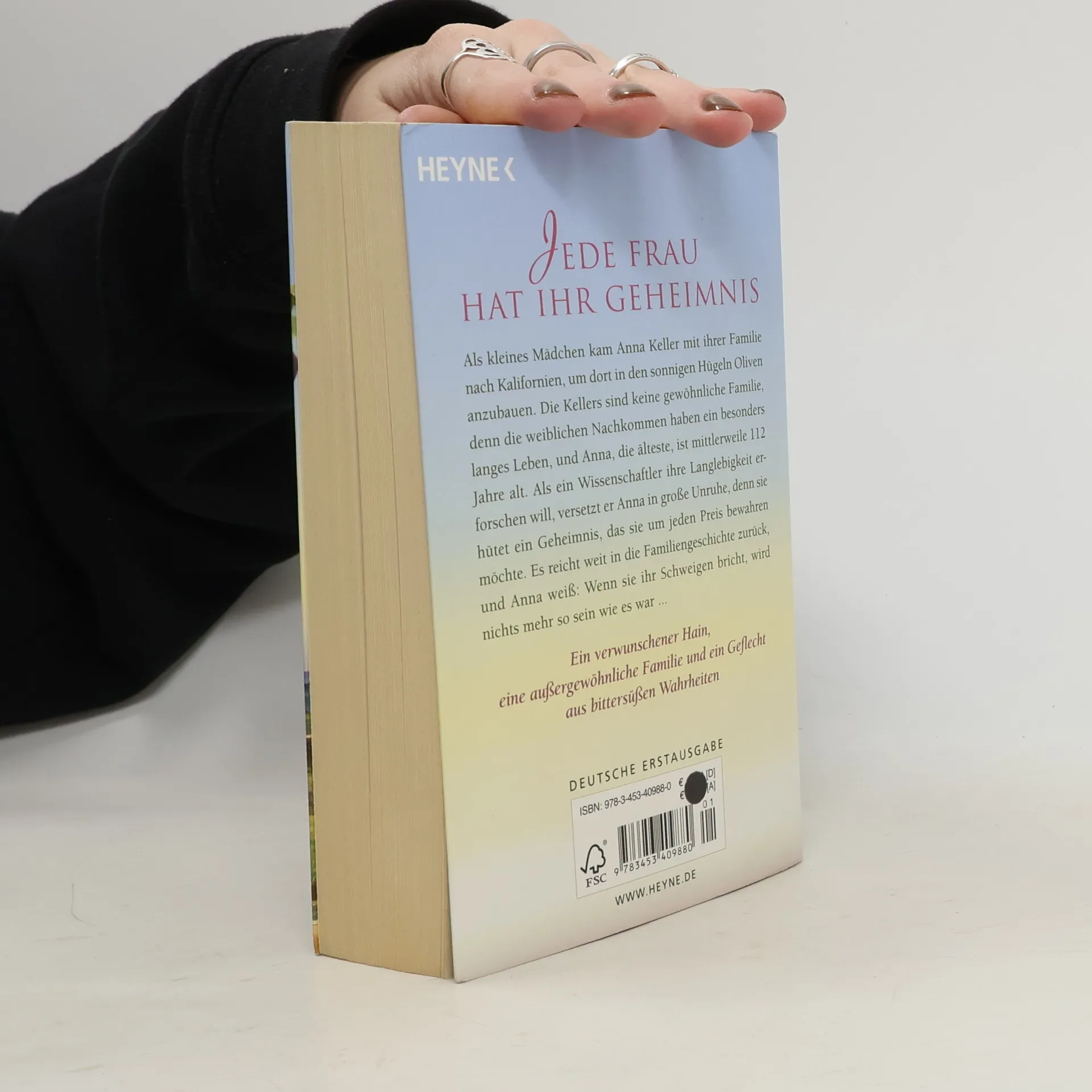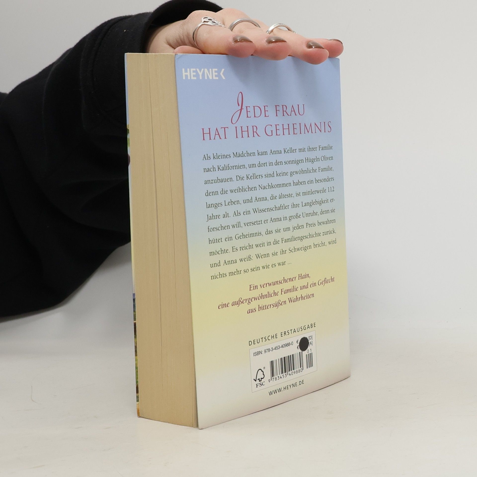 Sonnige Hügel, köstliche Oliven und das Geheimnis des Glücks Seit vielen Generationen leben die Kellers im sonnigen Kildron und bauen Oliven an. Sie sind keine gewöhnliche Familie, denn durch eine besondere Veranlagung haben die weiblichen Nachkommen ein besonders langes Leben, und die älteste, Anna, ist 112 Jahre alt. Als ein Forscher auf die Familie aufmerksam wird, versetzt er sie in große Unruhe. Auf der Suche nach dem Grund der mysteriösen Langlebigkeit stößt er auf ein Netz aus gut gehüteten Familiengeheimnissen, und es kommen einige Wahrheiten ans Tageslicht, denen die Keller-Frauen bisher immer aus dem Weg gegangen sind. Von da an ist nichts mehr, wie es war ...
