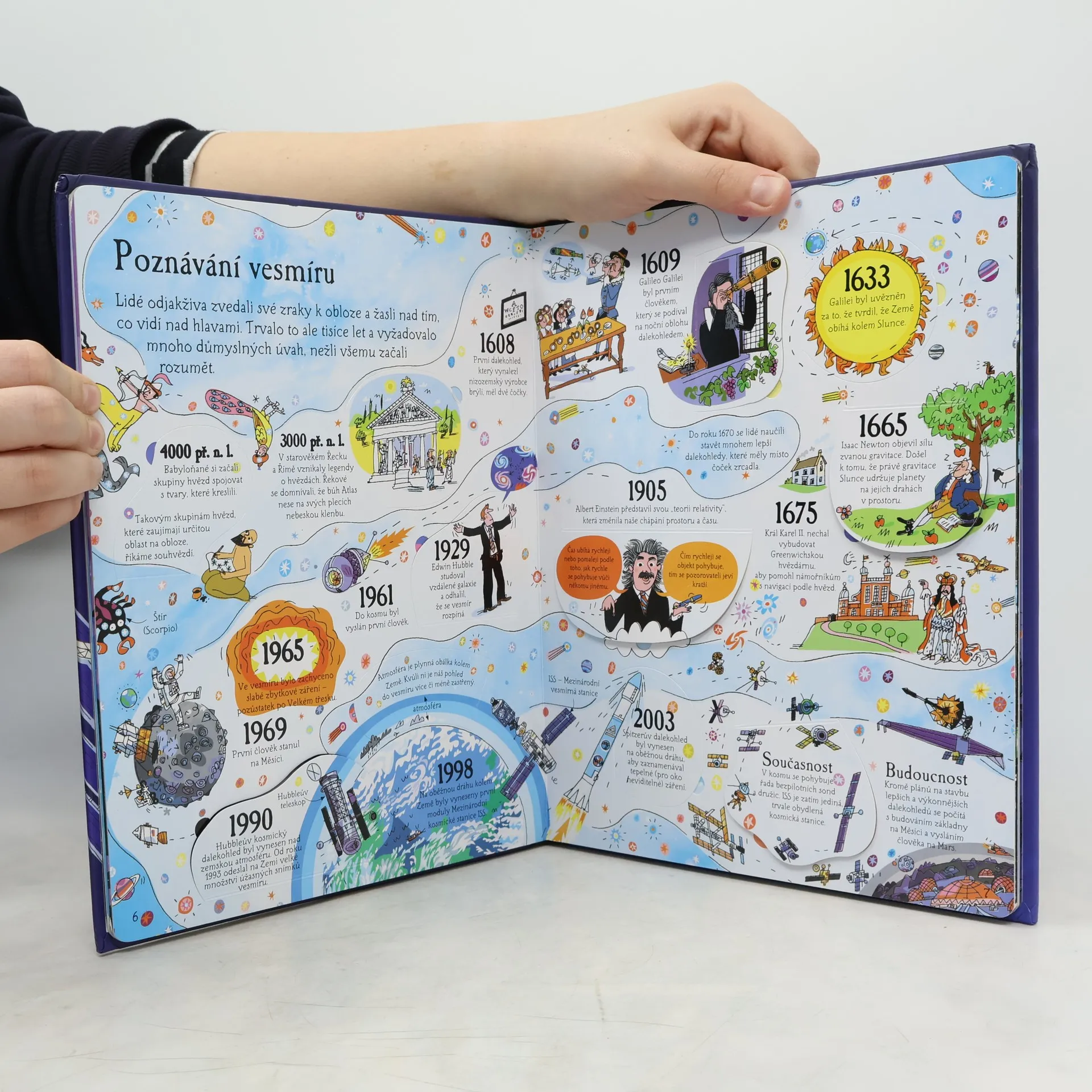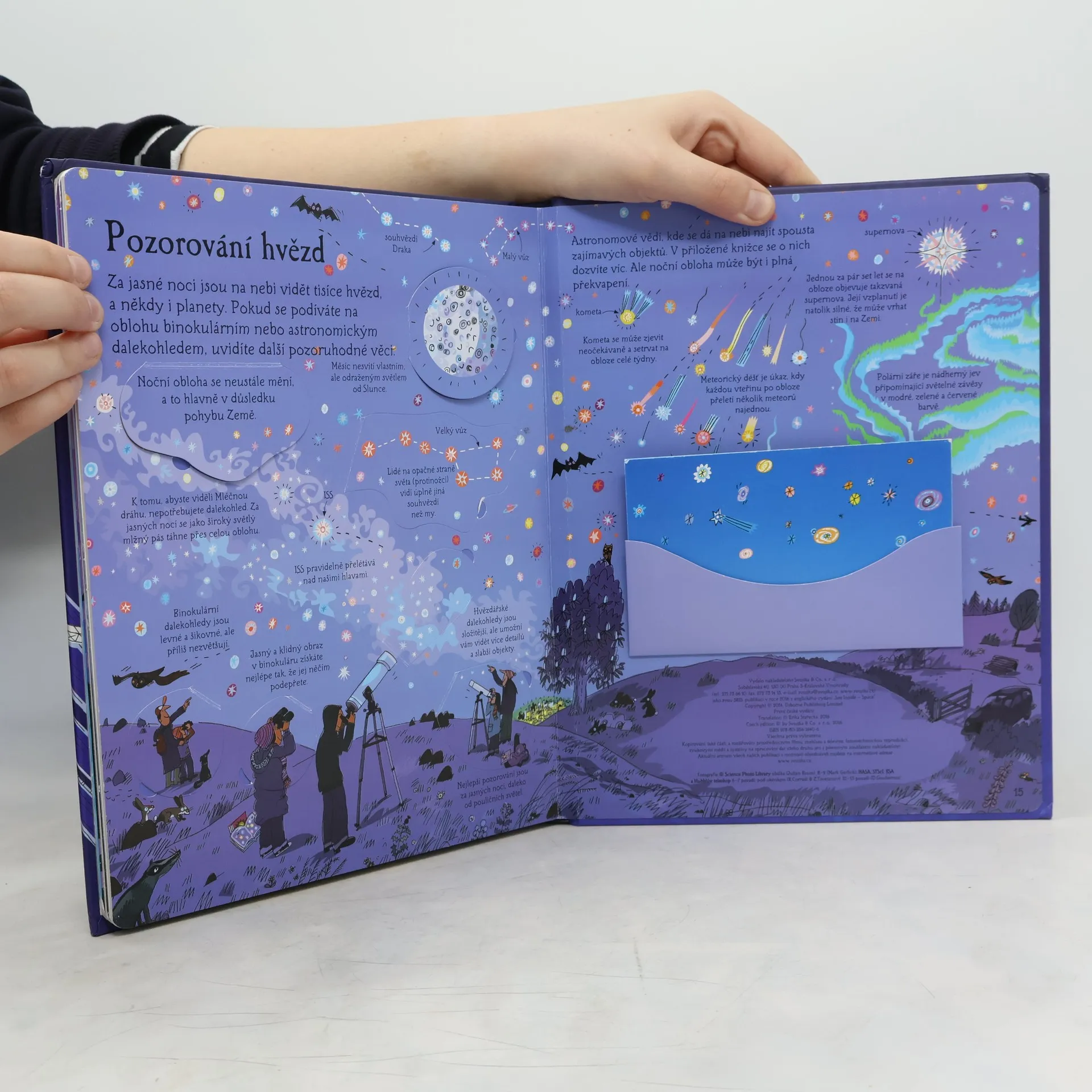 Co všechno se nachází ve vesmíru? Jak to všechno vzniklo? A jak to vlastně víme? Jaká je naše rodná galaxie a sluneční soustava? Víš něco o historii vesmíru? Jak je možné pozorovat hvězdy? Jak a proč se létá do vesmíru? Podívej se pod více než 50 odklápěcích okének této knihy a prozkoumej s ní jedinečný a tajuplný vesmír. Kromě mnoha údajů a zajímavostí uvnitř navíc ještě najdeš malou knížku Mapy oblohy. Sleduj tedy příběh úžasného vesmíru od samého počátku až po kosmické lety v budoucnu a nahlédni za oponu halící jeho tajemství.
