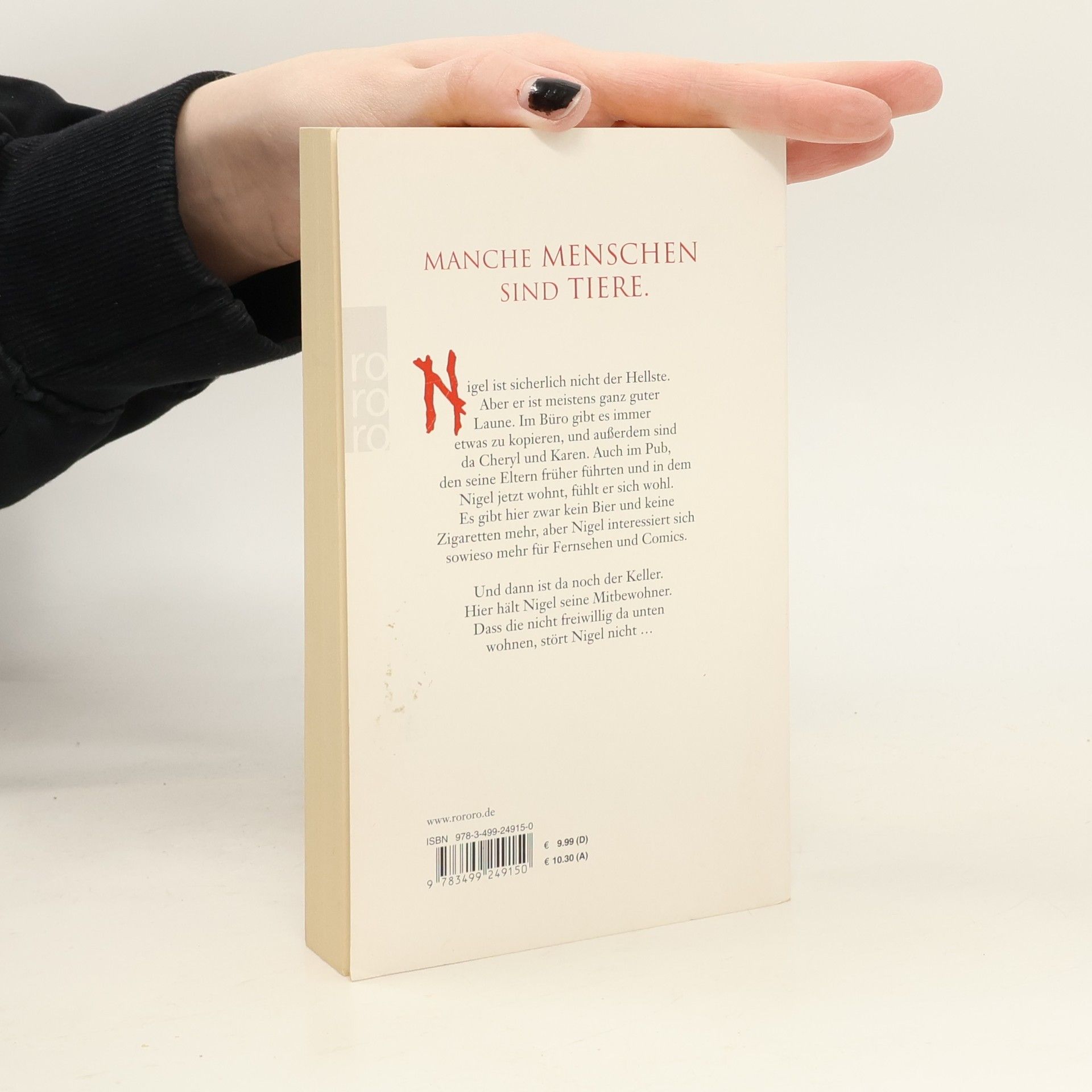 Manche Menschen sind Tiere.Nigel ist sicherlich nicht der Hellste. Aber er ist meistens ganz guter Laune. Im Büro gibt es immer etwas zu kopieren, und außerdem sind da Cheryl und Karen. Auch im Pub, den seine Eltern früher führten und in dem Nigel jetzt wohnt, fühlt er sich wohl. Es gibt hier zwar kein Bier und keine Zigaretten mehr, aber Nigel interessiert sich sowieso mehr für Fernsehen und Comics.Und dann ist da noch der Keller. Hier hält Nigel seine Mitbewohner. Dass die nicht freiwillig da unten wohnen, stört Nigel nicht …
