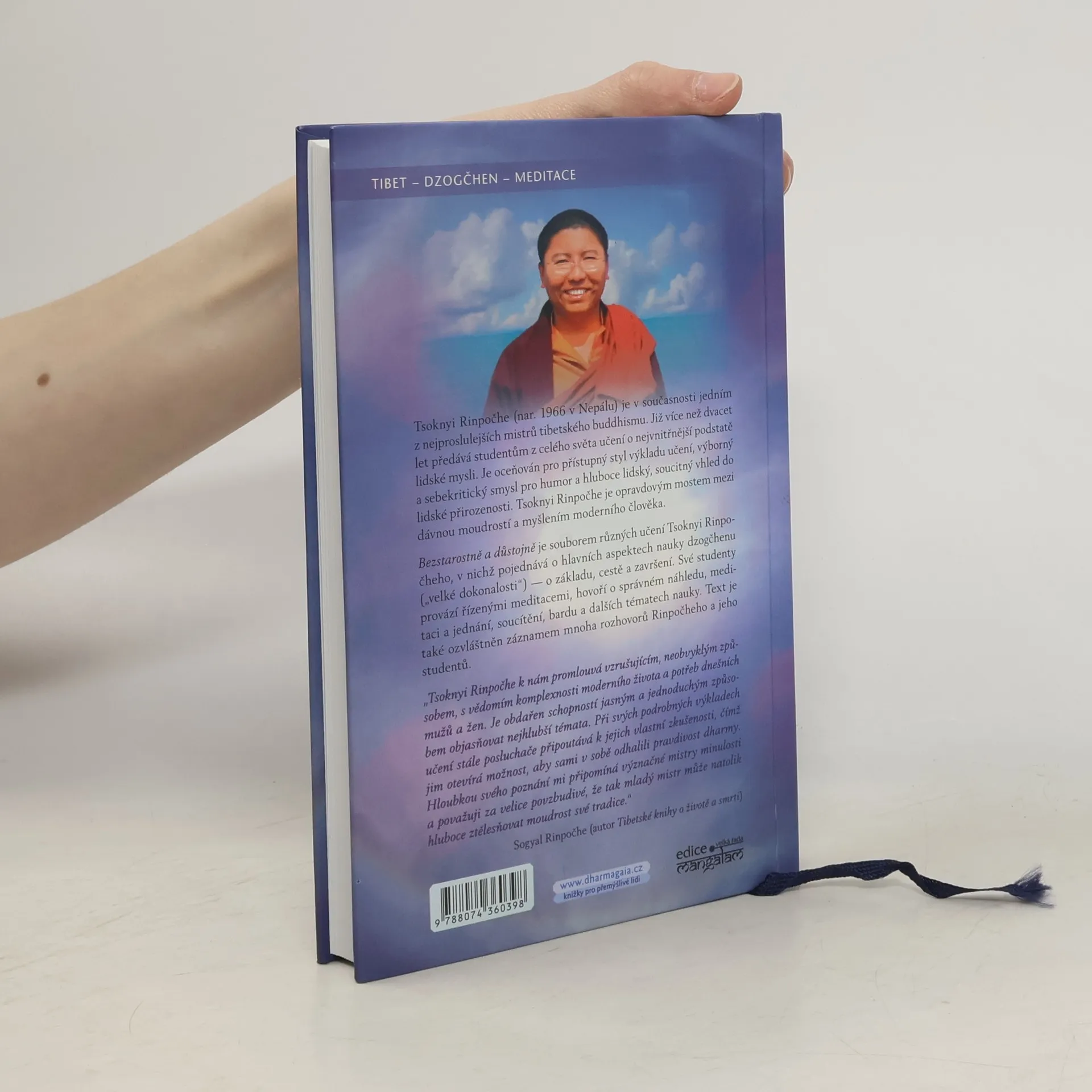 Tsoknyi Rinpočhe (nar. 1966 v Nepálu) je v současnosti jedním z nejproslulejších mistrů tibetského buddhismu. Již více než dvacet let předává studentům z celého světa učení o nejvnitřnější podstatě lidské mysli. Je oceňován pro přístupný styl výkladu učení, výborný a sebekritický smysl pro humor a hluboce lidský, soucitný vhled do lidské přirozenosti. Tsoknyi Rinpočhe je opravdovým mostem mezi dávnou moudrostí a myšlením moderního člověka. Bezstarostně a důstojně je souborem různých učení Tsoknyi Rinpočheho, v němž pojednává o hlavních aspektech nauky dzogčhenu („velké dokonalosti“) — o základu, cestě a završení. Své studenty provází řízenými meditacemi, hovoří o správném náhledu, meditaci a jednání, soucítění, bardu a dalších tématech nauky. Text je také ozvláštněn záznamem mnoha rozhovorů Rinpočheho a jeho studentů. „Tsoknyi Rinpočhe k nám promlouvá vzrušujícím, neobvyklým způsobem, s vědomím komplexnosti moderního života a potřeb dnešních mužů a žen. Je obdařen schopností jasným a jednoduchým způsobem objasňovat nejhlubší témata. Při svých podrobných výkladech učení stále posluchače připoutává k jejich vlastní zkušenosti, čímž jim otevírá možnost, aby sami v sobě odhalili pravdivost dharmy. Hloubkou svého poznání mi připomíná význačné mistry minulosti a považuji za velice povzbudivé, že tak mladý mistr může natolik hluboce ztělesňovat moudrost své tradice.“ — Sogyal Rinpočhe (autor Tibetské knihy o životě a smrti)