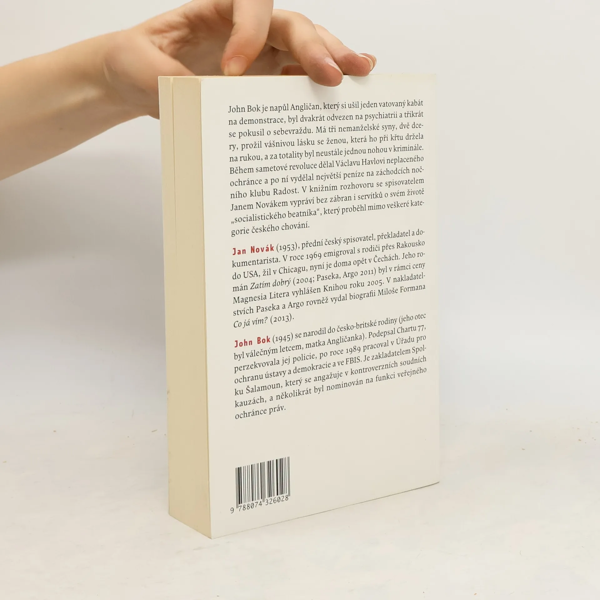 John Bok je napůl Angličan, který si ušil jeden vatovaný kabát na demonstrace, byl dvakrát odvezen na psychiatrii a třikrát se pokusil o sebevraždu. Má tři nemanželské syny, dvě dcery, prožil vášnivou lásku se ženou, která ho při křtu držela na rukou, a za totality byl neustále jednou nohou v kriminále. Během sametové revoluce dělal Václavu Havlovi neplaceného ochránce a po ní vydělal největší peníze na záchodcích nočního klubu Radost. V knižním rozhovoru se spisovatelem Janem Novákem vypráví bez zábran i servítků o svém životě "socialistického beatnika", který proběhl mimo veškeré kategorie českého chování. Jan Novák (1953) je přední český spisovatel, překladatel a dokumentarista. V roce 1969 emigroval s rodiči přes Rakousko do USA, žil v Chicagu, nyní je doma opět v Čechách. Jeho román Zatím dobrý (2004, Paseka, Argo 2011) byl v rámci ceny Magnesia Litera vyhlášen Knihou roku 2005. John Bok (1945) se narodil do česko-britské rodiny (jeho otec byl válečným letcem, matka Angličanka). Podepsal Chartu 77, byl perzekuován policií, po roce 1989 pracoval v Úřadu pro ochranu ústavy a demokracie a ve FBIS. Je zakladatelem Spolku Šalamoun, který se angažuje v kontroverzních soudních kauzách, a několikrát byl nominován na funkci veřejného ochránce práv.