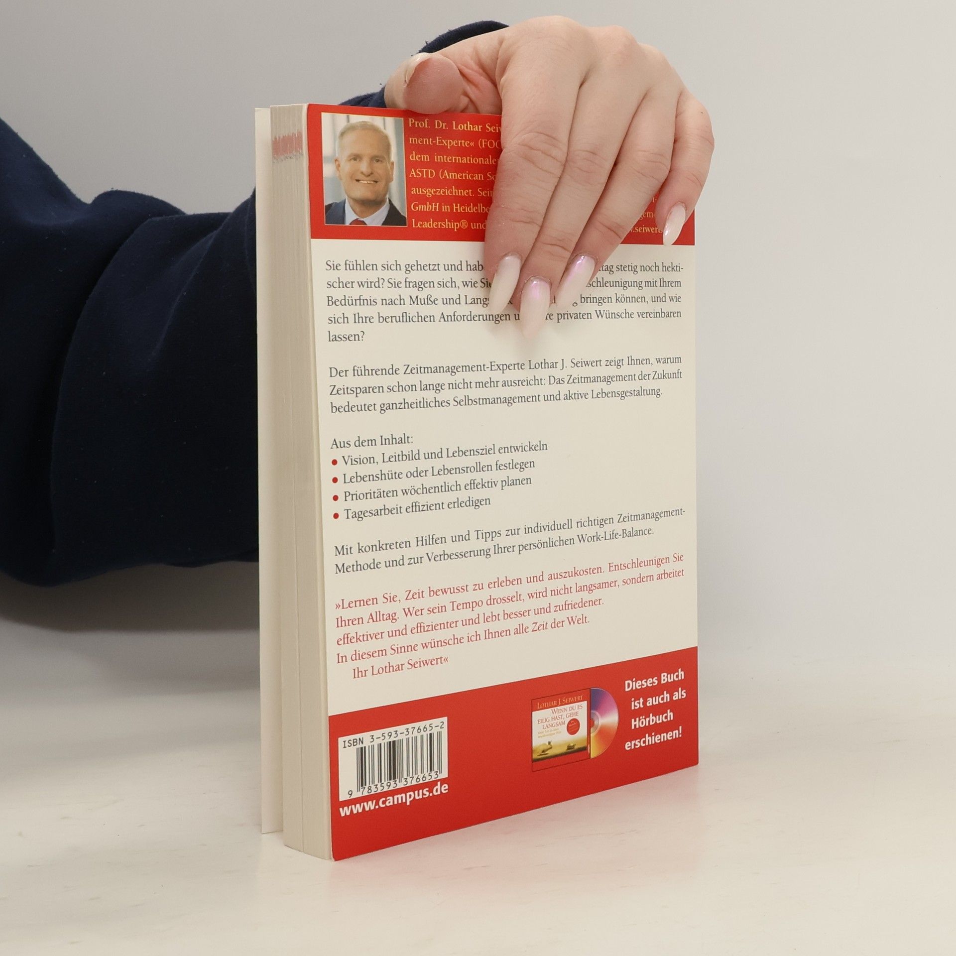 Seiwert macht seinen Lesern bewusst, dass unsere Lebenszeit das kostbarste Gut ist, das wir besitzen. In vier Schritten zeigt er, wie wir mit den richtigen Strategien unseren Alltag in den Griff bekommen und zu einer besseren Lebensgestaltung finden: 1. Die Lebensvision entwickeln 2. Die Lebensrollen definieren 3. Eine Prioritätenliste für jede Woche erstellen 4. Tägliche Aufgaben und Routinen im Griff Leben statt gelebt werden, jeden Tag proaktiv gestalten und sich gezielt mehr schöne Momente schaffen – in dem Bewusstsein »Heute ist der erste Tag vom Rest meines Lebens!«
