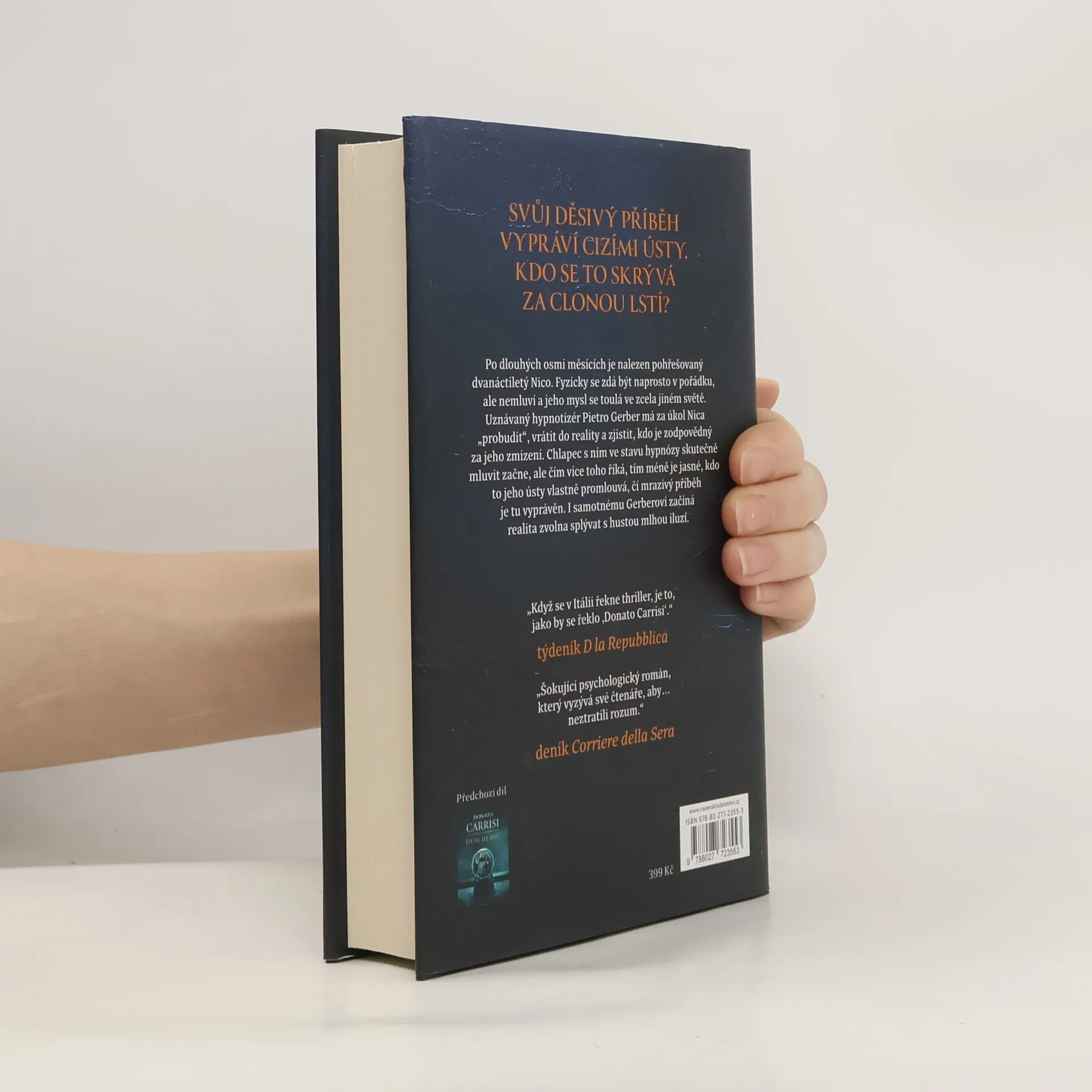 Psychologický thriller s detektivní zápletkou představuje druhý případ, na jehož šetření spolupracuje psycholog Pietro Gerber. Dvanáctiletý chlapec, který byl osm měsíců nezvěstný, se náhle objeví, a z jeho příběhu mrazí. V lese Pekelného údolí je nalezen zmizelý chlapec, když už v to nikdo nedoufal. Nicovi je dvanáct let a zdá se, že je v pořádku: někdo ho krmil, šatil, staral se o něj. Ale není možné zjistit, kdo to byl, protože Nico nemluví. Jeho vědomí je jako potemnělý dům, do něhož zdánlivě nelze proniknout. Jediný, kdo by ho dokázal probudit, je uspávač dětí. Pietro Gerber, nejlepší hypnotizér ve Florencii, je povolán, aby prozkoumal Nicovu mysl a zjistil, co se mu stalo. A jakkoli se to zdá nemožné, Gerber to zvládne. Podaří se mu odhalit spouštěč, který v Nicovi cosi uvede do chodu. Jenže když chlapcův hlas začne vyprávět příběh, Pietro Gerber pozná, že otevřel dveře zapomenutého pokoje. Chápe, že mu na záchranu Nica nezbývá moc času, a brzy se ocitne uvězněný ve spleti iluzí a lstí. Protože zhypnotizovaný hlas patří tomu chlapci. Ale příběh, který vypráví, je někoho jiného. Nakladatelská anotace.