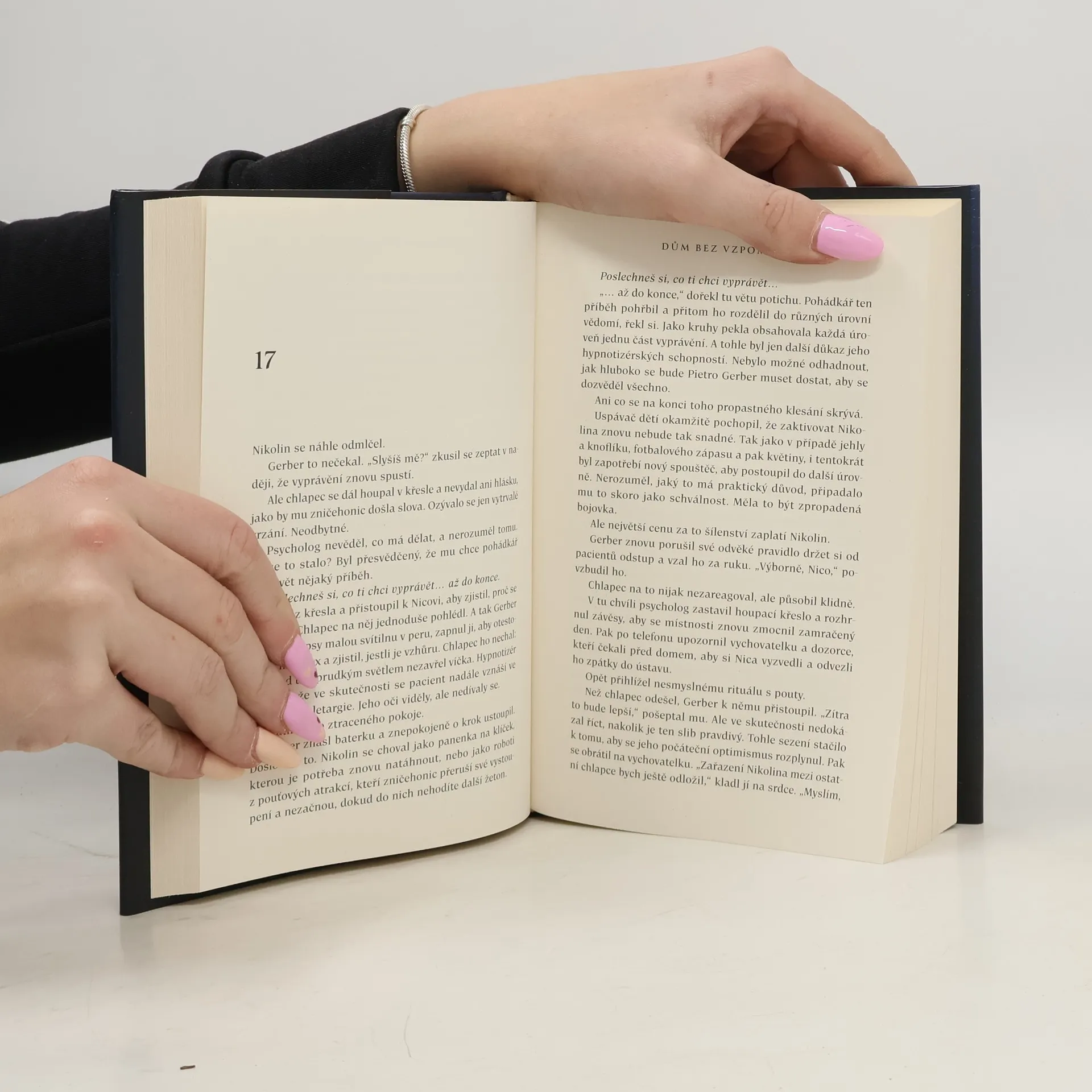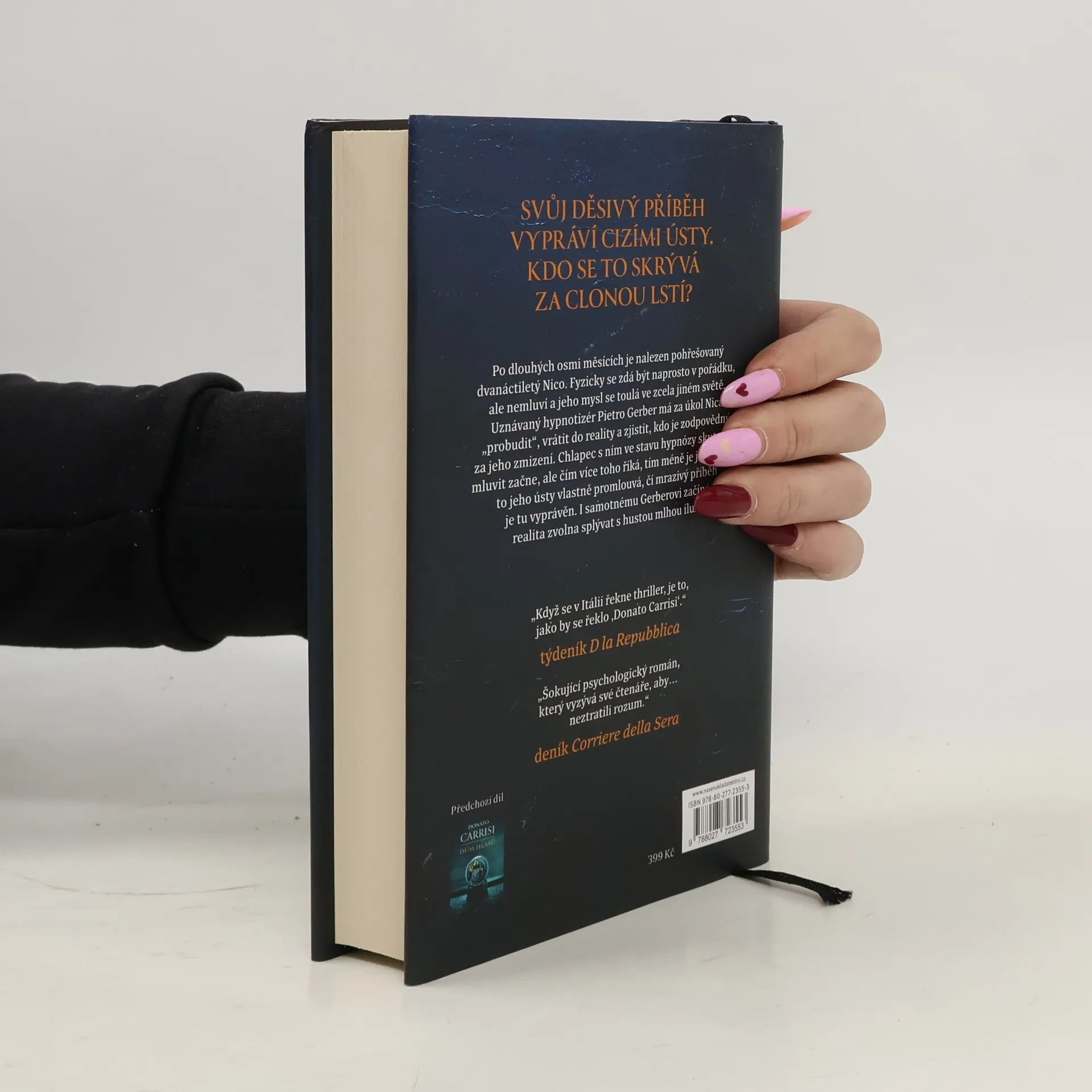 Psychologický thriller s detektivní zápletkou představuje druhý případ, na jehož šetření spolupracuje psycholog Pietro Gerber. Dvanáctiletý chlapec, který byl osm měsíců nezvěstný, se náhle objeví, a z jeho příběhu mrazí. V lese Pekelného údolí je nalezen zmizelý chlapec, když už v to nikdo nedoufal. Nicovi je dvanáct let a zdá se, že je v pořádku: někdo ho krmil, šatil, staral se o něj. Ale není možné zjistit, kdo to byl, protože Nico nemluví. Jeho vědomí je jako potemnělý dům, do něhož zdánlivě nelze proniknout. Jediný, kdo by ho dokázal probudit, je uspávač dětí. Pietro Gerber, nejlepší hypnotizér ve Florencii, je povolán, aby prozkoumal Nicovu mysl a zjistil, co se mu stalo. A jakkoli se to zdá nemožné, Gerber to zvládne. Podaří se mu odhalit spouštěč, který v Nicovi cosi uvede do chodu. Jenže když chlapcův hlas začne vyprávět příběh, Pietro Gerber pozná, že otevřel dveře zapomenutého pokoje. Chápe, že mu na záchranu Nica nezbývá moc času, a brzy se ocitne uvězněný ve spleti iluzí a lstí. Protože zhypnotizovaný hlas patří tomu chlapci. Ale příběh, který vypráví, je někoho jiného. Nakladatelská anotace.